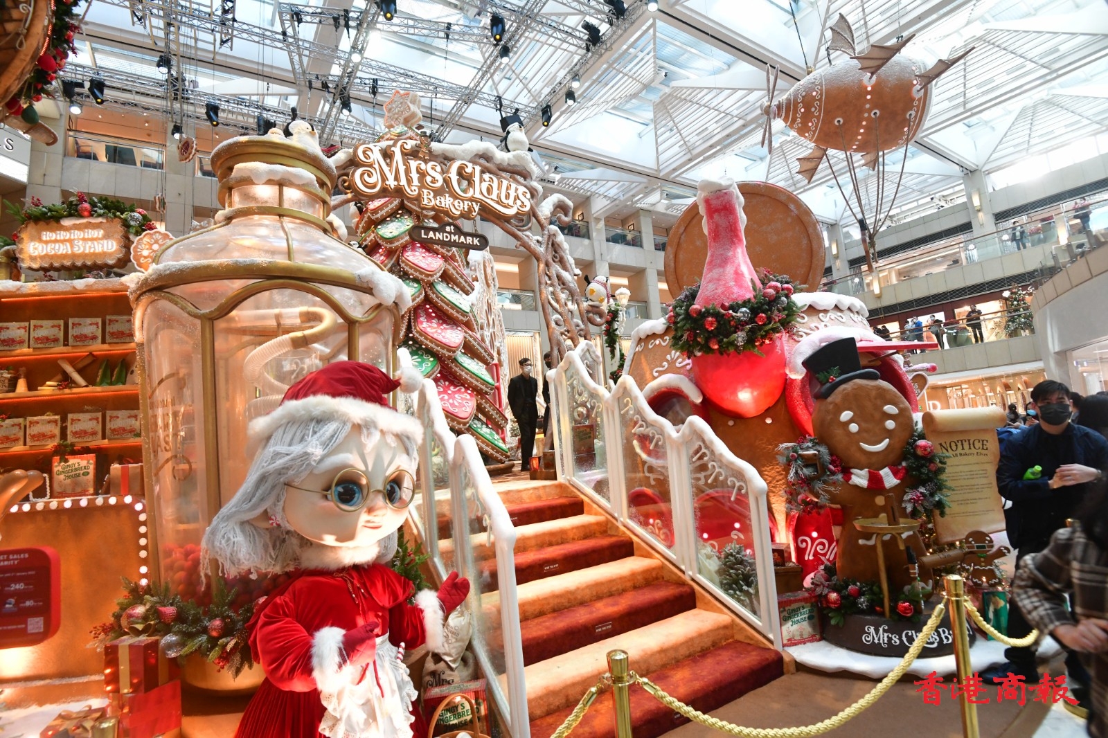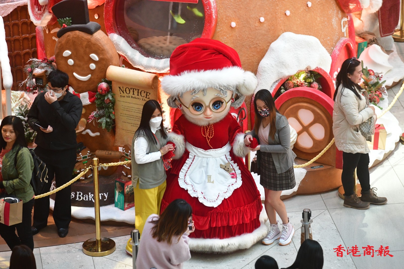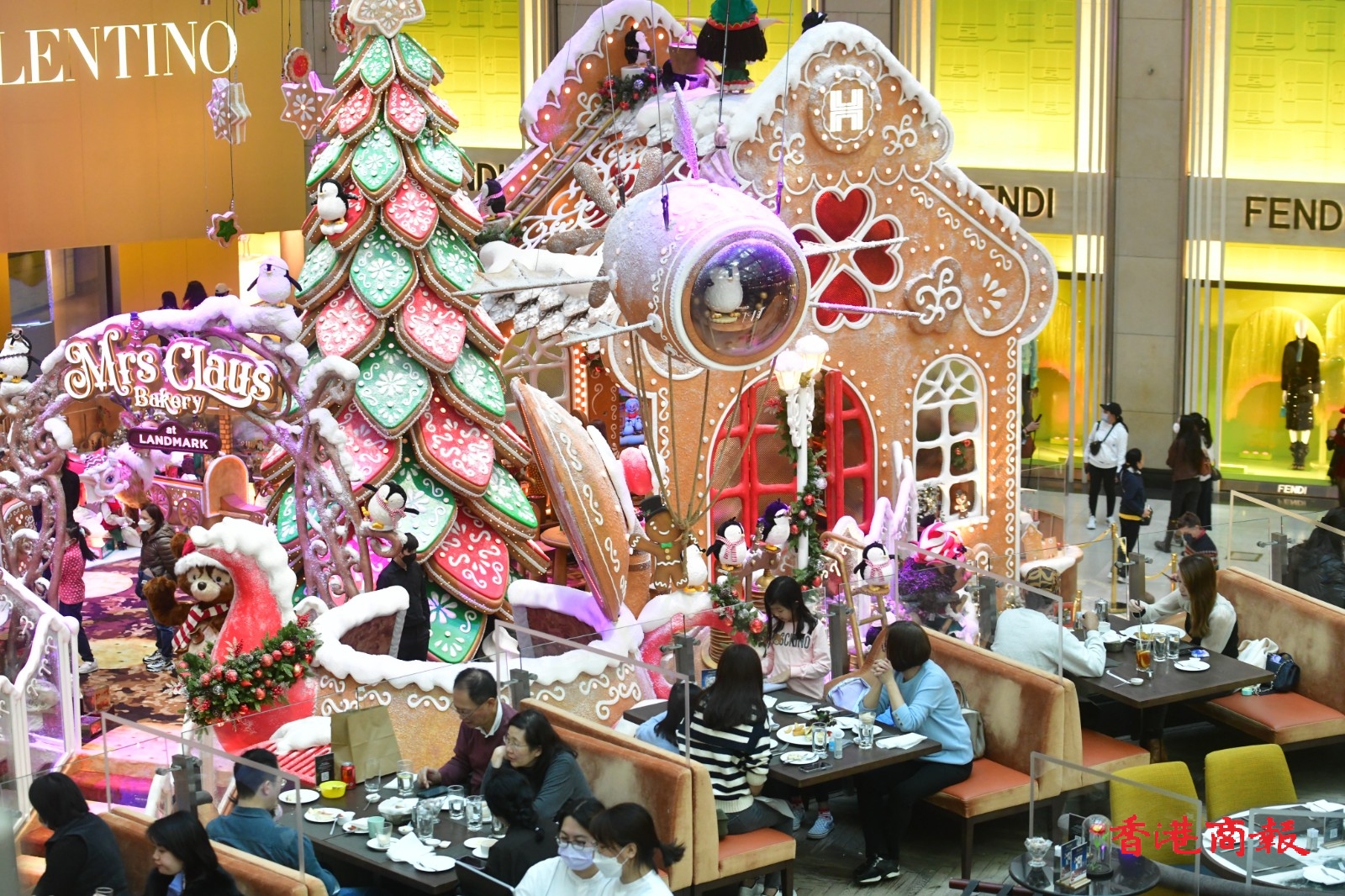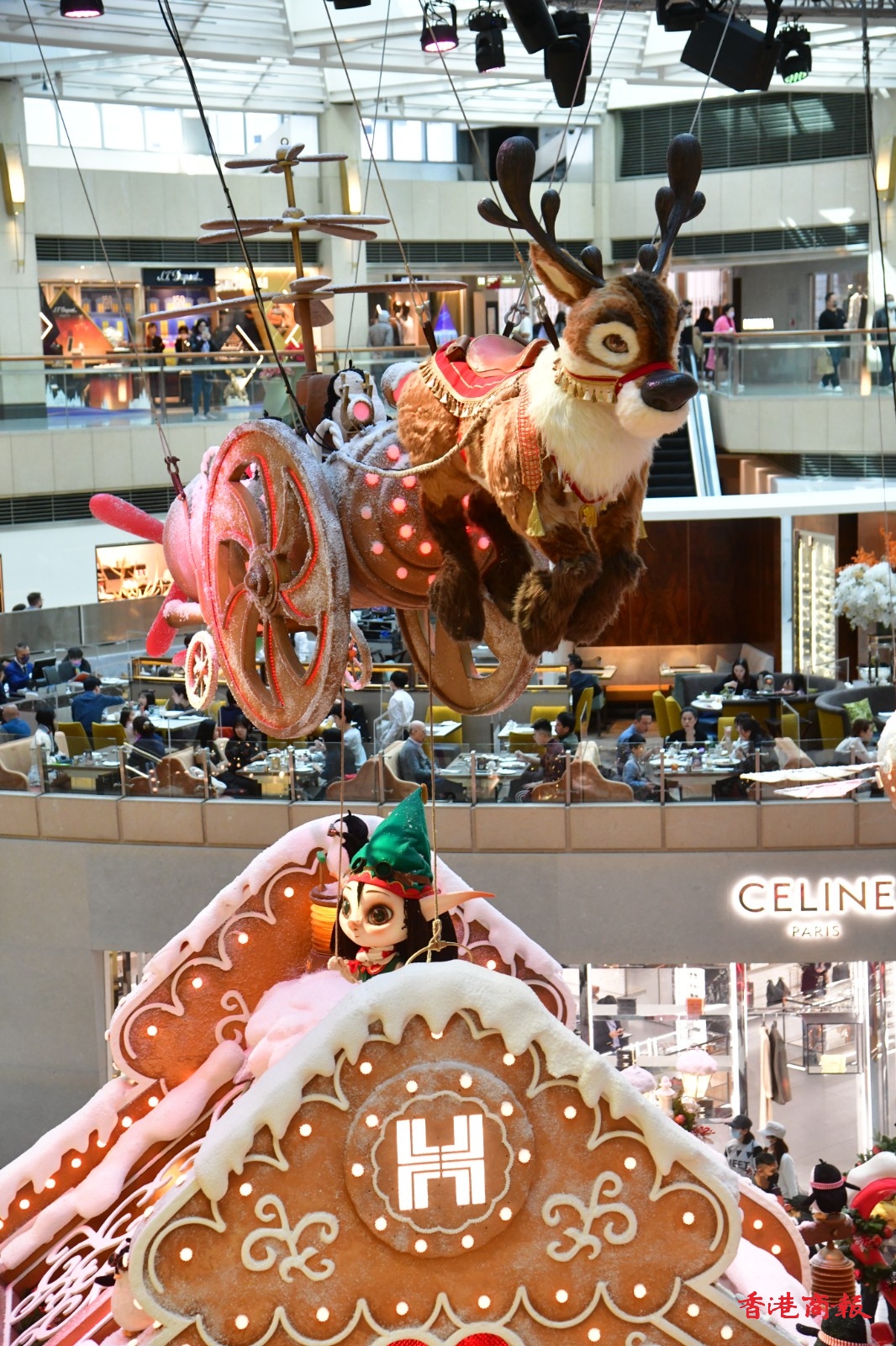 置地廣場中間放滿聖誕婆婆與精靈家族成員,除了薑餅人、企鵝、北極熊、馴鹿外,另有近80個聖誕助手分布於巨大薑餅屋內外;埸內設有多個景點,有茶壺大彈床、巨型曲奇聖誕樹,更有多個造型可愛的企鵝、薑餅人、熊仔等,在旋轉茶杯及曲奇蹺蹺板上跳上跳落,又或在火爐旁輕鬆一下,吸引一家大小度過一個「打卡」聖誕。(記者 崔俊良攝)