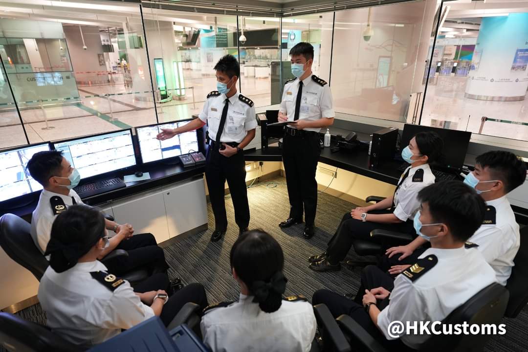 海關在社交網頁上載圖片,圖中西九高鐵口岸的海關人員正密鑼緊鼓地進行關務演練,檢查防疫裝備,校正清關設施,為通關做好準備。