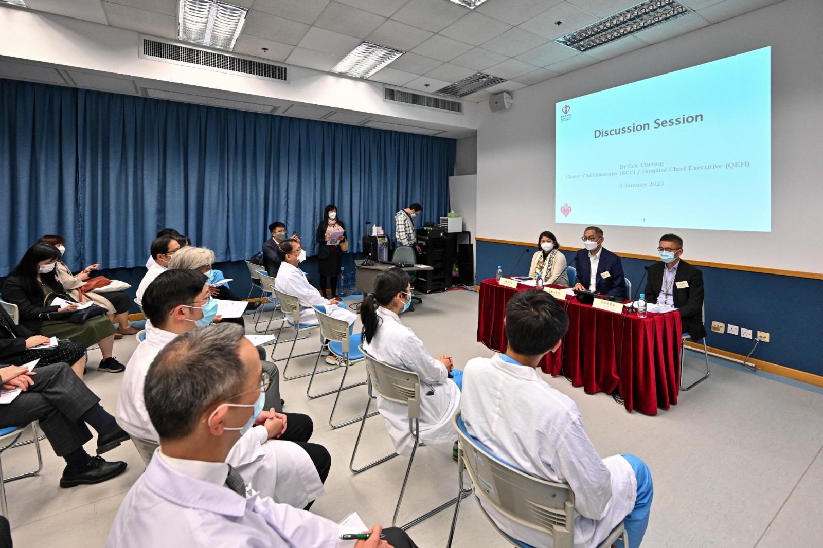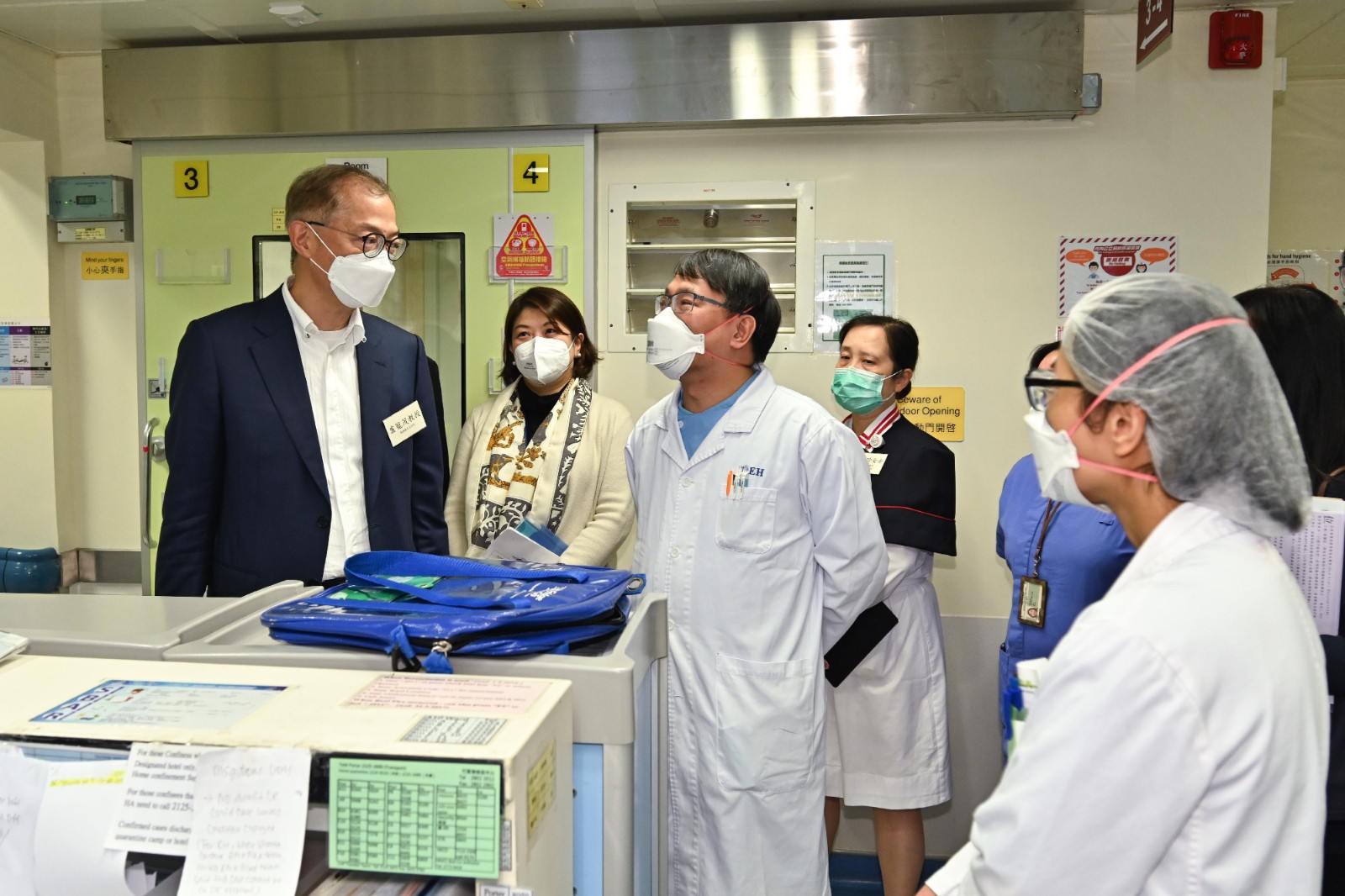 醫務衞生局局長盧寵茂今日(3日)視察伊利沙伯醫院,了解公立醫院在服務高峰期的運作情況,並感謝前線醫護人員的努力和付出。