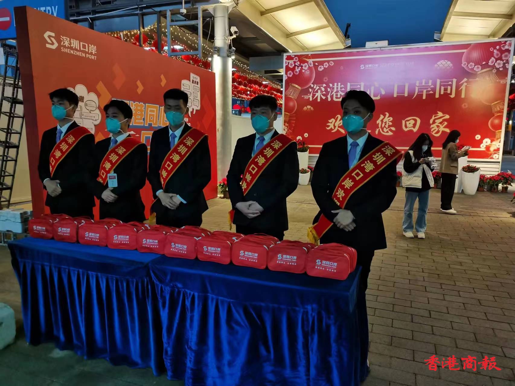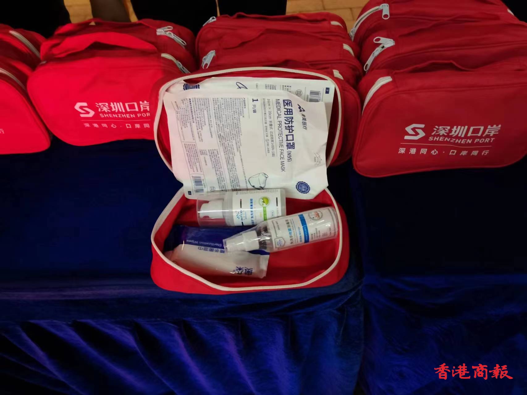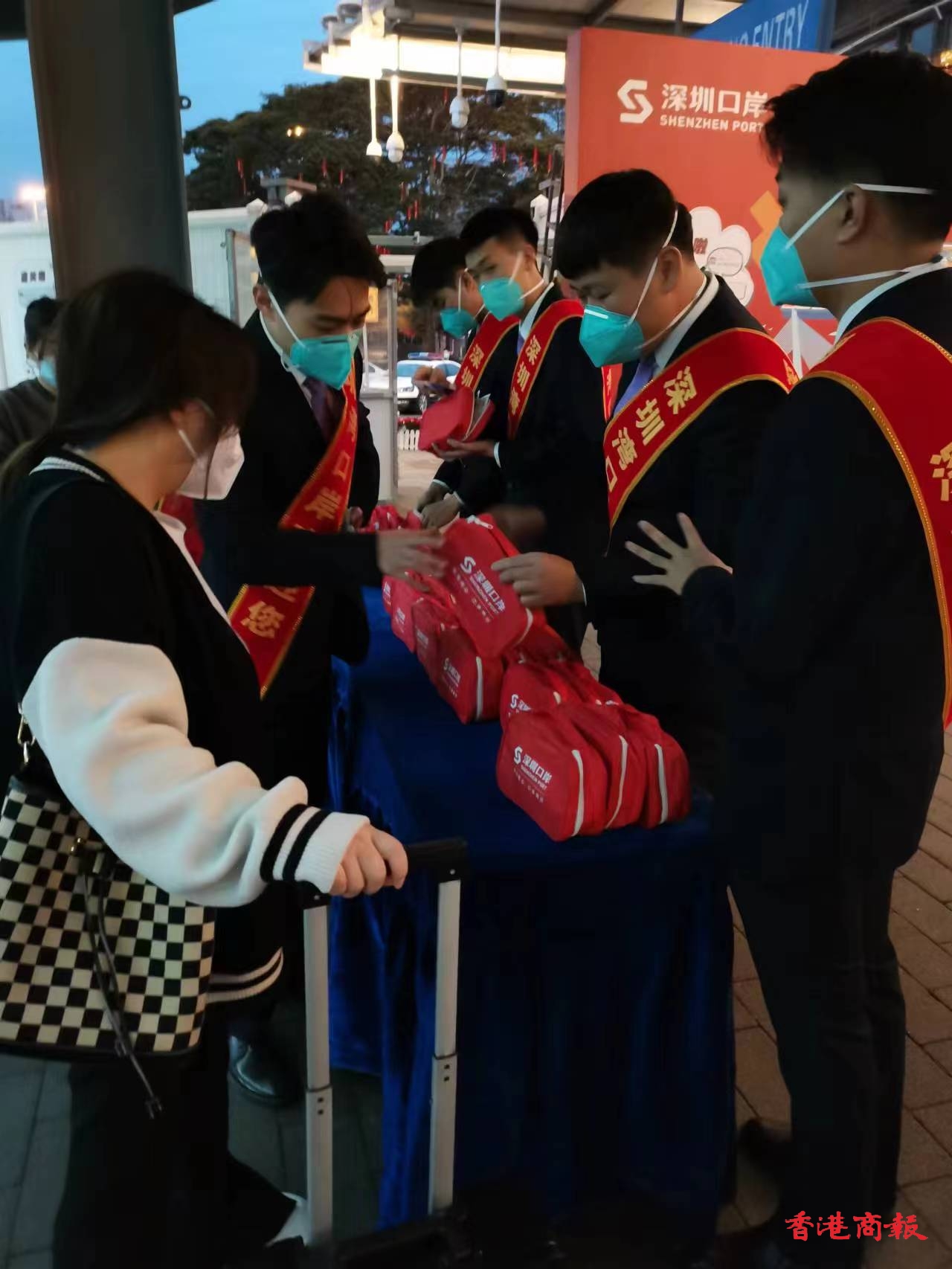 深圳灣口岸入境大廳門外,入境旅客同樣可以領取一份小禮物,包括口罩和酒精噴霧等防疫物資。(香港商報記者 賀爾達 楊穎婕)