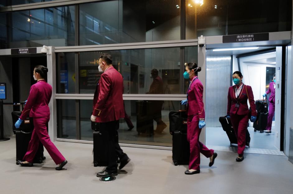 跟隨旅客一同走出來的還有當班的機組和乘務組。