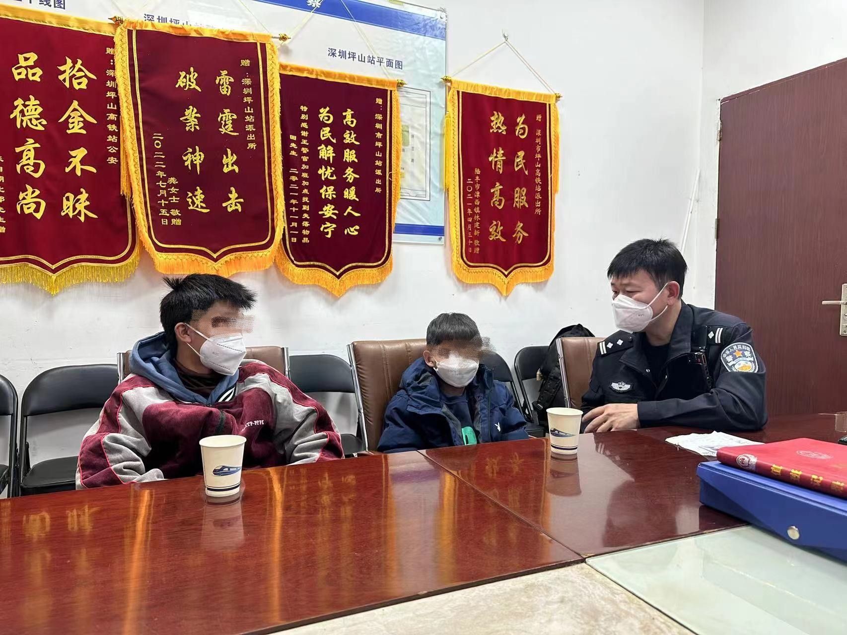 7日14時05分,深圳坪山站派出所民警接到G6339次列車長報警,稱在該趟列車上發現兩名離家出走的未成年男孩,請求民警幫助。在列車到達坪山站後,民警上車將兩個孩子安全接回到派出所。