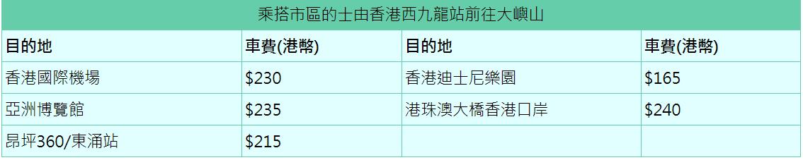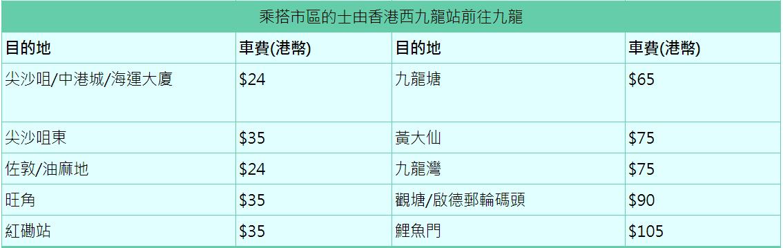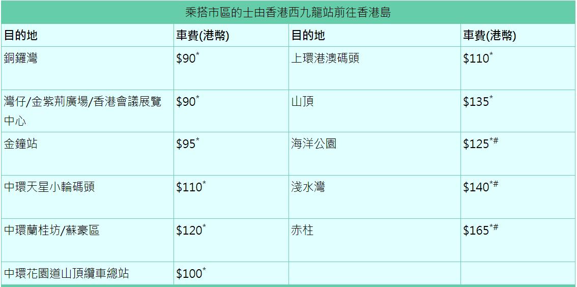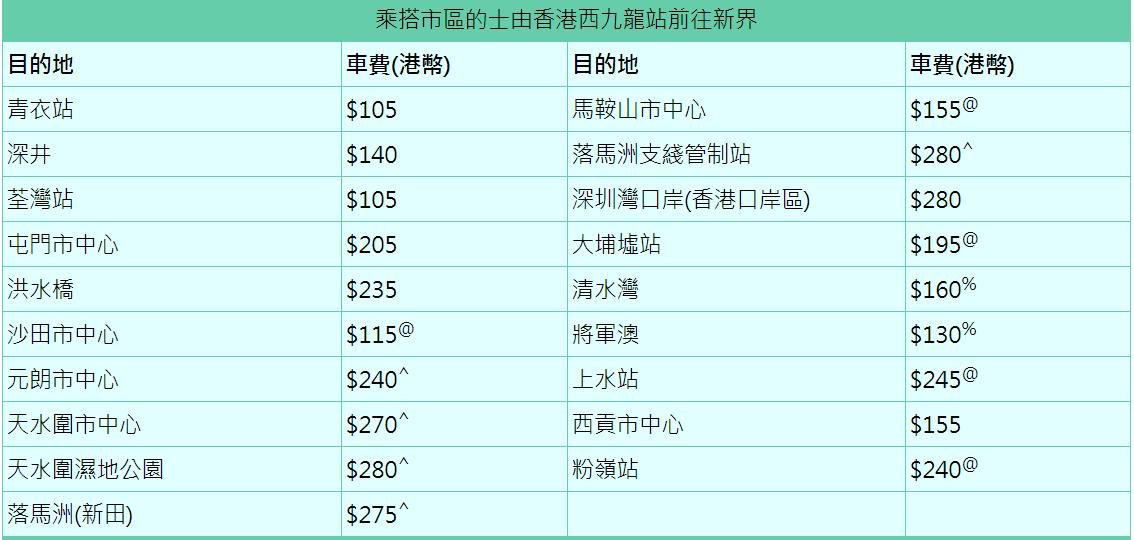 如需乘搭市區的士,可按指示標誌前往站內B2層的市區的士上客區候車,落客區則設於站內B1層。市區的士的收費表會展示在車廂內以便乘客查閱。以下收費表供參考↓