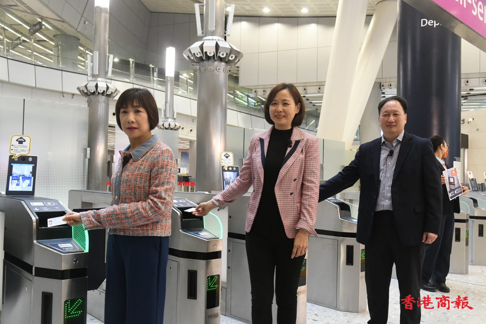 楊美珍形容重新投入的高鐵服務會令乘客跨境旅行更快、更方便、更輕鬆。港鐵在疫情期間引入電子車票,不再使用紙質車票,並安裝全新閘機,以及在車站大堂設置新的標示及布局。