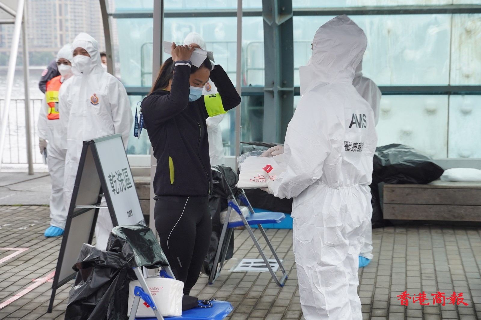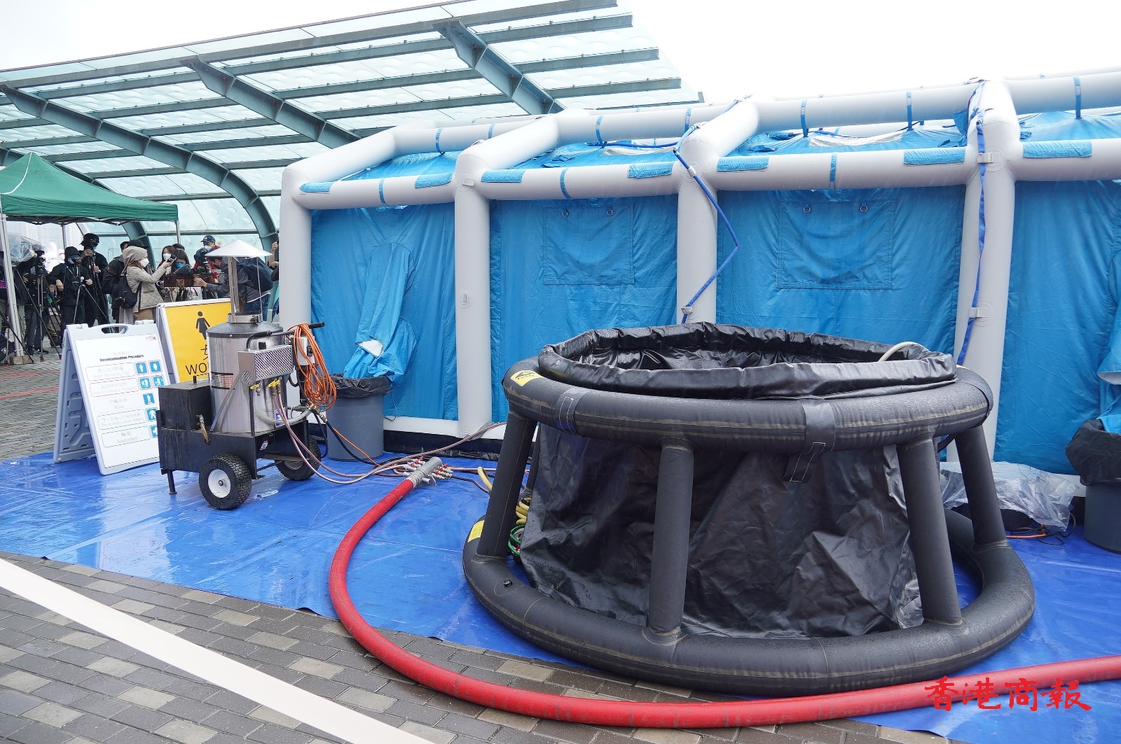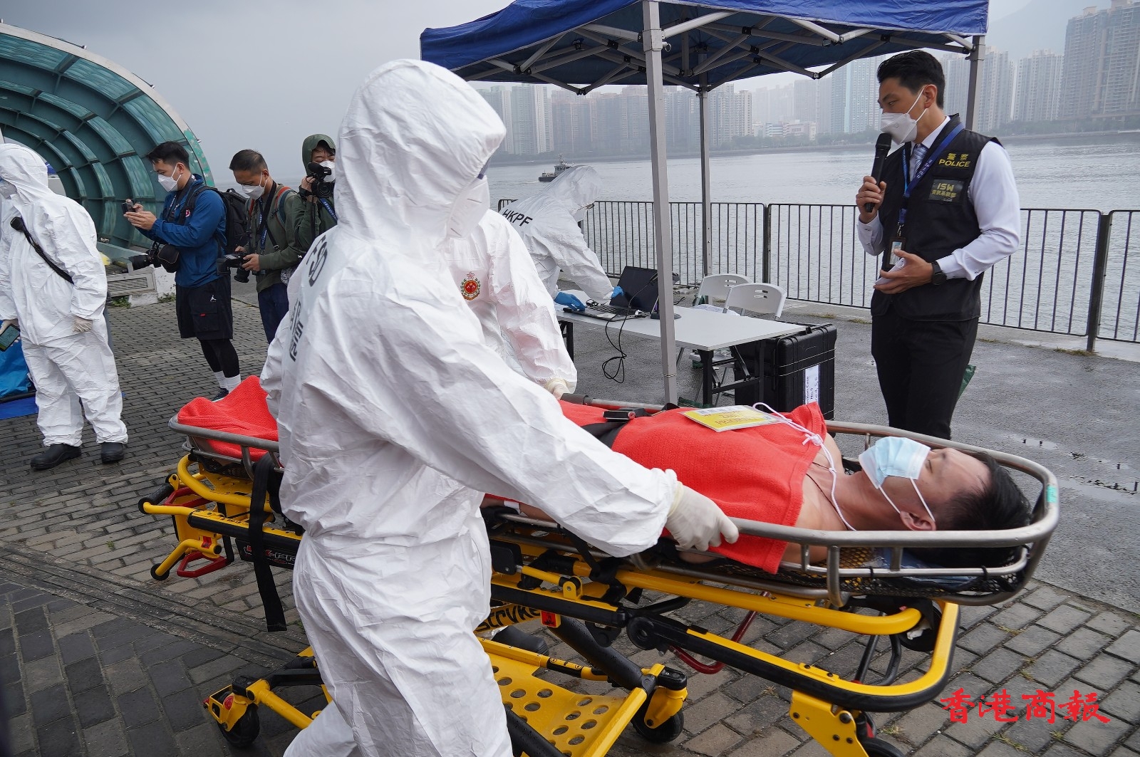 政府模擬大亞灣發生連串事故造成核輻射外洩,而處於大亞灣核電廠20公里內的東平洲,需要以水警輪及消防船撤離受影響人士到馬料水渡輪碼頭,接受輻射測檢的流程。記者 馮俊文攝