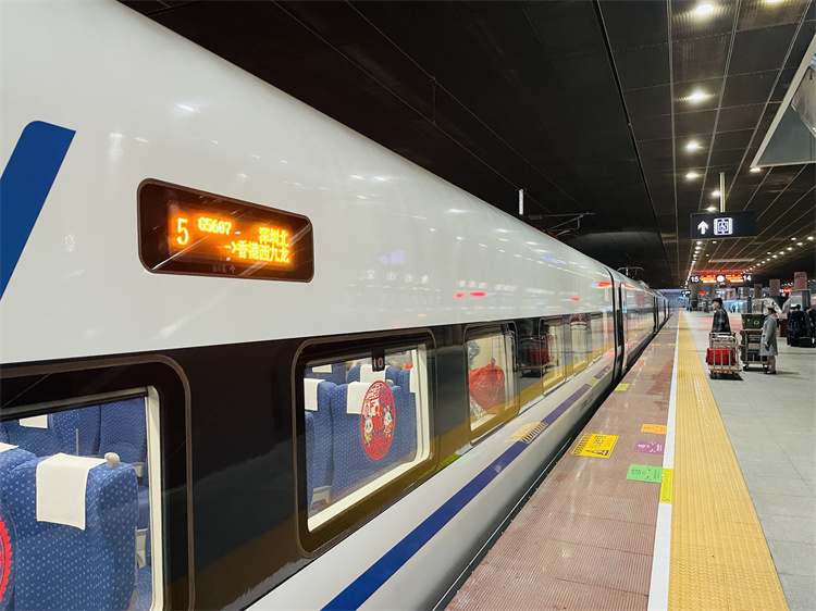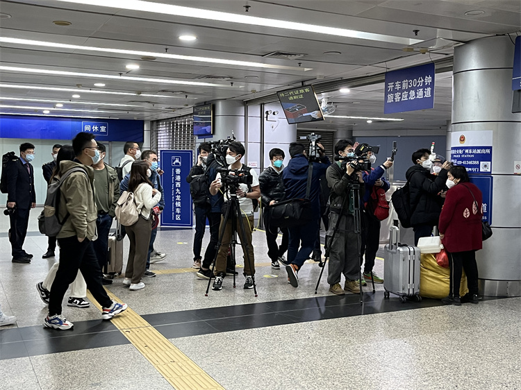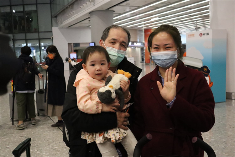 黃女士一家帶同女兒乘坐到深圳北的首班列車,再轉車到湛江,黃女士表示,這次是回去過年,見家人,小朋友快3歲了,都未見過公公婆婆,過去幾年只可以視頻見面,很高興外國又開通,香港又開通。她形容,現在心情激動,想快點見到家人。