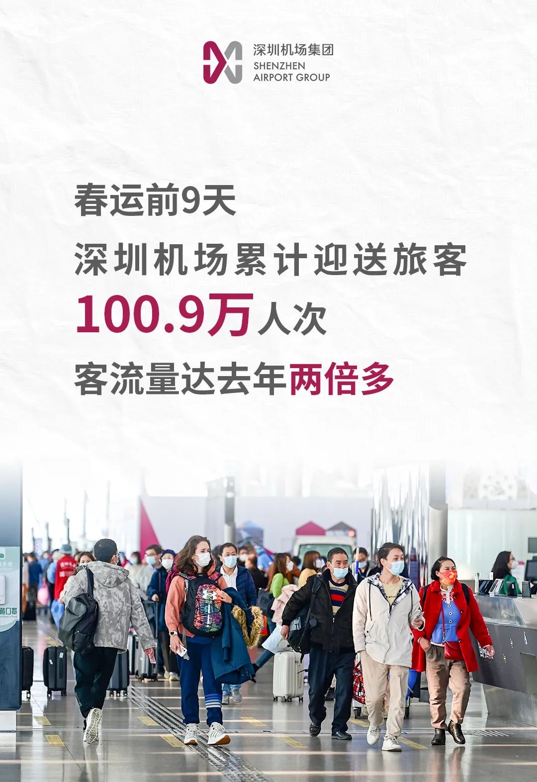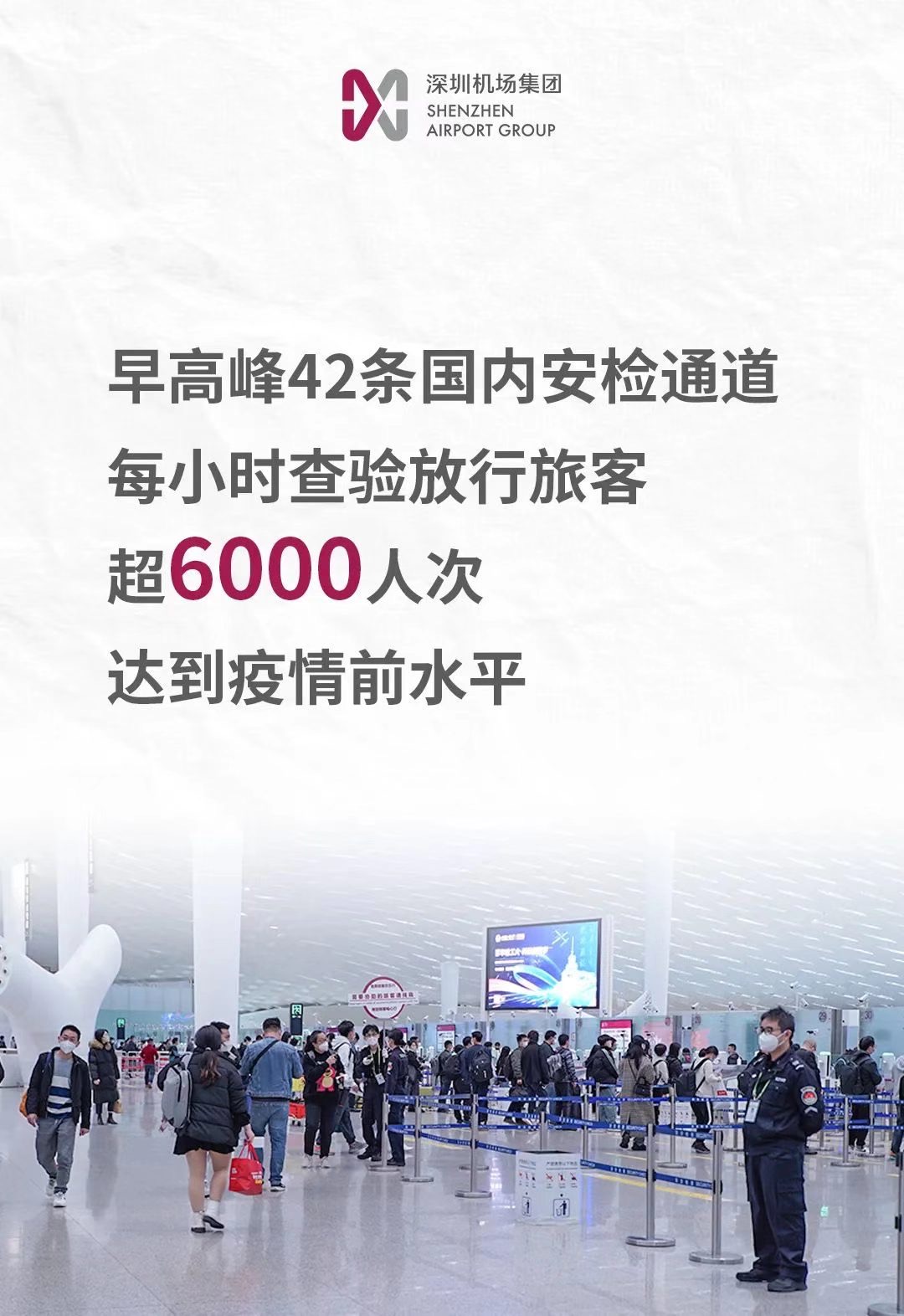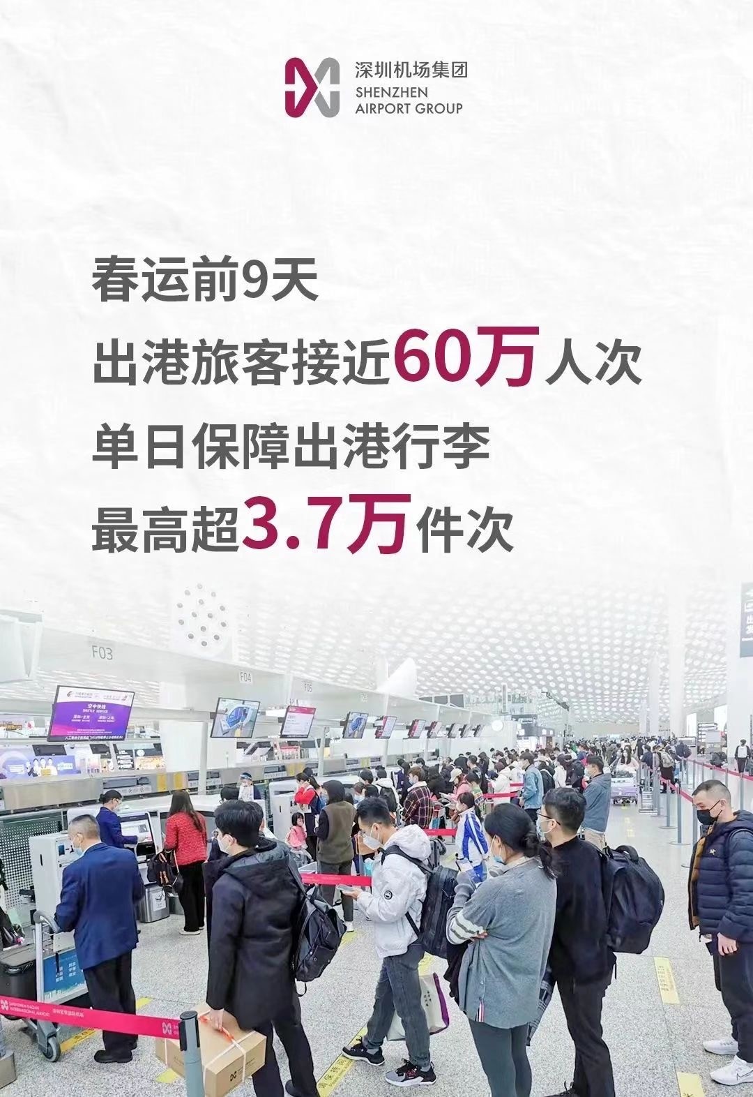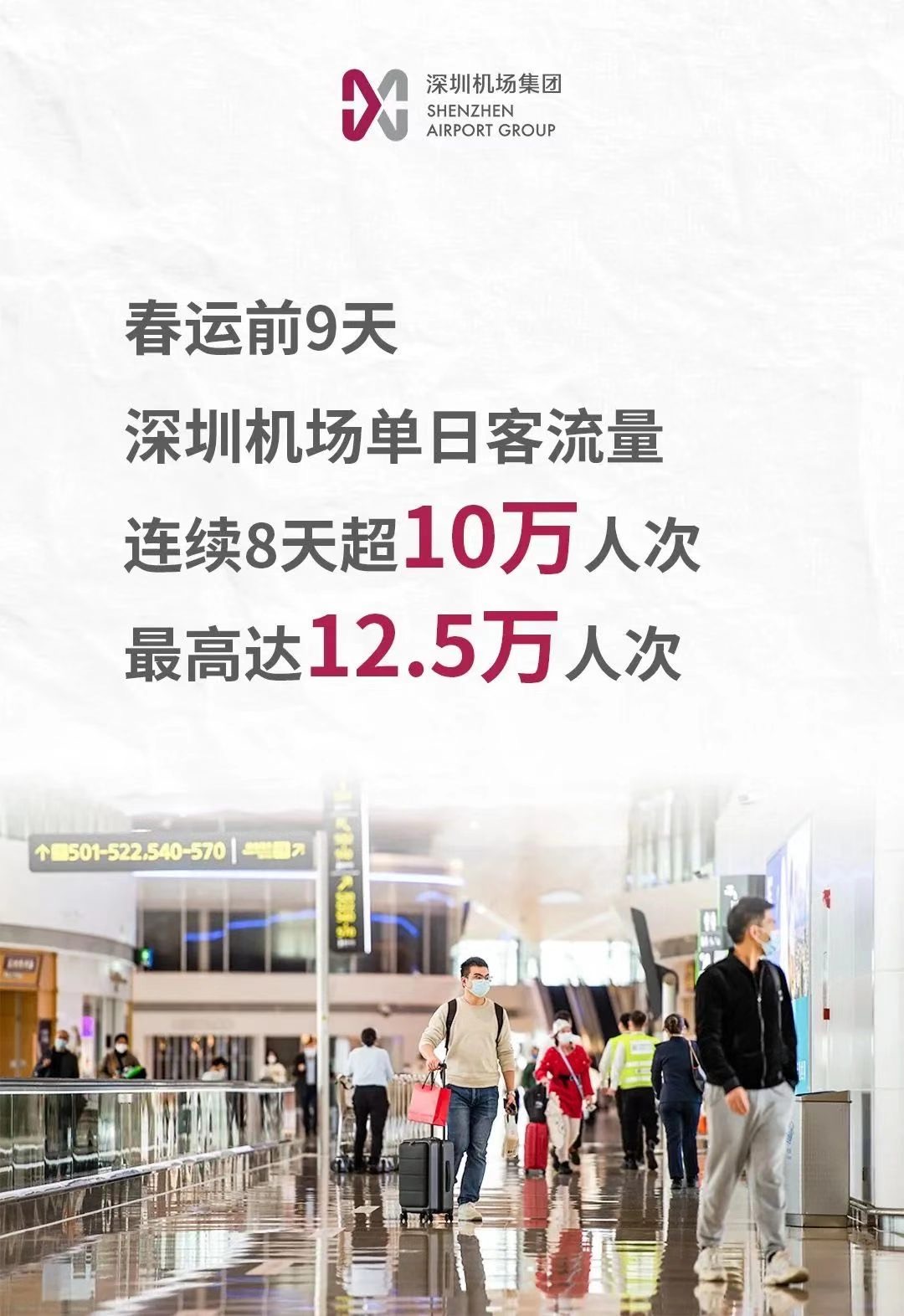 今年春運,深圳機場迎來近三年來最繁忙的一個春運,機場人氣快速回升。春運前9天(1月7日-1月15日),深圳機場累計迎送旅客量突破100萬人次大關!客流量是去年兩倍多。其中,單日客流量連續8天超10萬人次,單日最高達12.5萬人次。早高峰42條國內安檢通道,每小時查驗放行旅客超6000人次,達到疫情前水平。(記者 林麗青)
