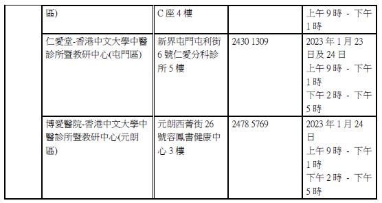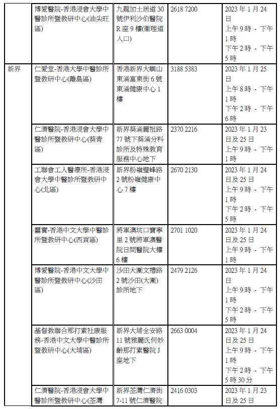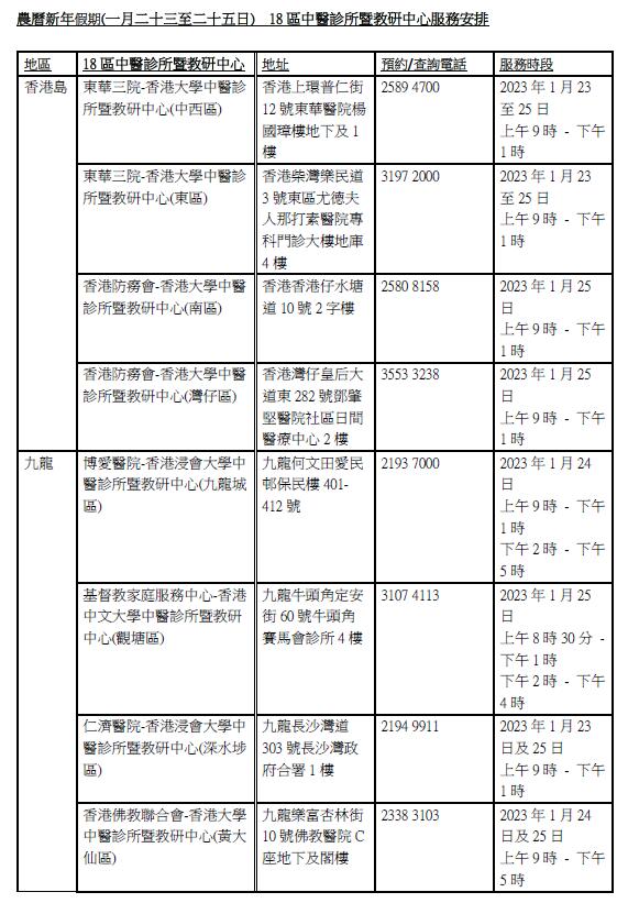 另外,18區中醫診所暨教研中心(中醫診所)亦會於農曆新年公眾假期提供內科診療(不包括針灸、骨傷推拿及新冠復康診療),求診人士可如平日般透過電話或「18區中醫診所」流動應用程式(適用於曾登記使用18區中醫診所服務的求診人士)預約診症時間。應診的中醫診所名單及服務時間詳見下圖,市民亦可瀏覽以下連結獲取有關中醫服務的最新資訊:cmk.ha.org.hk/zh-cht/services/notice/ChineseNewYearHoliday。