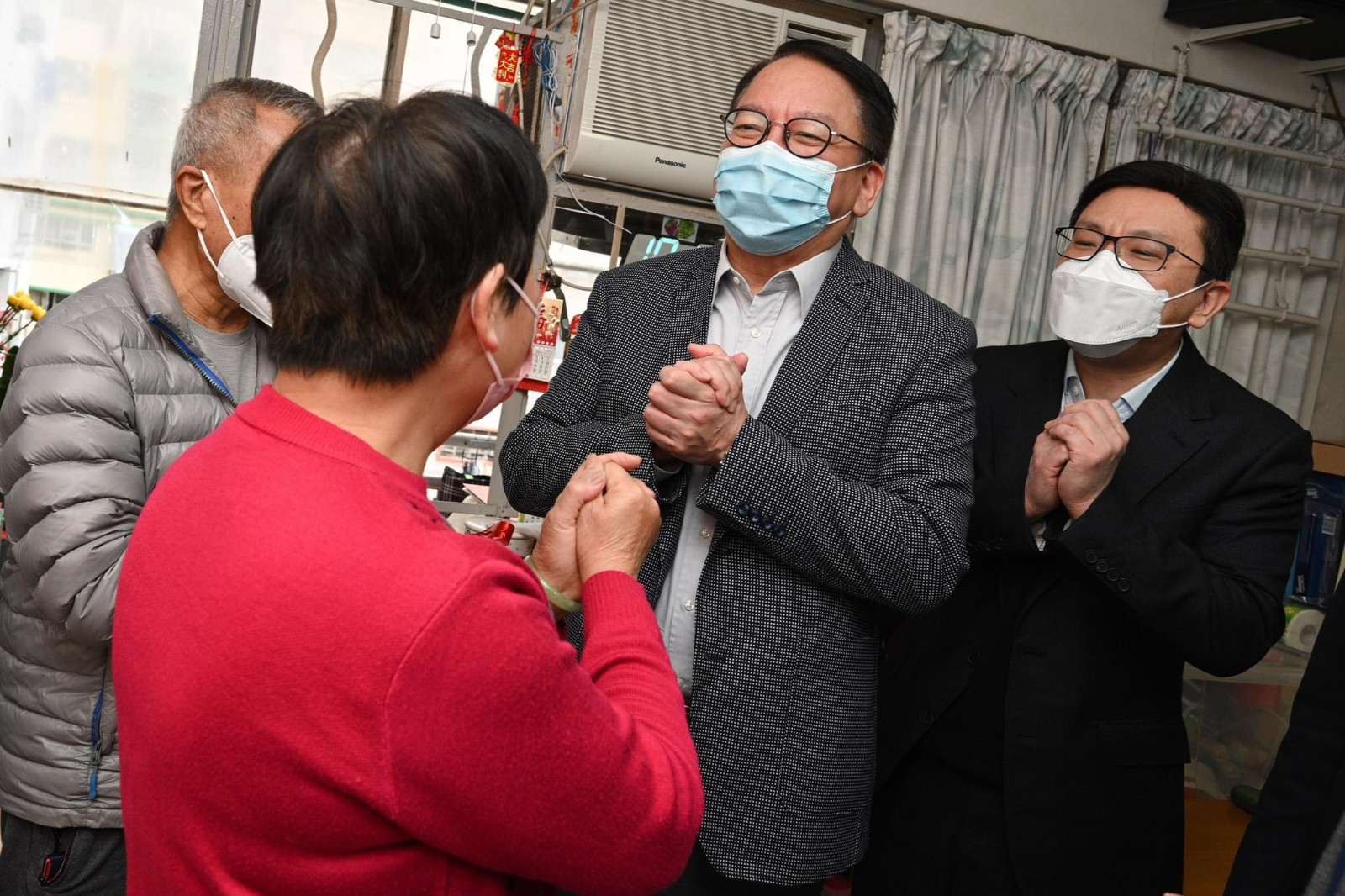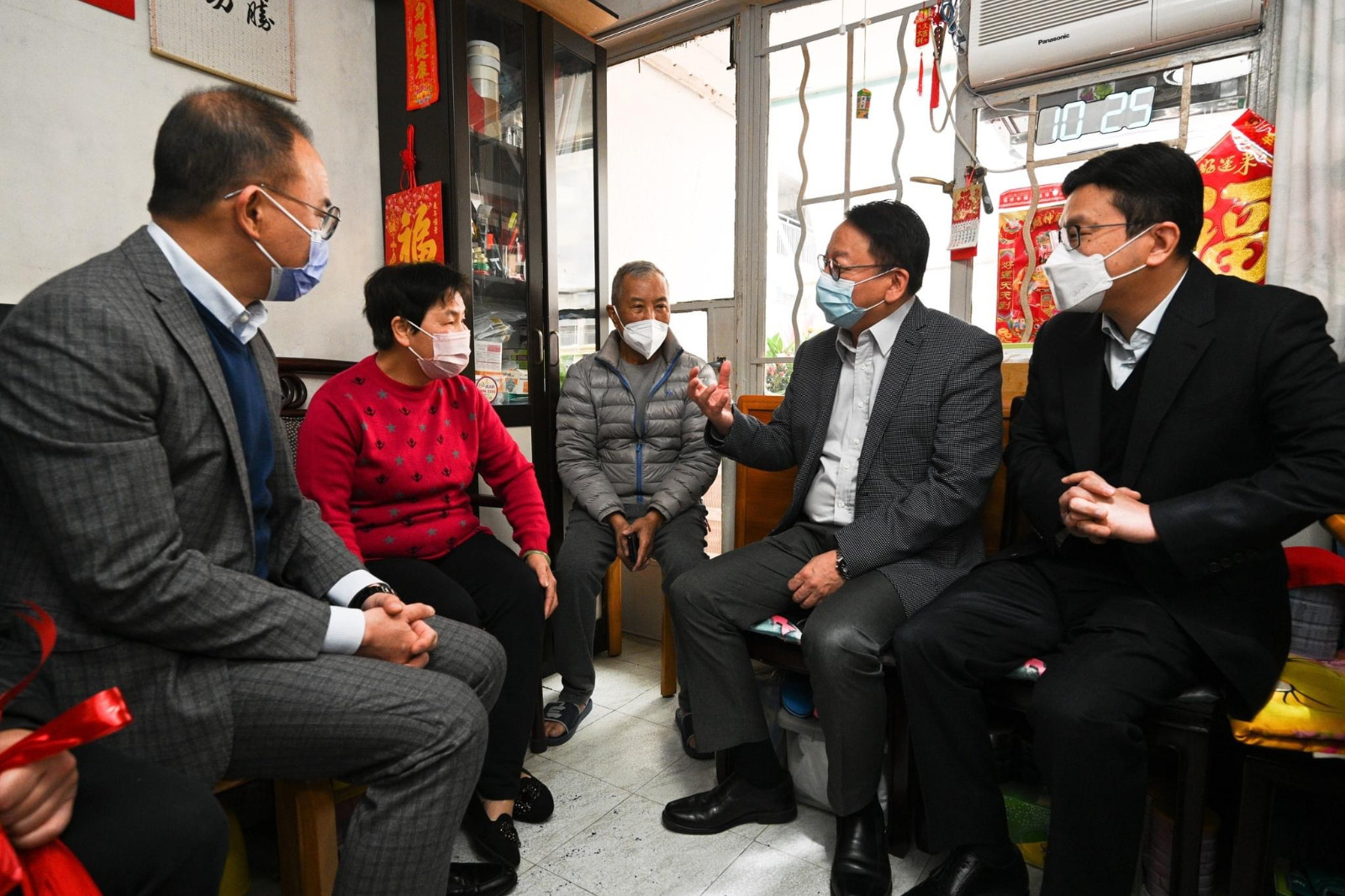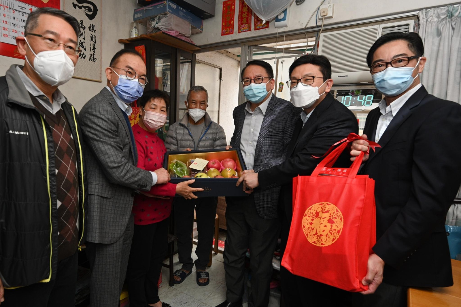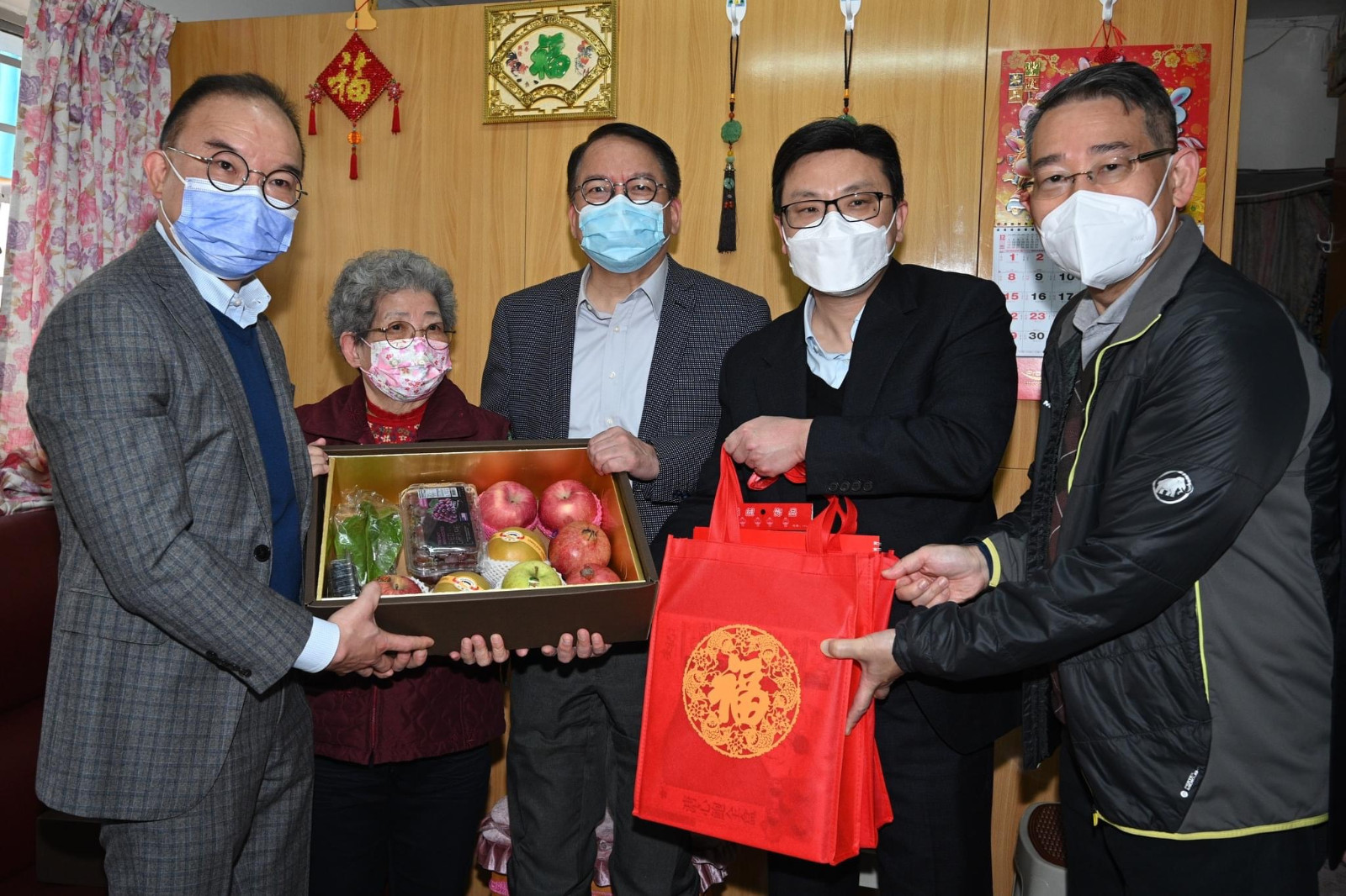 今日是年三十,政務司司長陳國基聯同政務司副司長卓永興及其他局長前往東區,分開幾支小隊探訪不同基層朋友,送上新春祝福和賀年禮物。陳國基聯同政制及內地事務局局長曾國衞和勞工及福利局局長孫玉菡,到健康村第三期探訪了兩戶老友記,分別是萍姐和黃生黃太。