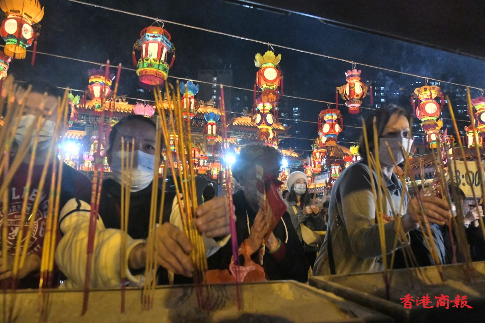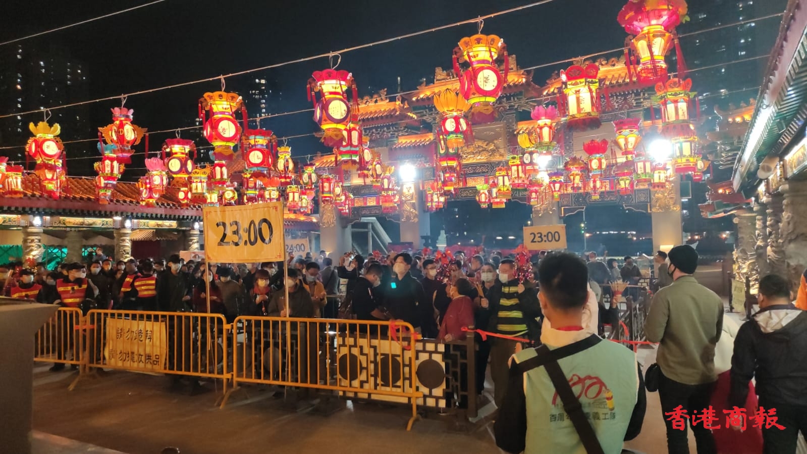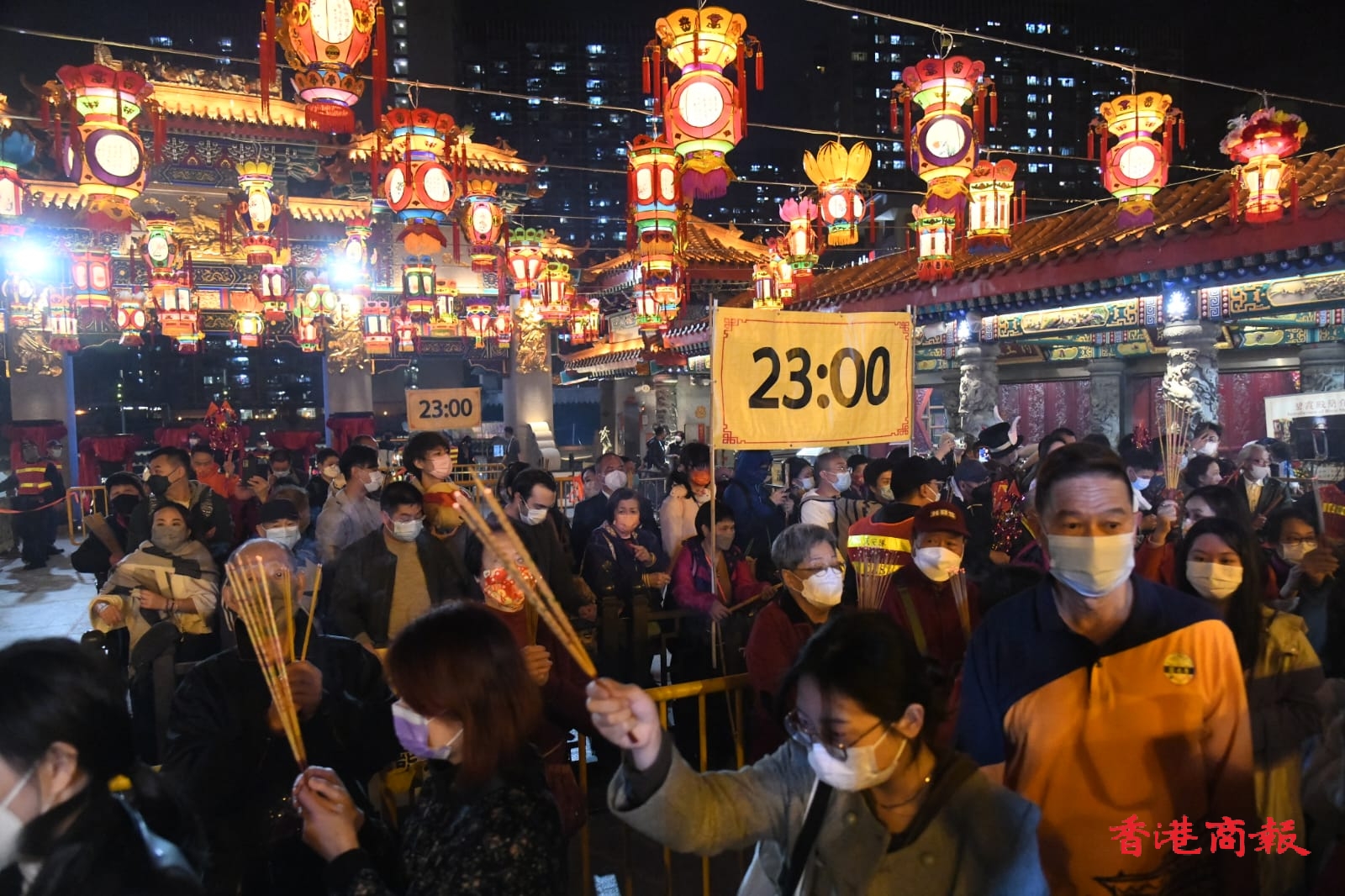 因應疫情而暫停兩年的黃大仙廟頭炷香活動,今年年三十晩正式復辦,晚上8時許,已有善信在廟外排起人龍。到晚上9時黃大仙廟開始分批讓善信參拜。頭注香將在子時(晚上11時)開始,另一次頭注香則在凌晨12點。
