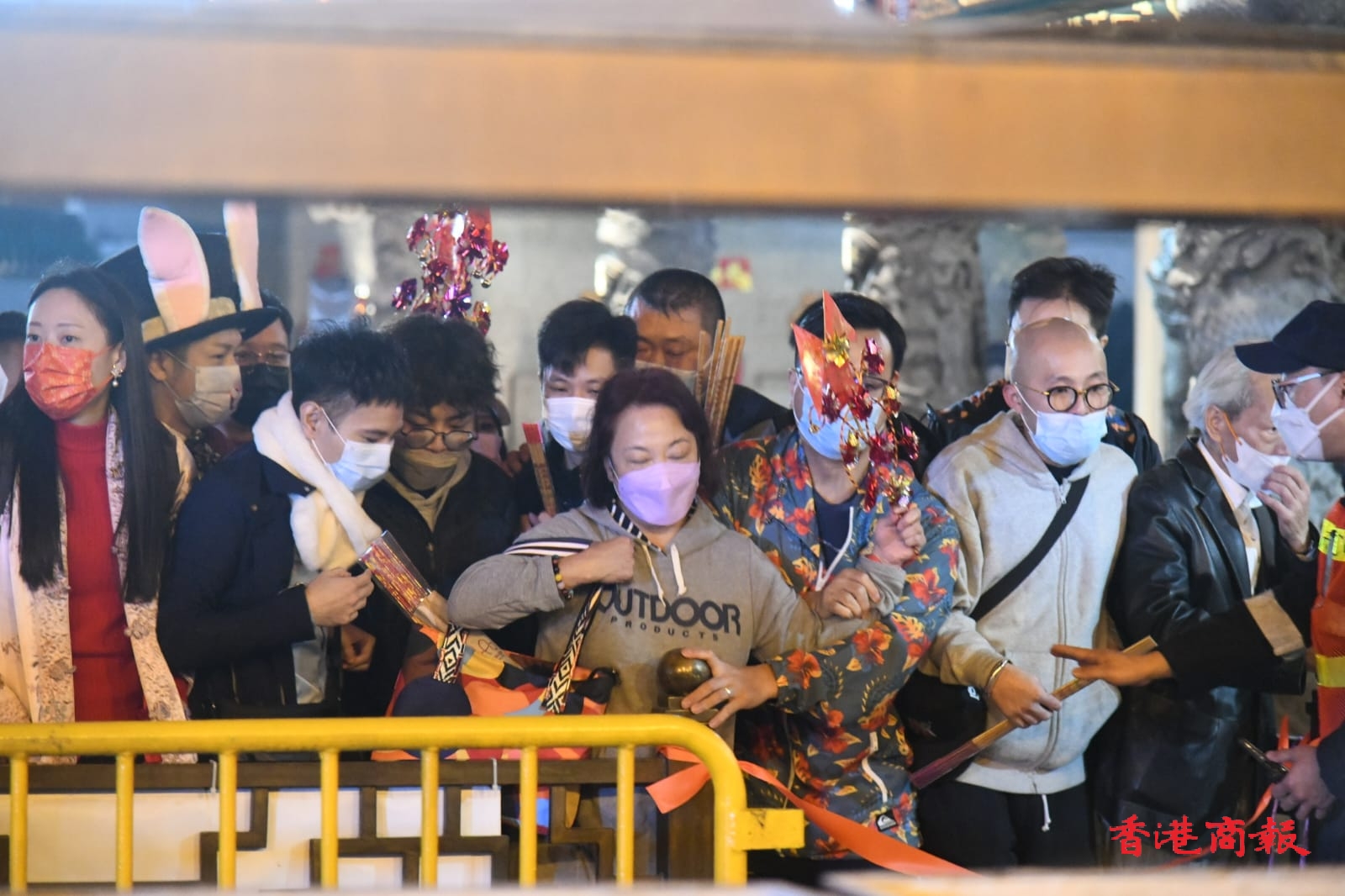 時間來到子時(晚上11時),現場已有超過100名市民。廟內鐘聲響起,首批市民上頭注香,誠心許願。人群中包括以往頭注香「常客」黃夏惠世姪女。