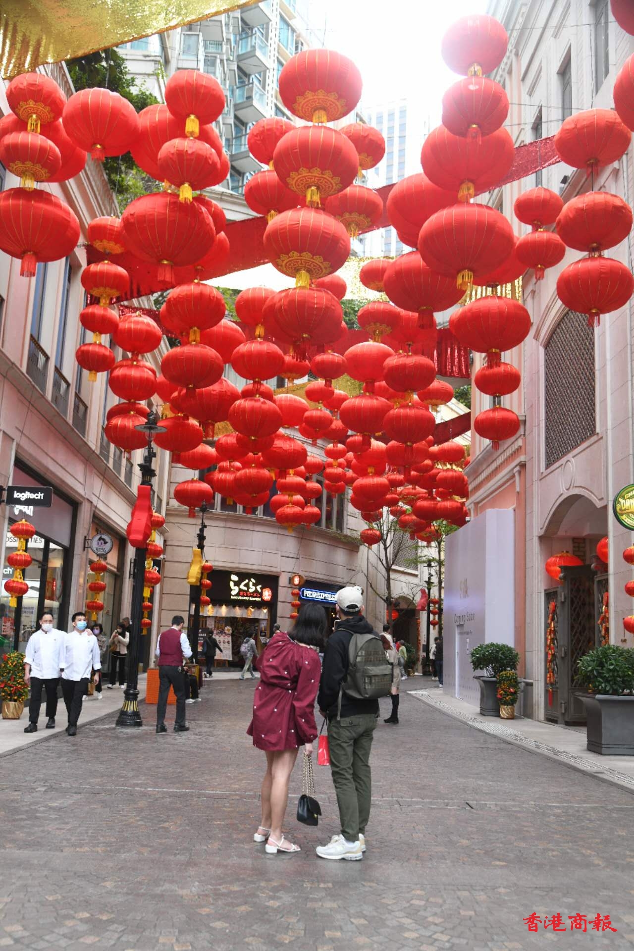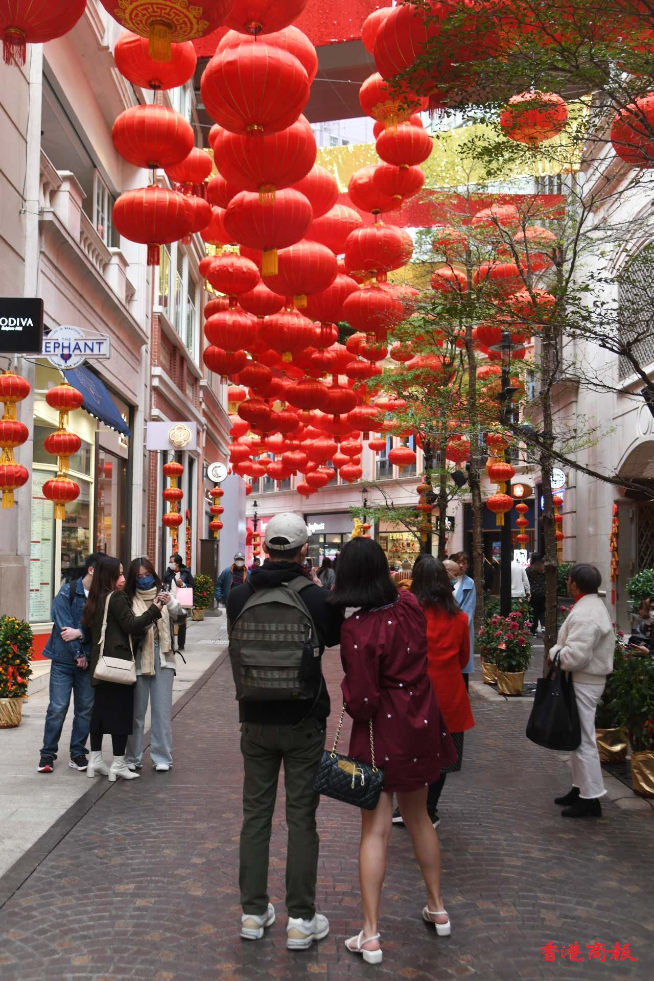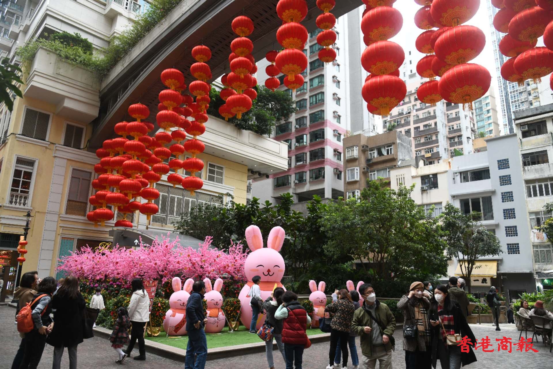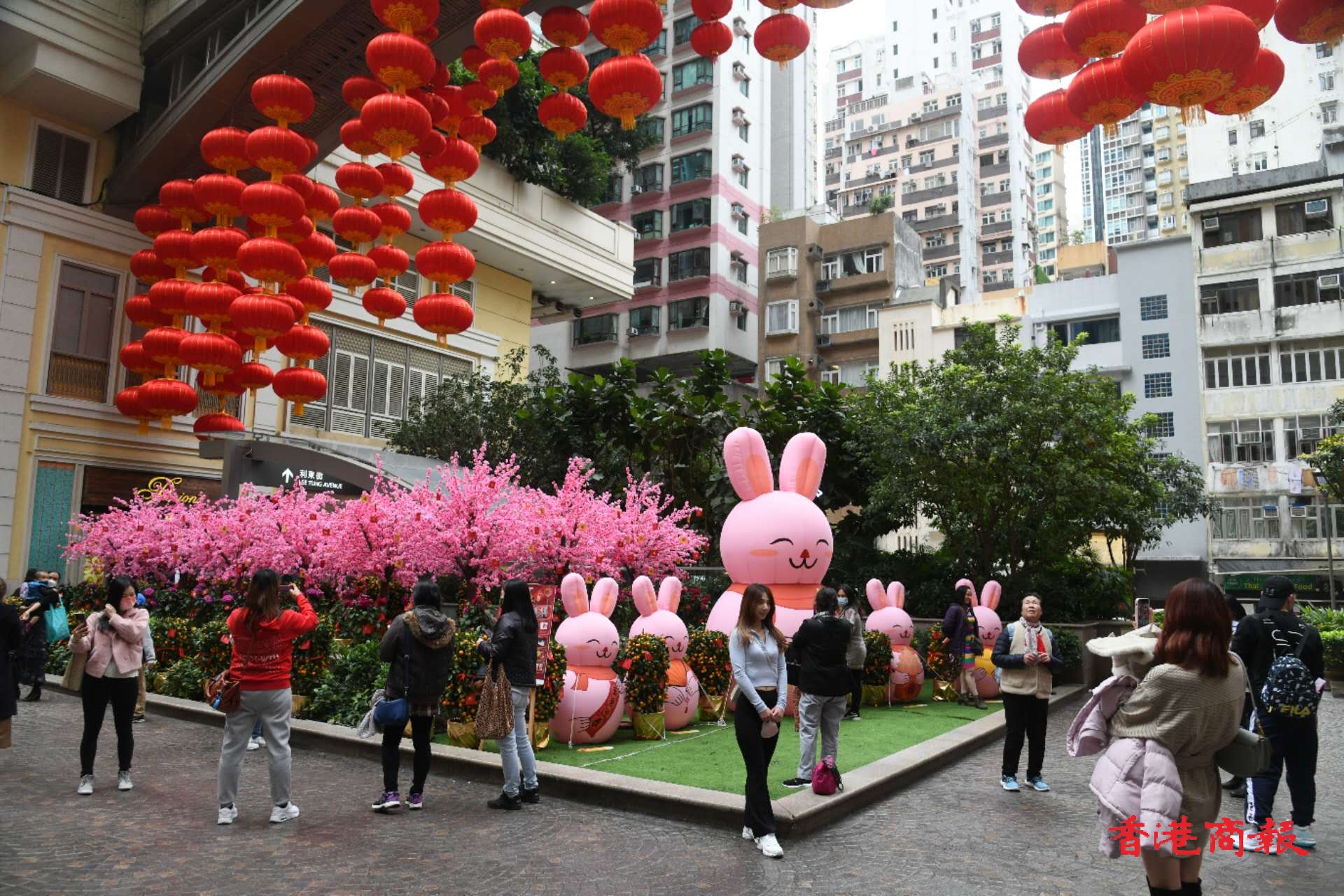 農曆新年期間灣仔利東街以「花燈‧彩兔賀新歲」為主題打造新春步行街,200米長的林蔭大道上空懸掛688個大紅燈籠,添上金、紅亮片裝飾,寓意闔家團圓、百業興旺。除此之外,街上的燈柱繫上彩兔裝飾,中庭廣場中央更設有玉兔燈光裝置,假期時間吸引大批市民及遊客到來拍照打咭。(蔡啟文攝)