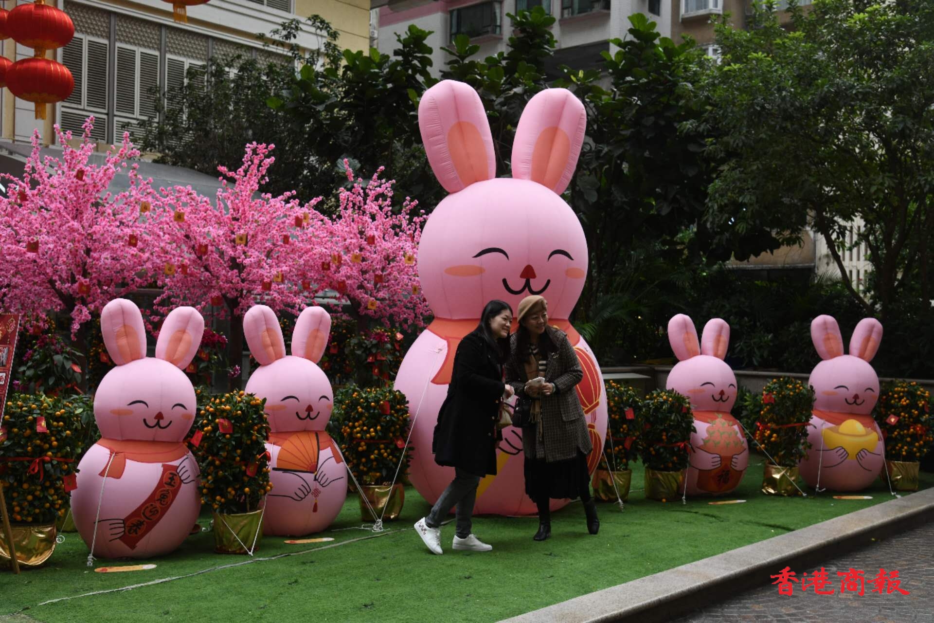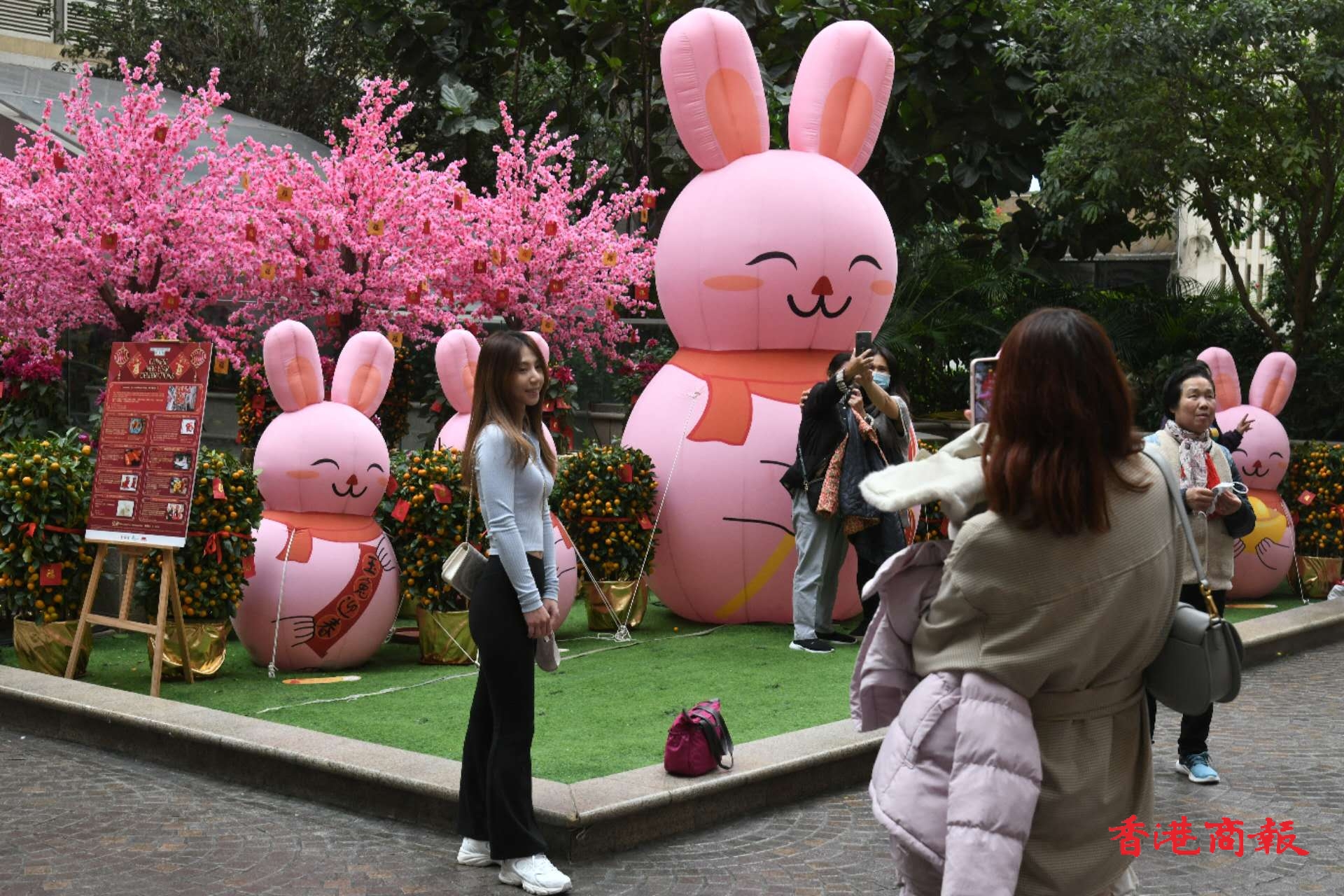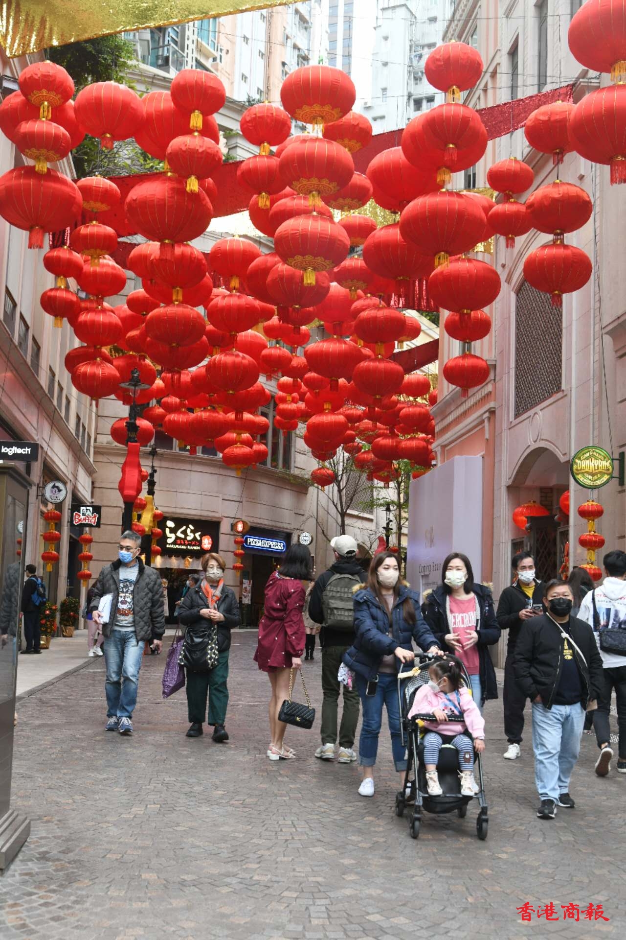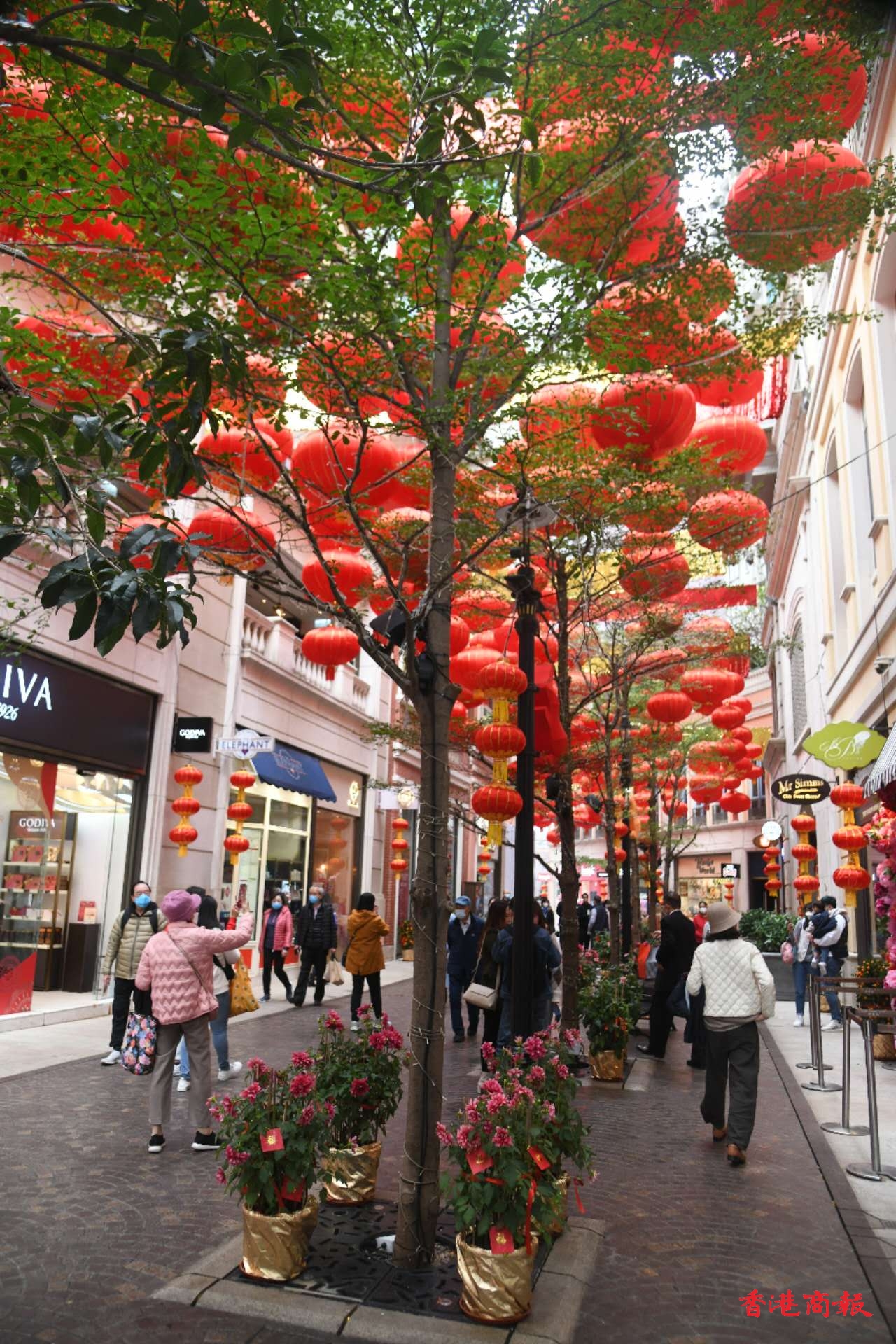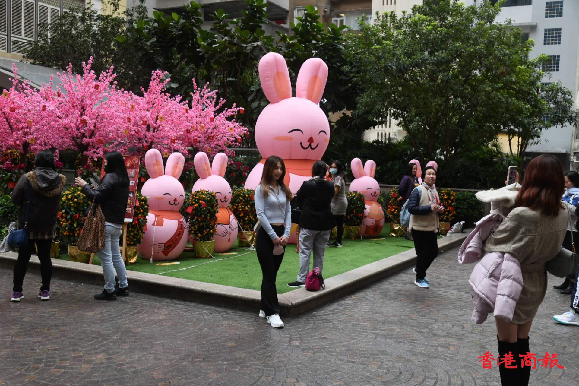 農曆新年期間灣仔利東街以「花燈‧彩兔賀新歲」為主題打造新春步行街,200米長的林蔭大道上空懸掛688個大紅燈籠,添上金、紅亮片裝飾,寓意闔家團圓、百業興旺。除此之外,街上的燈柱繫上彩兔裝飾,中庭廣場中央更設有玉兔燈光裝置,假期時間吸引大批市民及遊客到來拍照打咭。(蔡啟文攝)