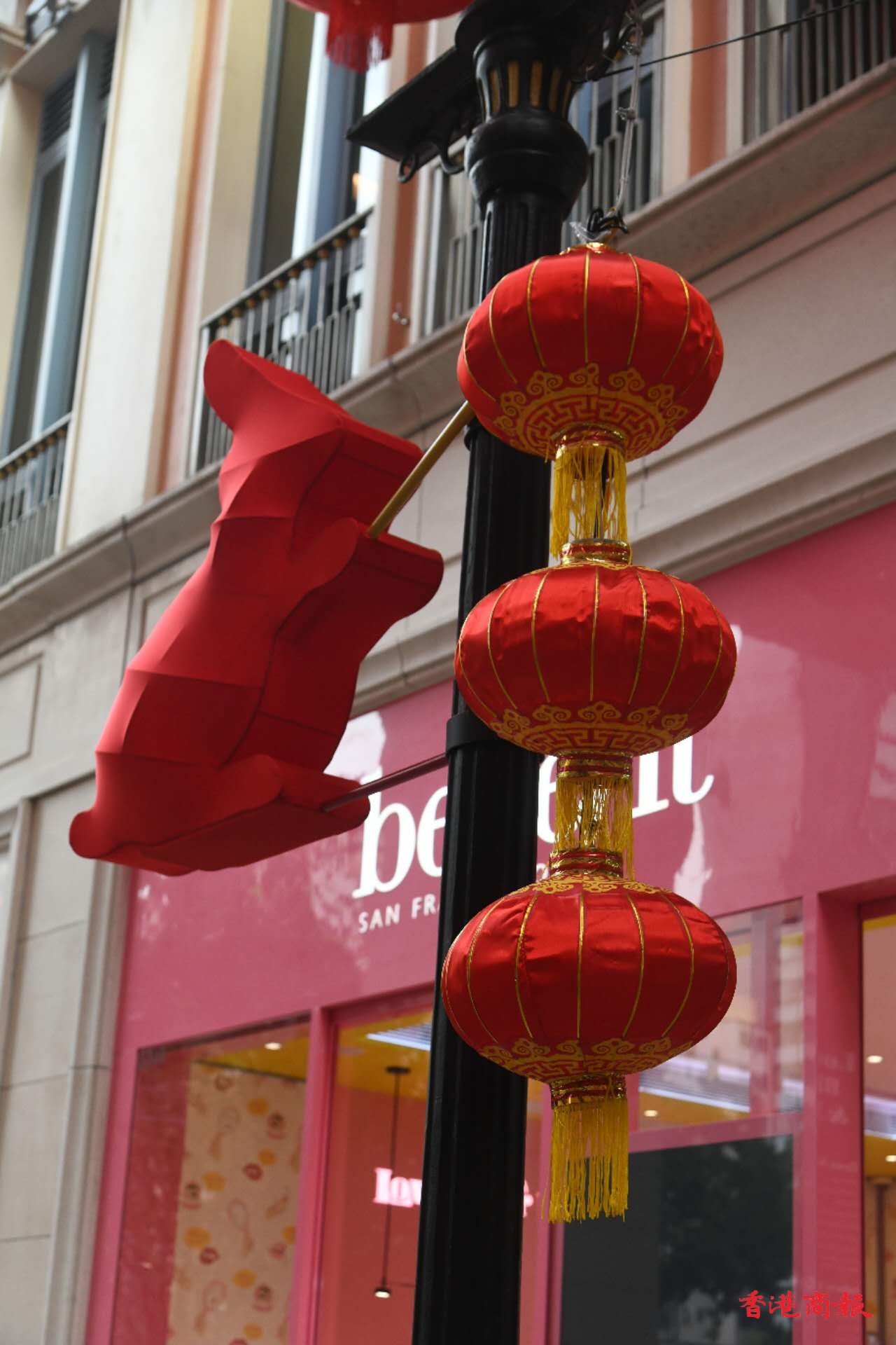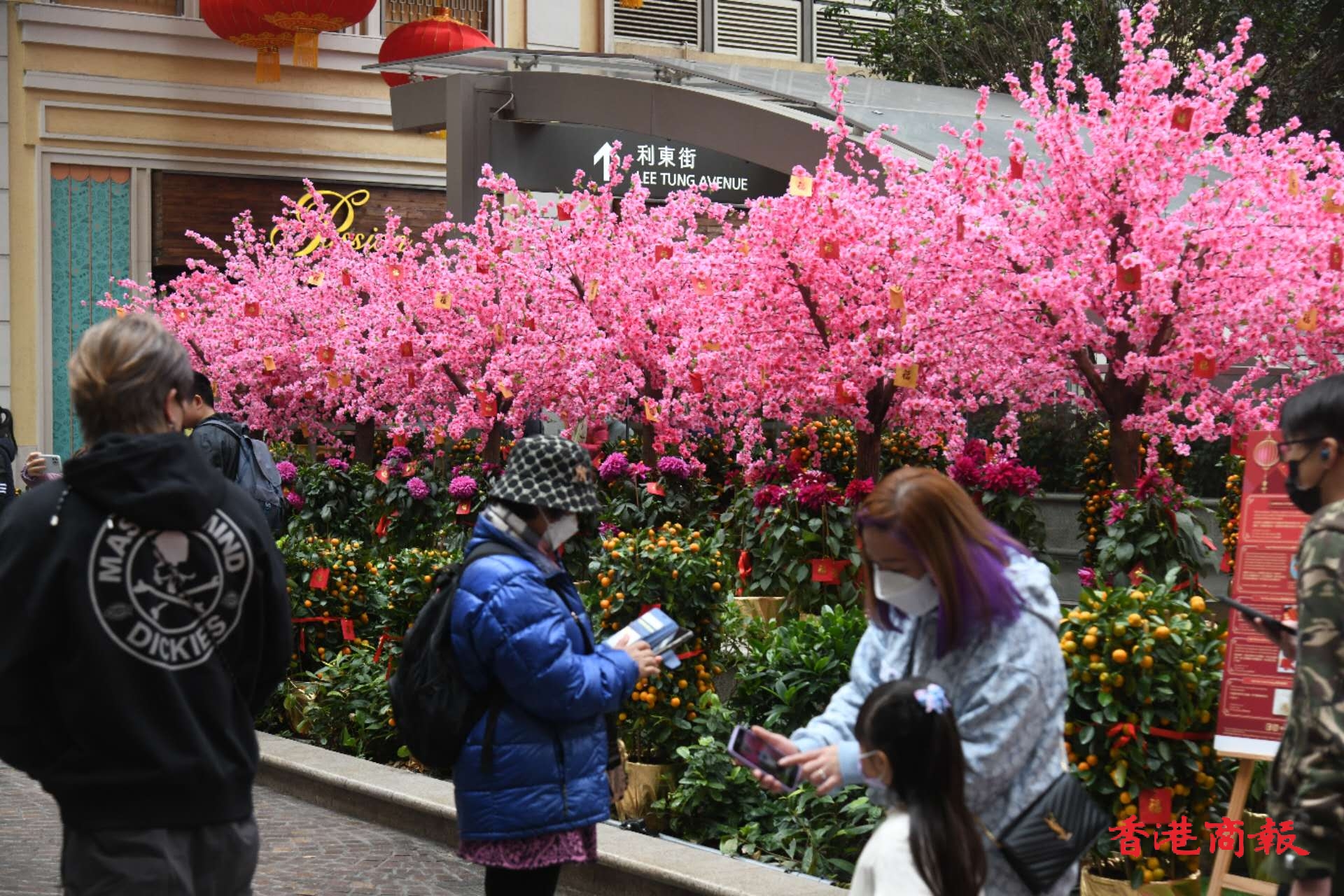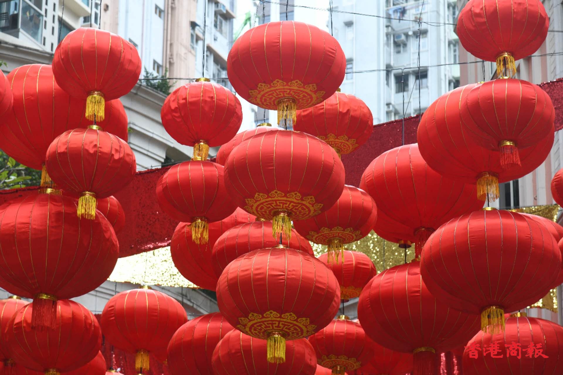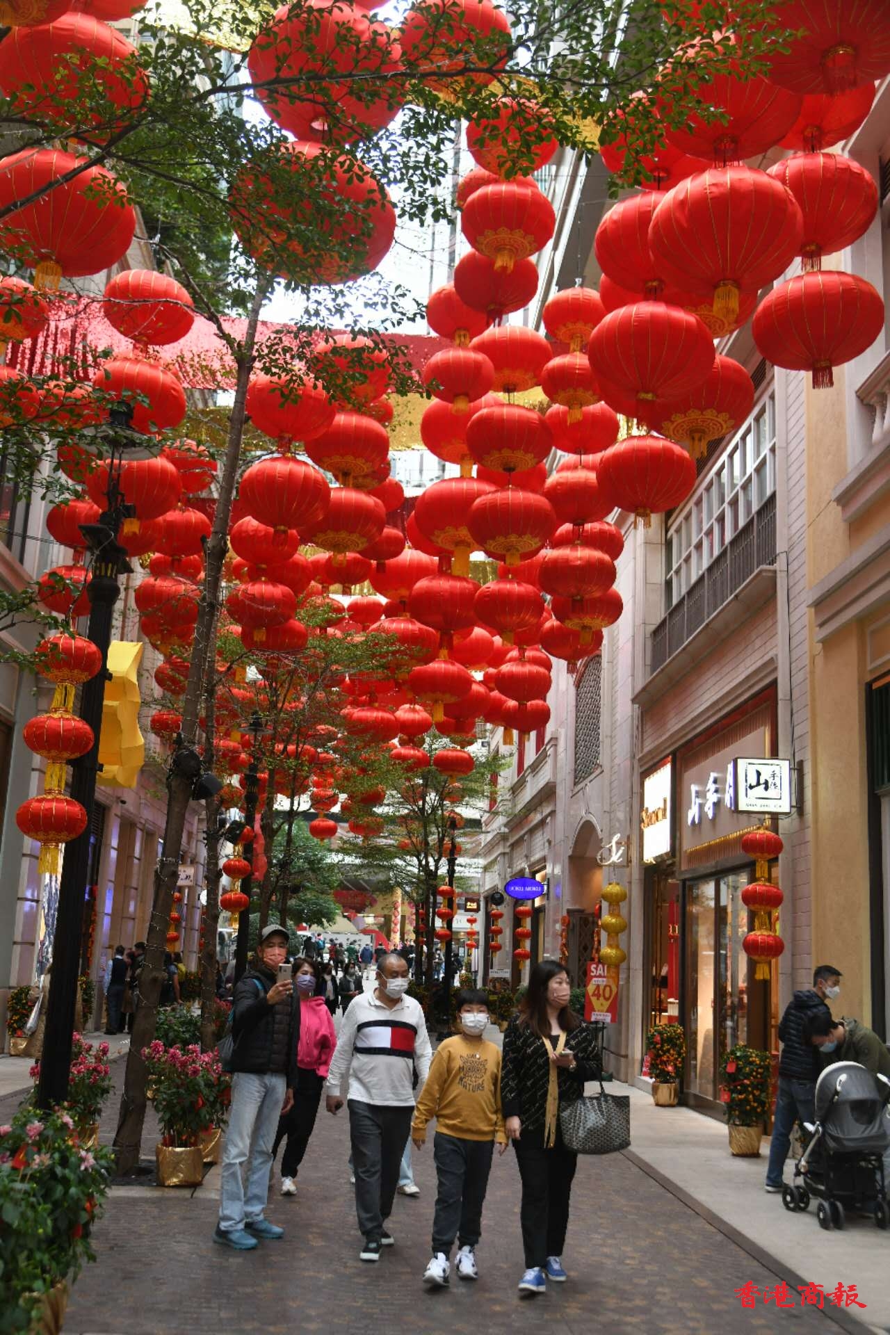 農曆新年期間灣仔利東街以「花燈‧彩兔賀新歲」為主題打造新春步行街,200米長的林蔭大道上空懸掛688個大紅燈籠,添上金、紅亮片裝飾,寓意闔家團圓、百業興旺。除此之外,街上的燈柱繫上彩兔裝飾,中庭廣場中央更設有玉兔燈光裝置,假期時間吸引大批市民及遊客到來拍照打咭。(蔡啟文攝)