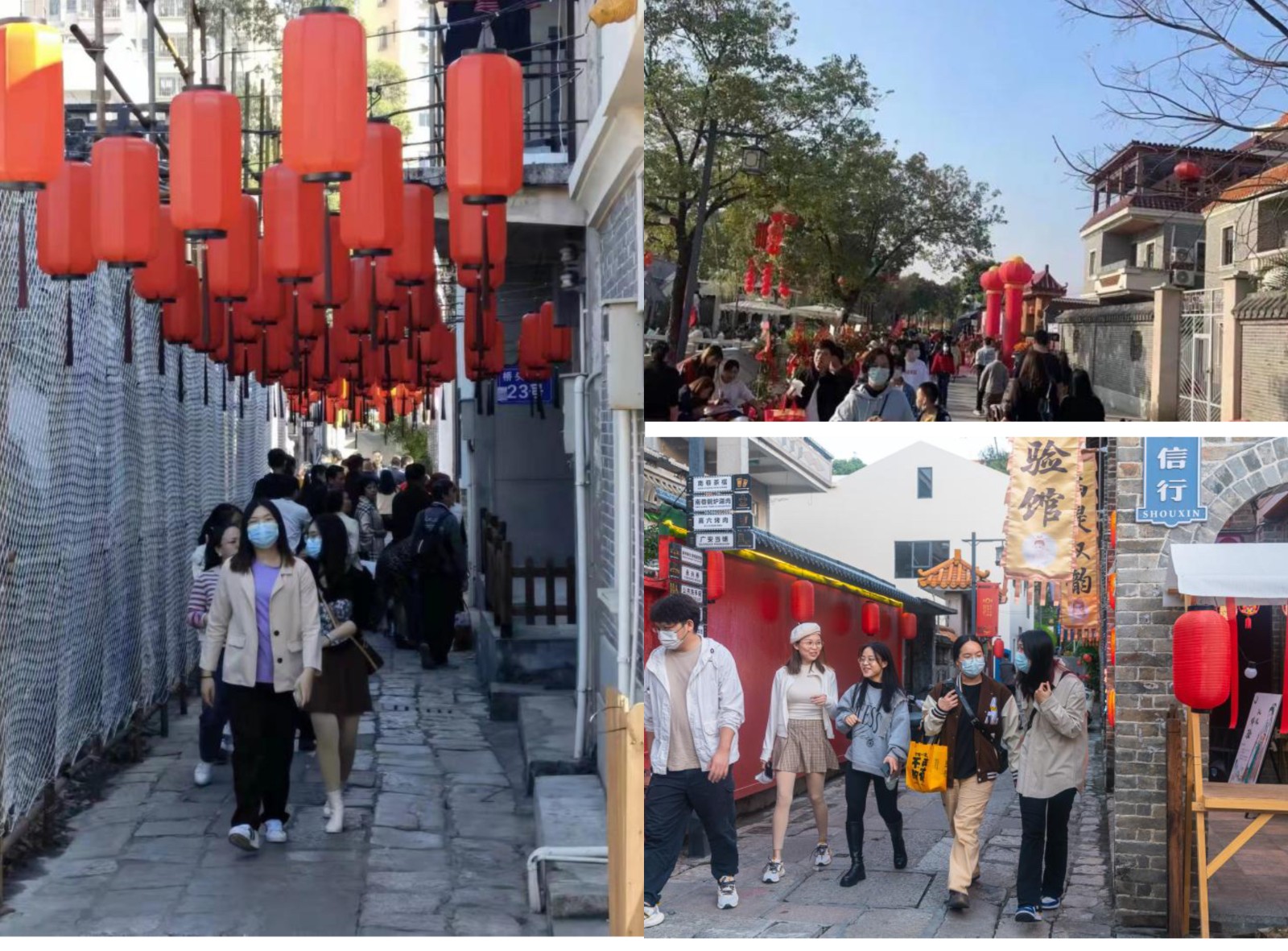 清平古墟舉辦「錢兔似錦」祈福打卡活動、清平古墟廣場迎春文藝快閃、漢服同袍就地過年計劃、醒獅表演等各色春節主題活動,傳統春節年味濃厚。據景點統計,春節假期清平古墟共接待遊客3.56萬人次。素有「鳳山福水福盈地」美譽的鳳凰山森林公園春節期間增加了大紅燈籠等新春布置,鳳岩古廟吸引大批市民前往祈福。據景點統計,春節假期鳳凰山森林公園接待遊客同比增長3倍。