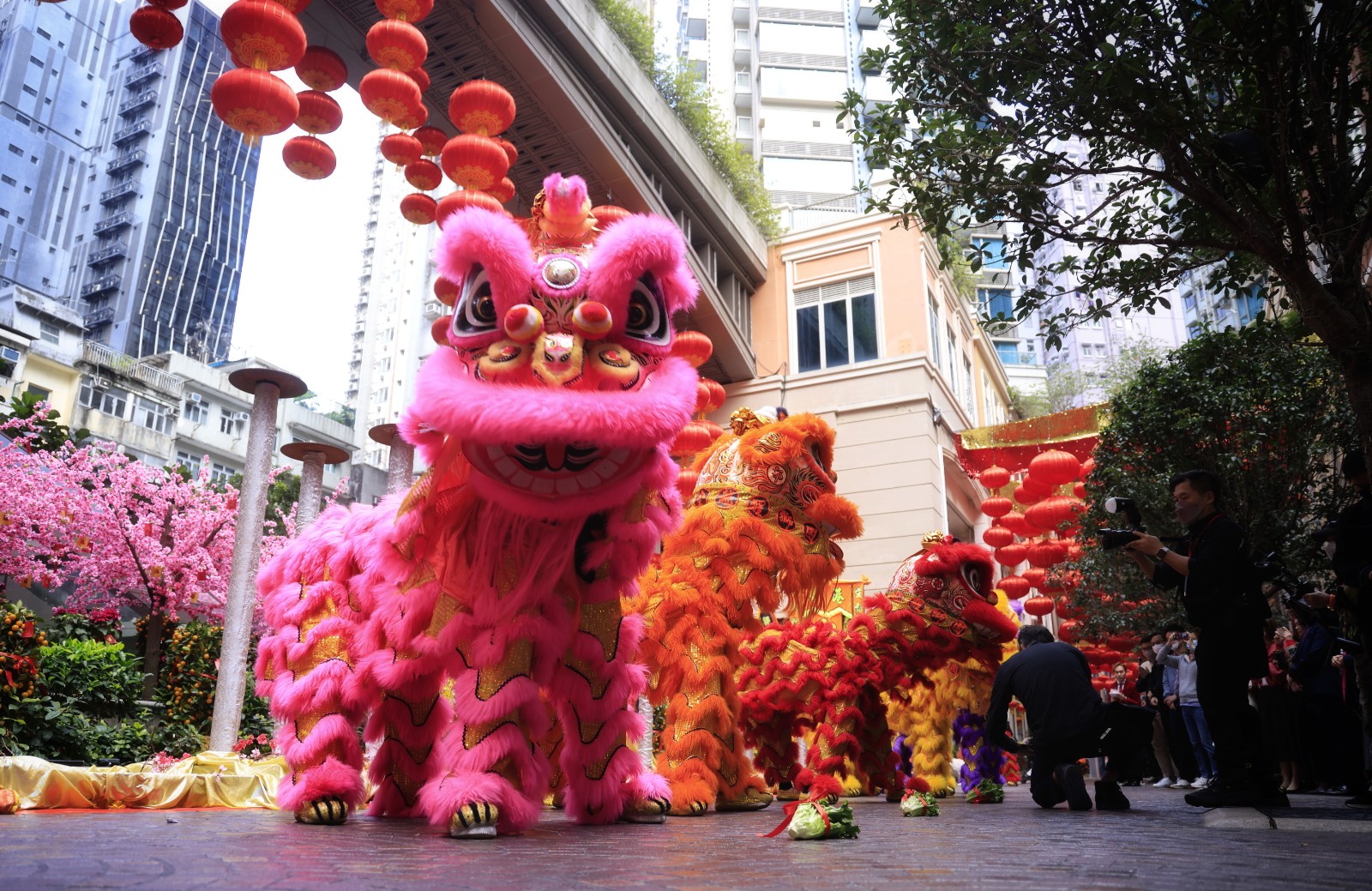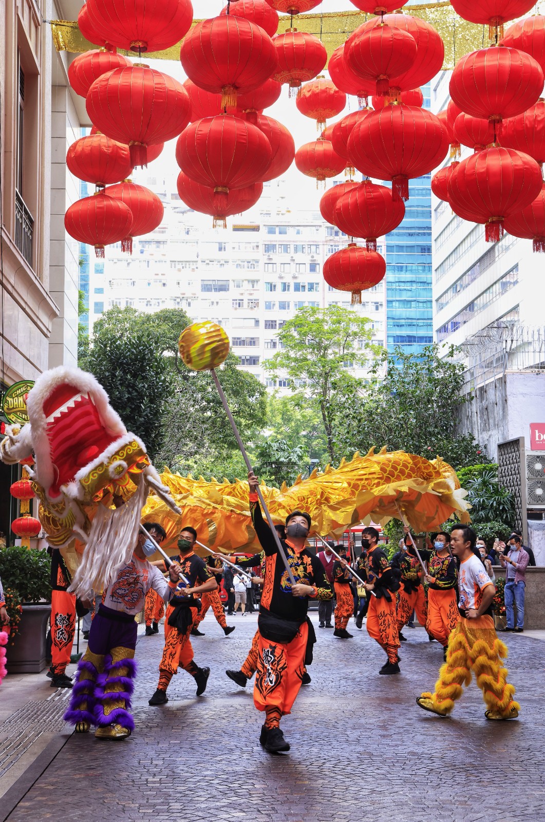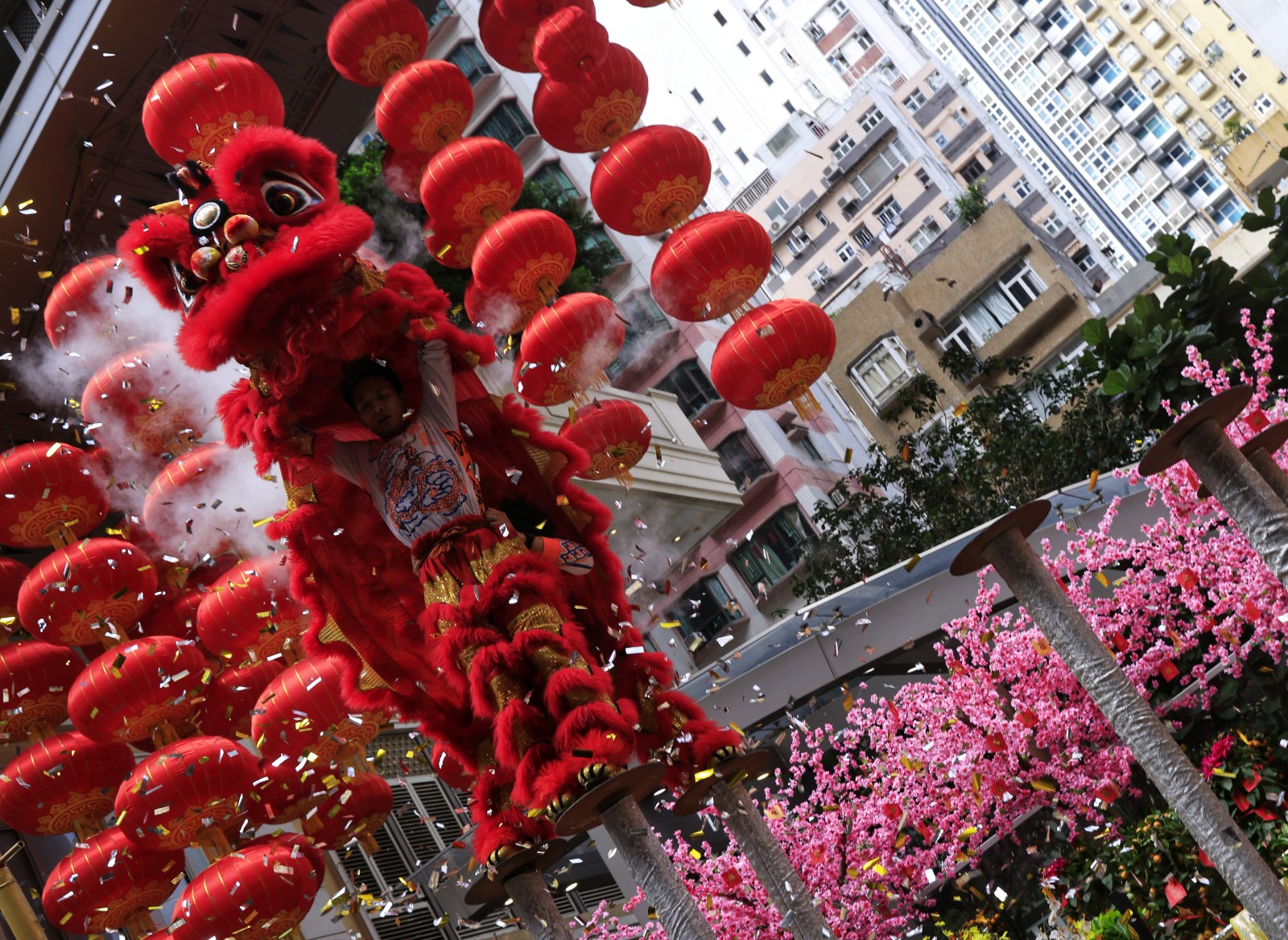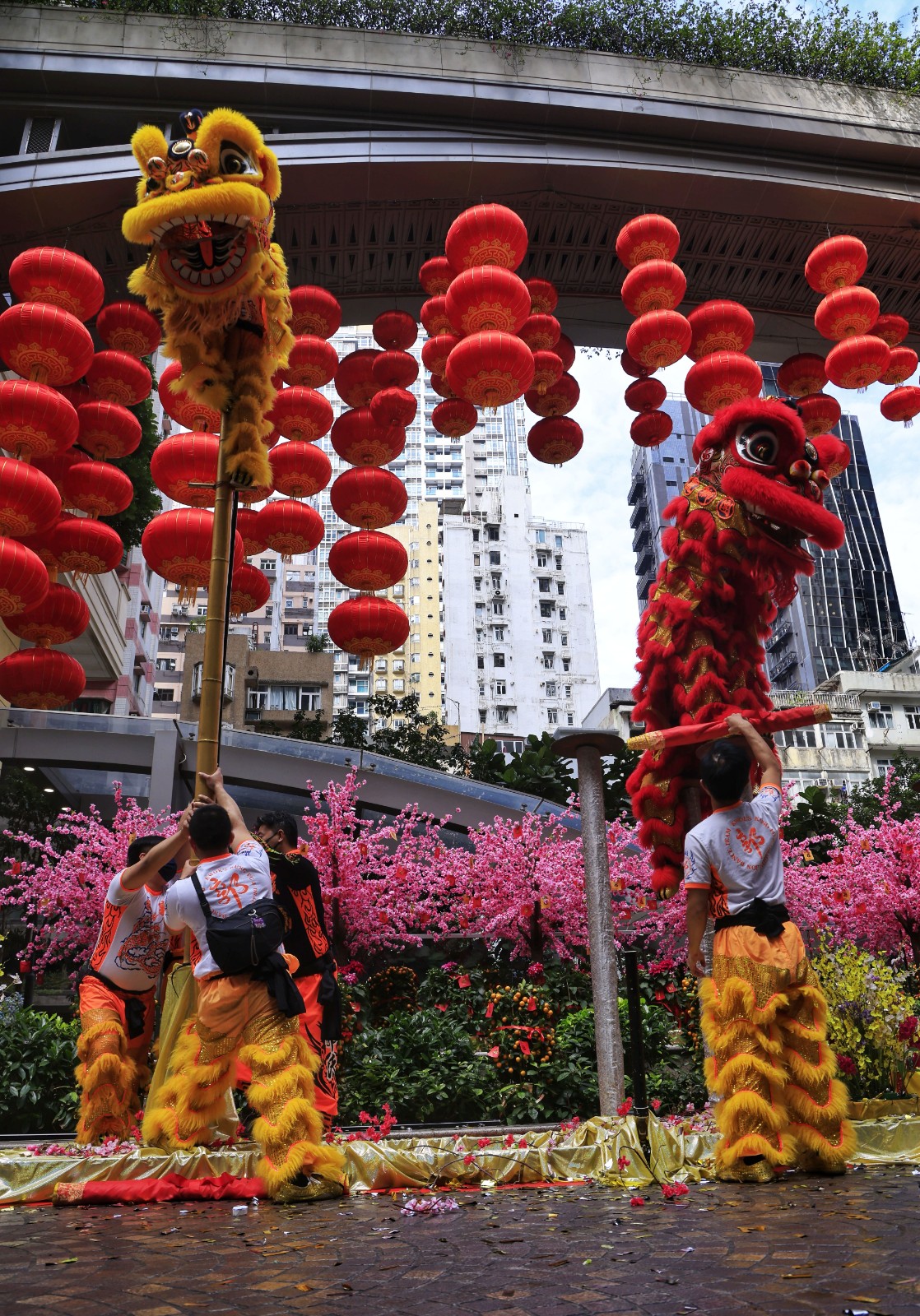 2月3日,香港利東街舉行「金龍醒獅舞動賀新禧」開市典禮。現場呈獻舞龍舞獅表演,一條80多呎巨型金龍,加上5頭彩色醒獅,躍動梅花樁上,配合街道上688個大紅燈籠裝飾,場面盛大壯觀,鑼鼓喧天,氣氛熾熱。(圖源:中通社)