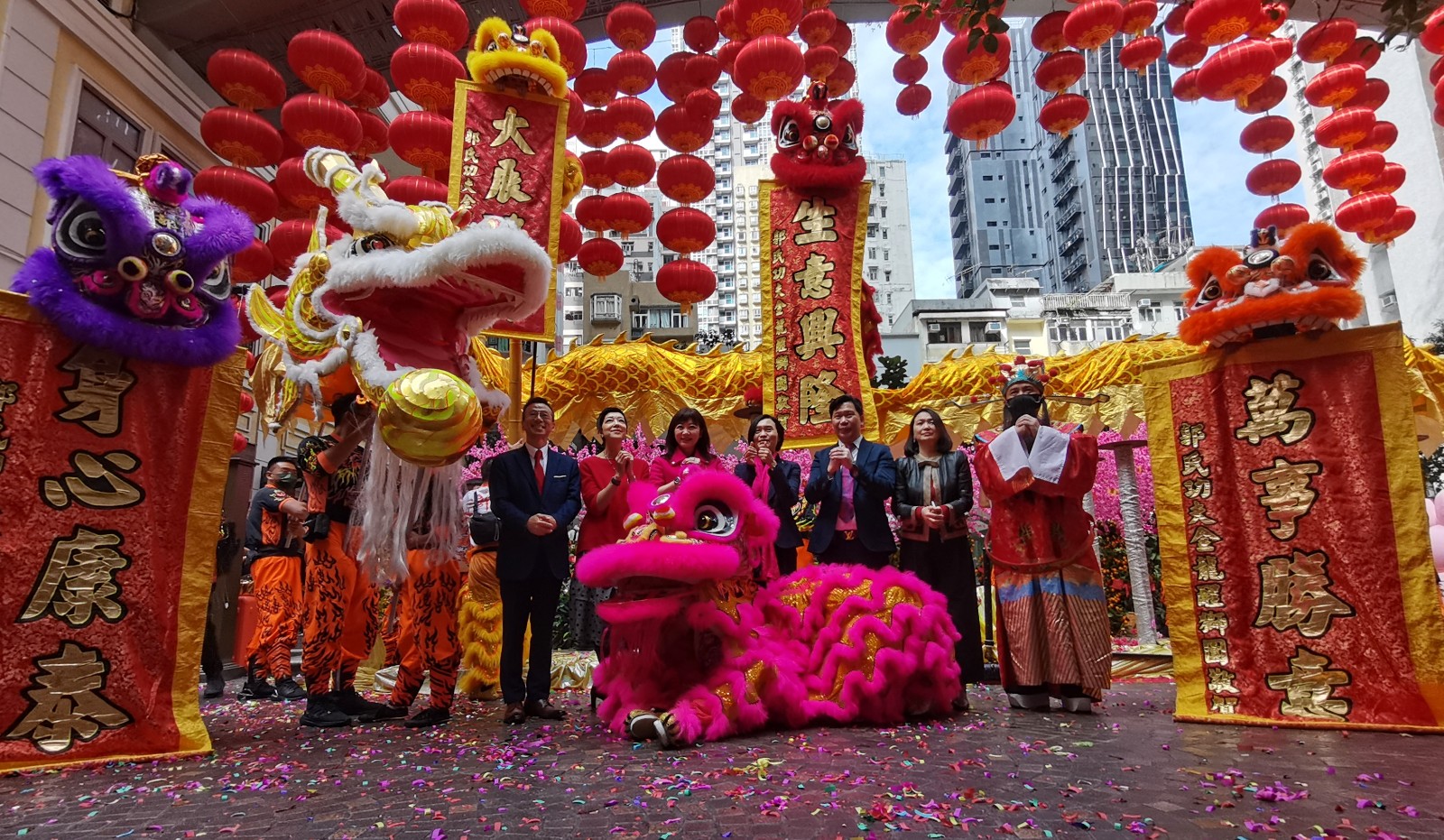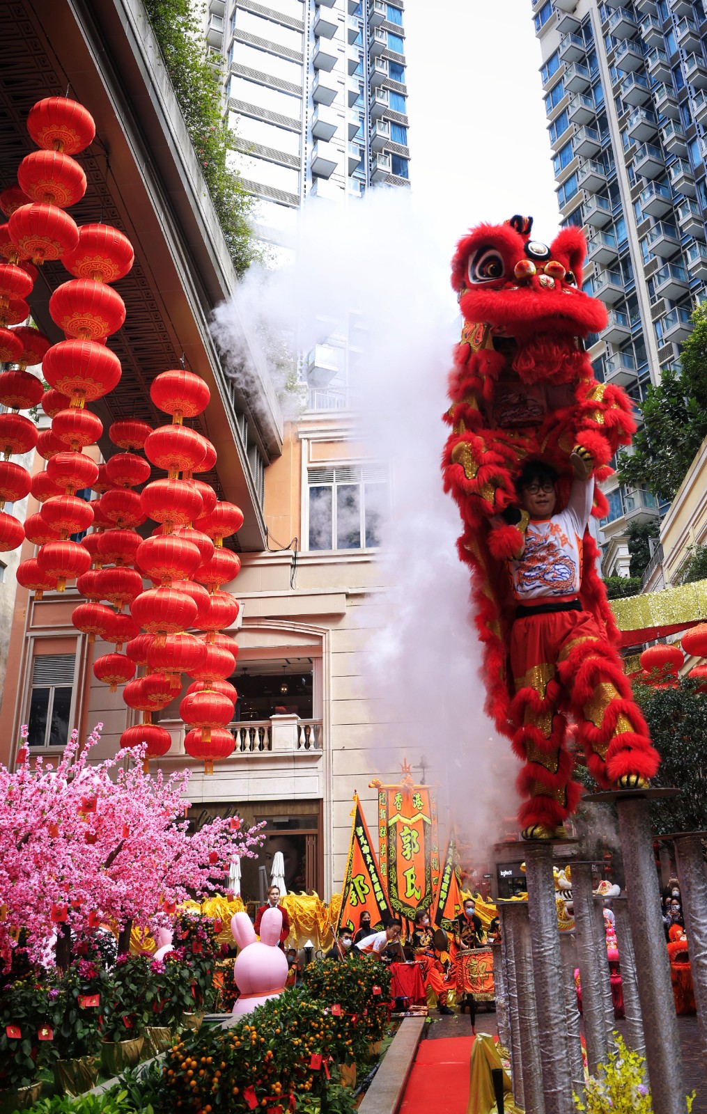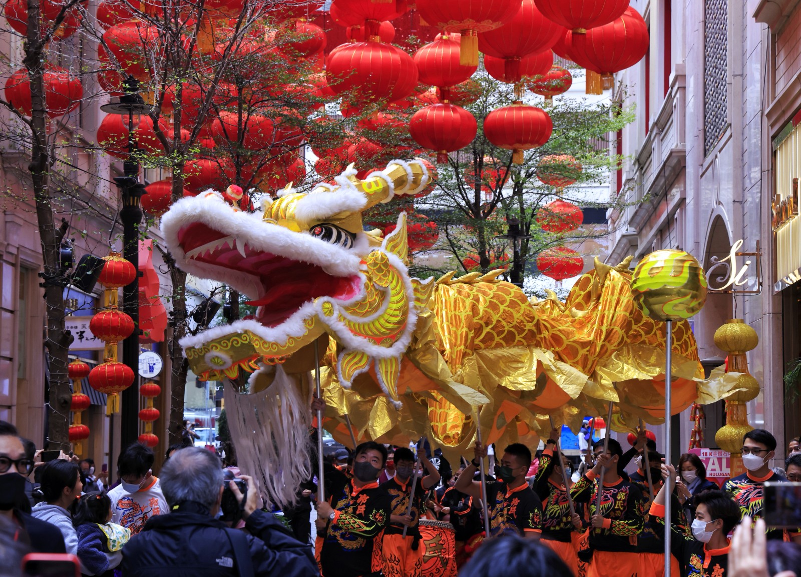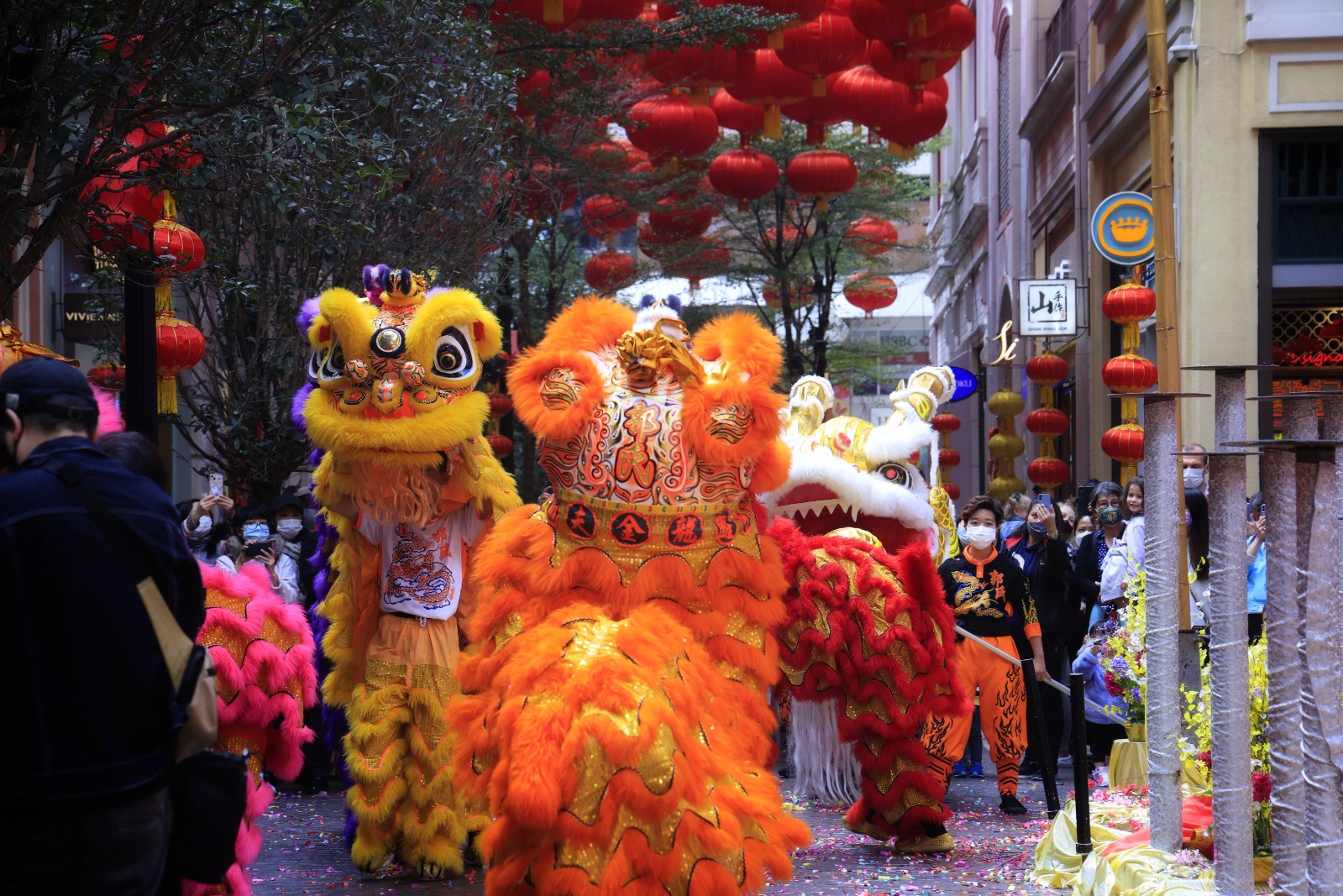 2月3日,香港利東街舉行「金龍醒獅舞動賀新禧」開市典禮。現場呈獻舞龍舞獅表演,一條80多呎巨型金龍,加上5頭彩色醒獅,躍動梅花樁上,配合街道上688個大紅燈籠裝飾,場面盛大壯觀,鑼鼓喧天,氣氛熾熱。(圖源:中通社)