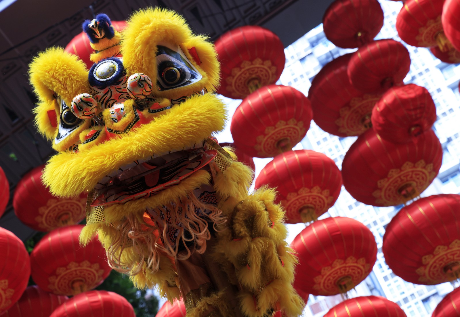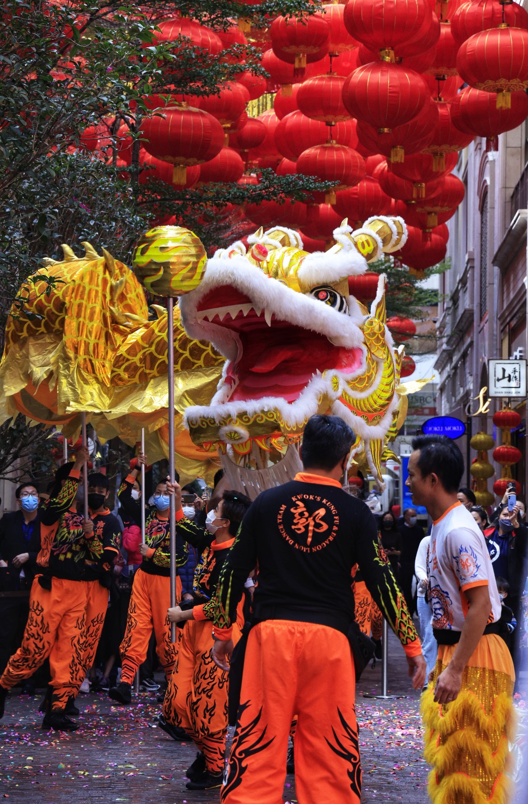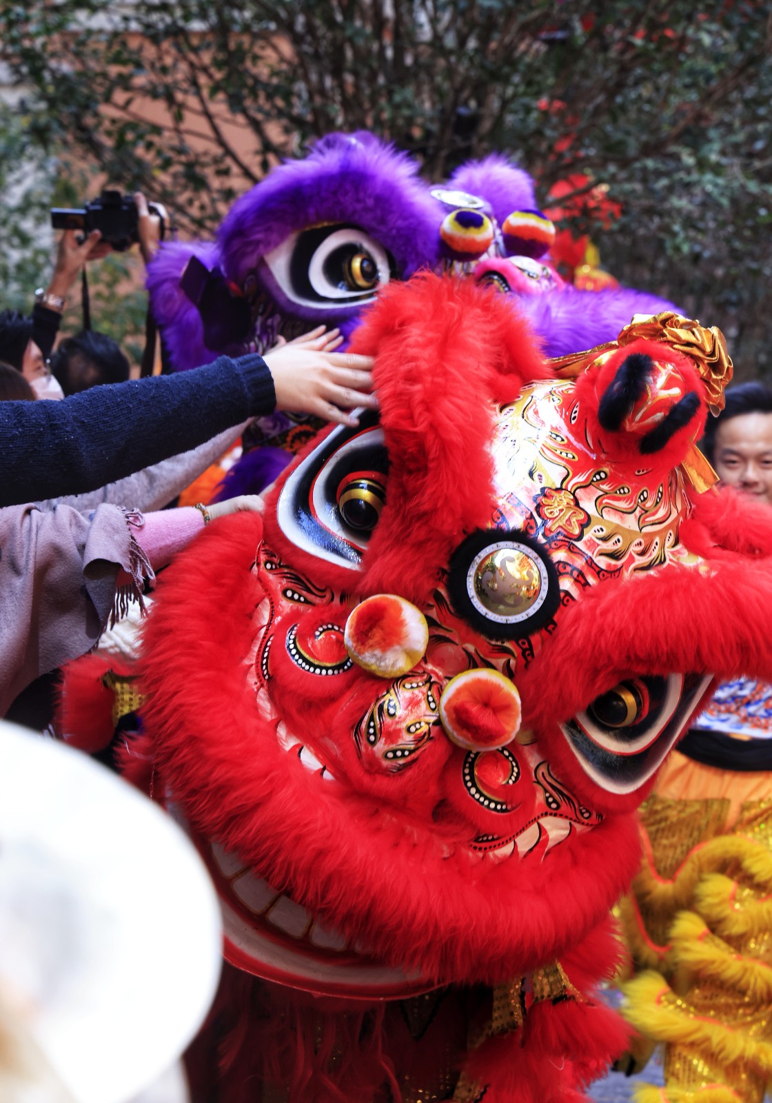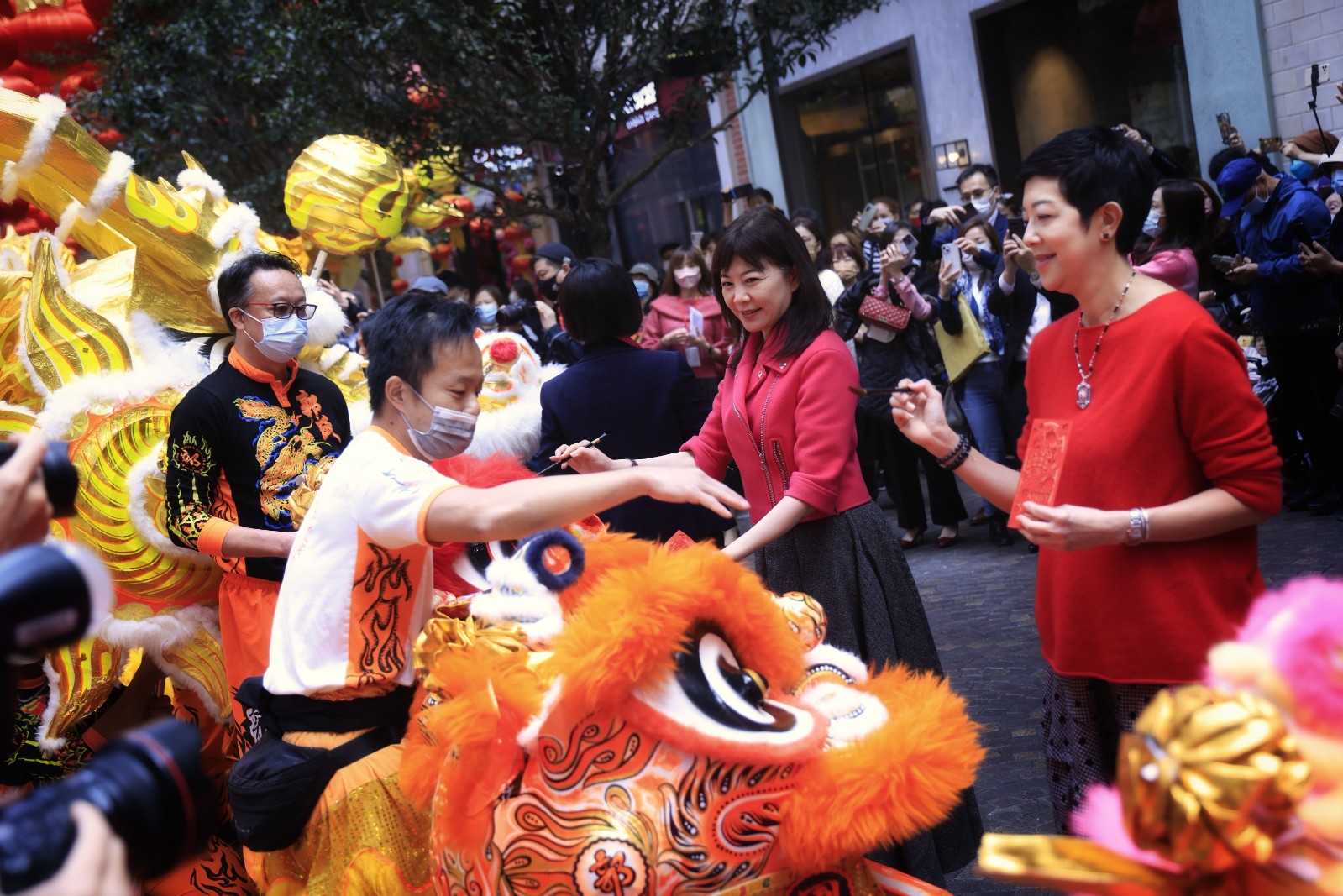2月3日,香港利東街舉行「金龍醒獅舞動賀新禧」開市典禮。現場呈獻舞龍舞獅表演,一條80多呎巨型金龍,加上5頭彩色醒獅,躍動梅花樁上,配合街道上688個大紅燈籠裝飾,場面盛大壯觀,鑼鼓喧天,氣氛熾熱。(圖源:中通社)