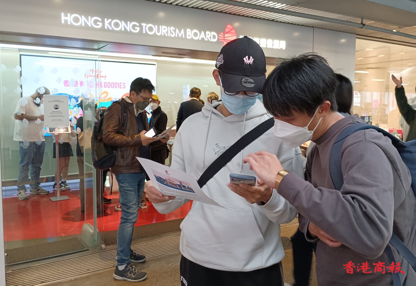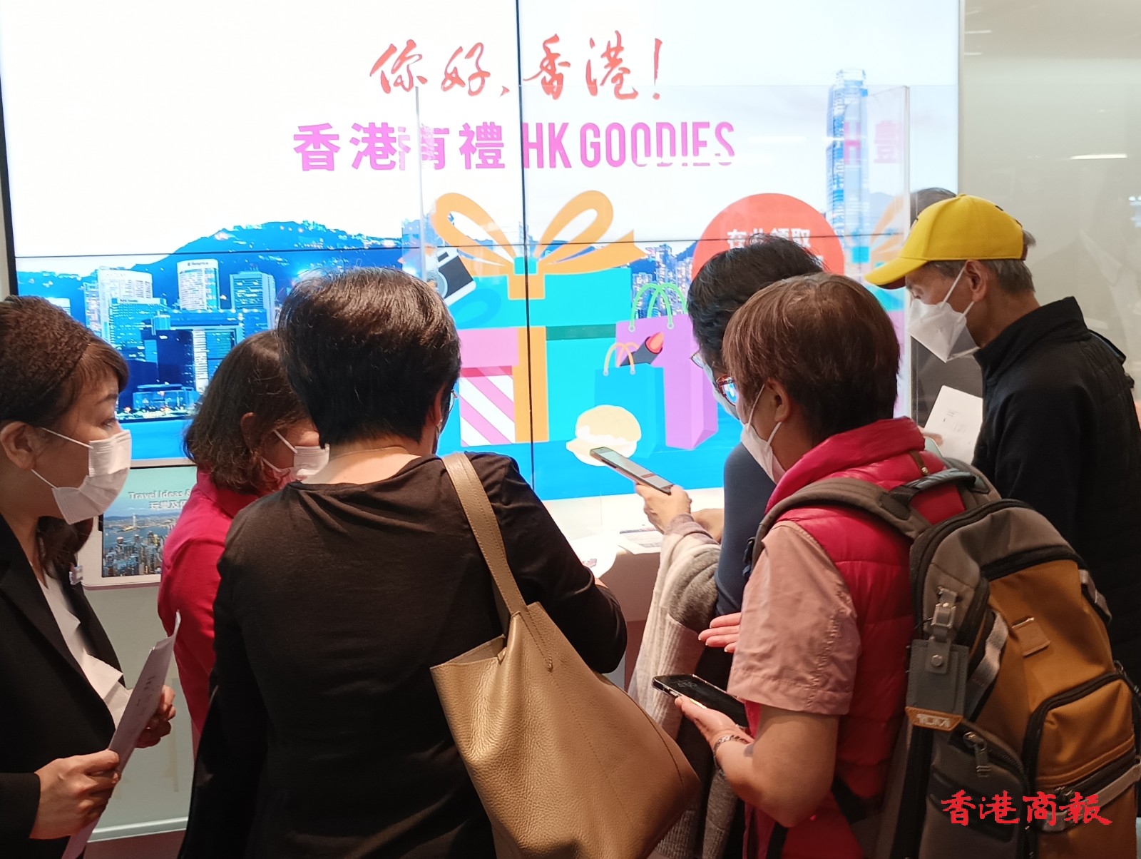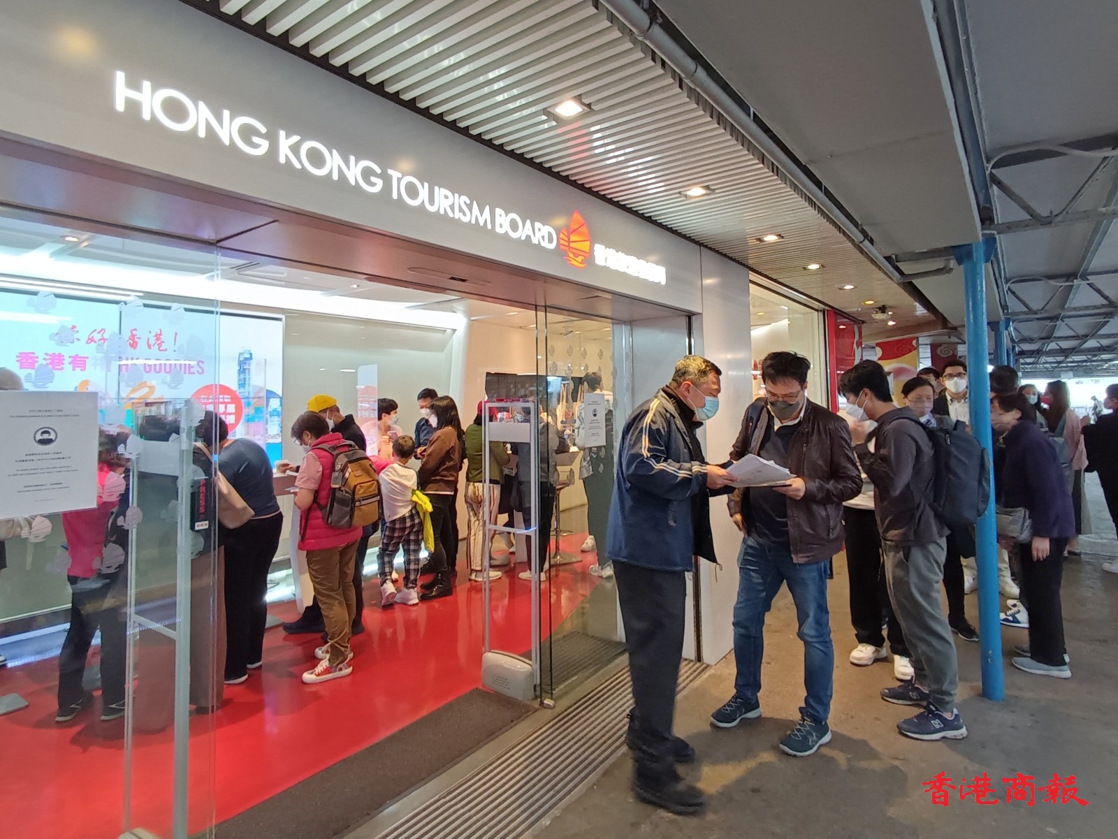 為振興香港旅遊,旅發局聯同本地餐飲及零售界派發100萬份「香港有禮」(HK Goodies)消費優惠券,旅客可憑券免費兌換迎賓飲品。在尖沙咀旅發局遊客諮詢中心,不少遊客排隊領取電子優惠券,中心安排工作人員指導遊客使用。(記者 馮瀚文攝)