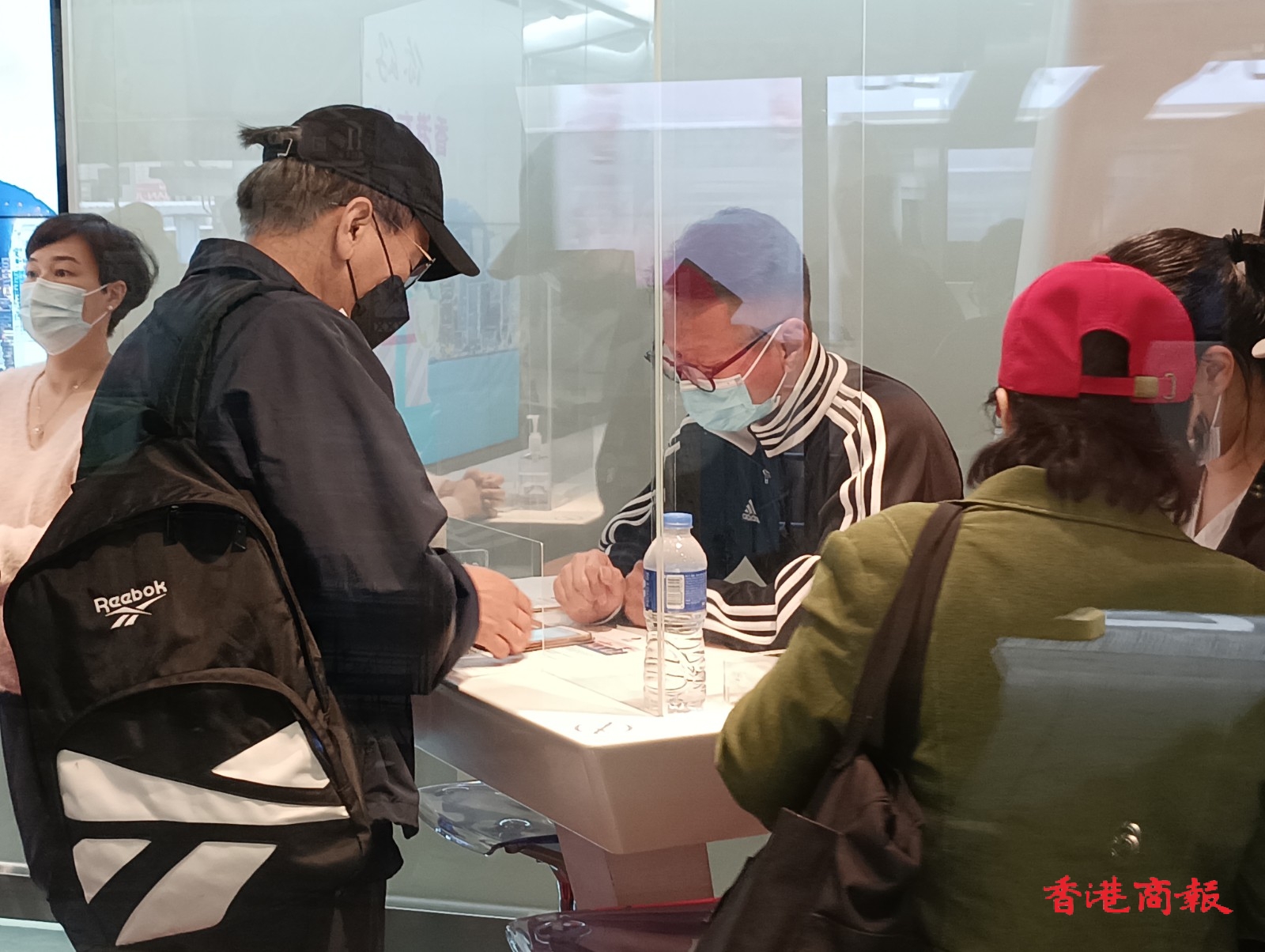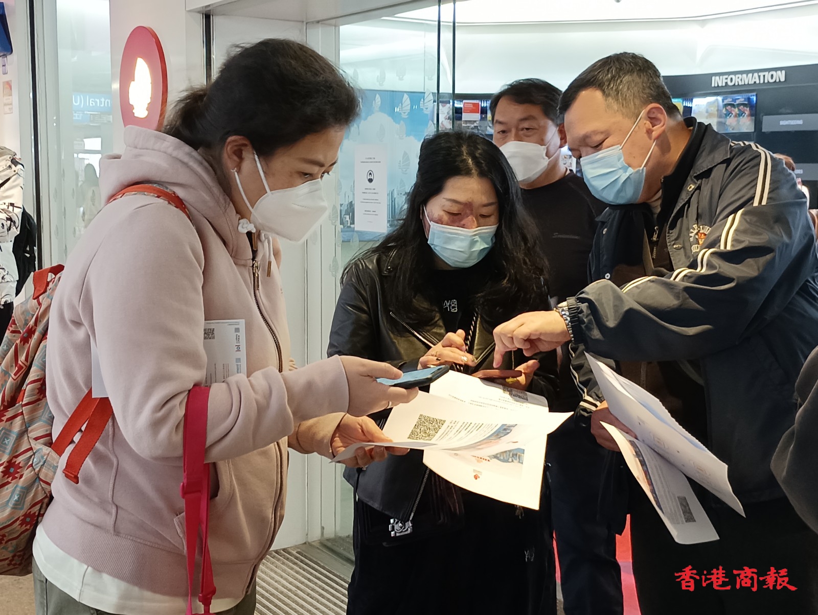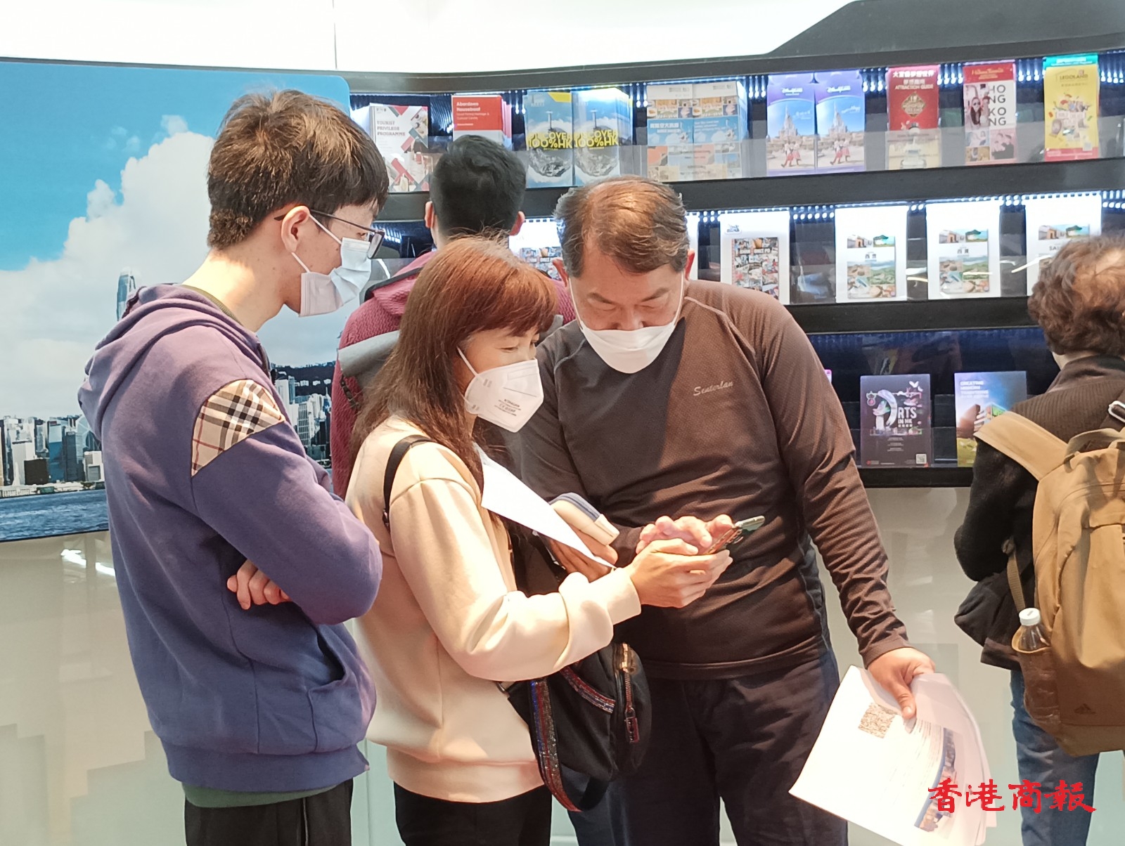 為振興香港旅遊,旅發局聯同本地餐飲及零售界派發100萬份「香港有禮」(HK Goodies)消費優惠券,旅客可憑券免費兌換迎賓飲品。在尖沙咀旅發局遊客諮詢中心,不少遊客排隊領取電子優惠券,中心安排工作人員指導遊客使用。(記者 馮瀚文攝)