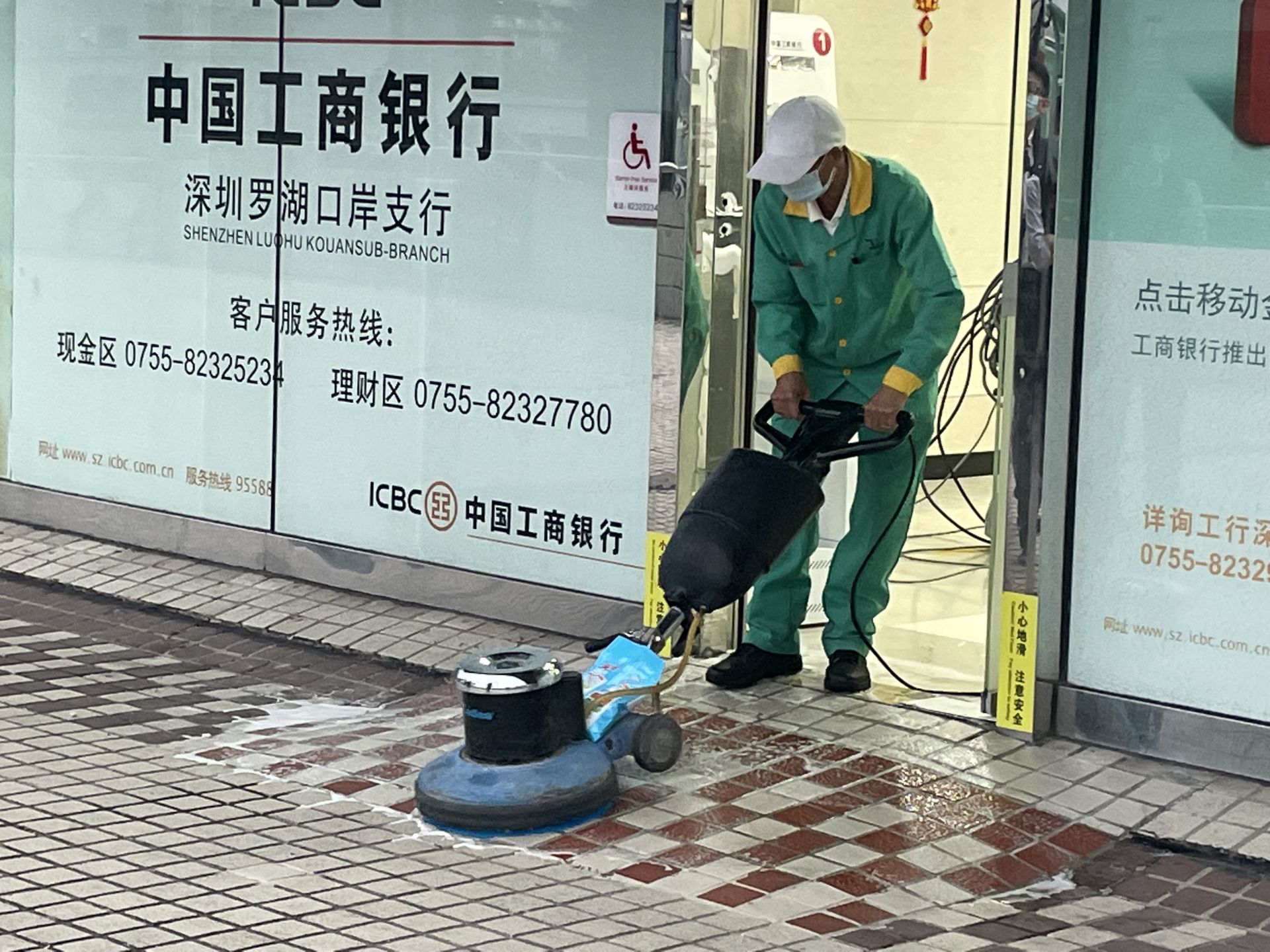羅湖商業城銀行保潔人員清洗門口的地板。