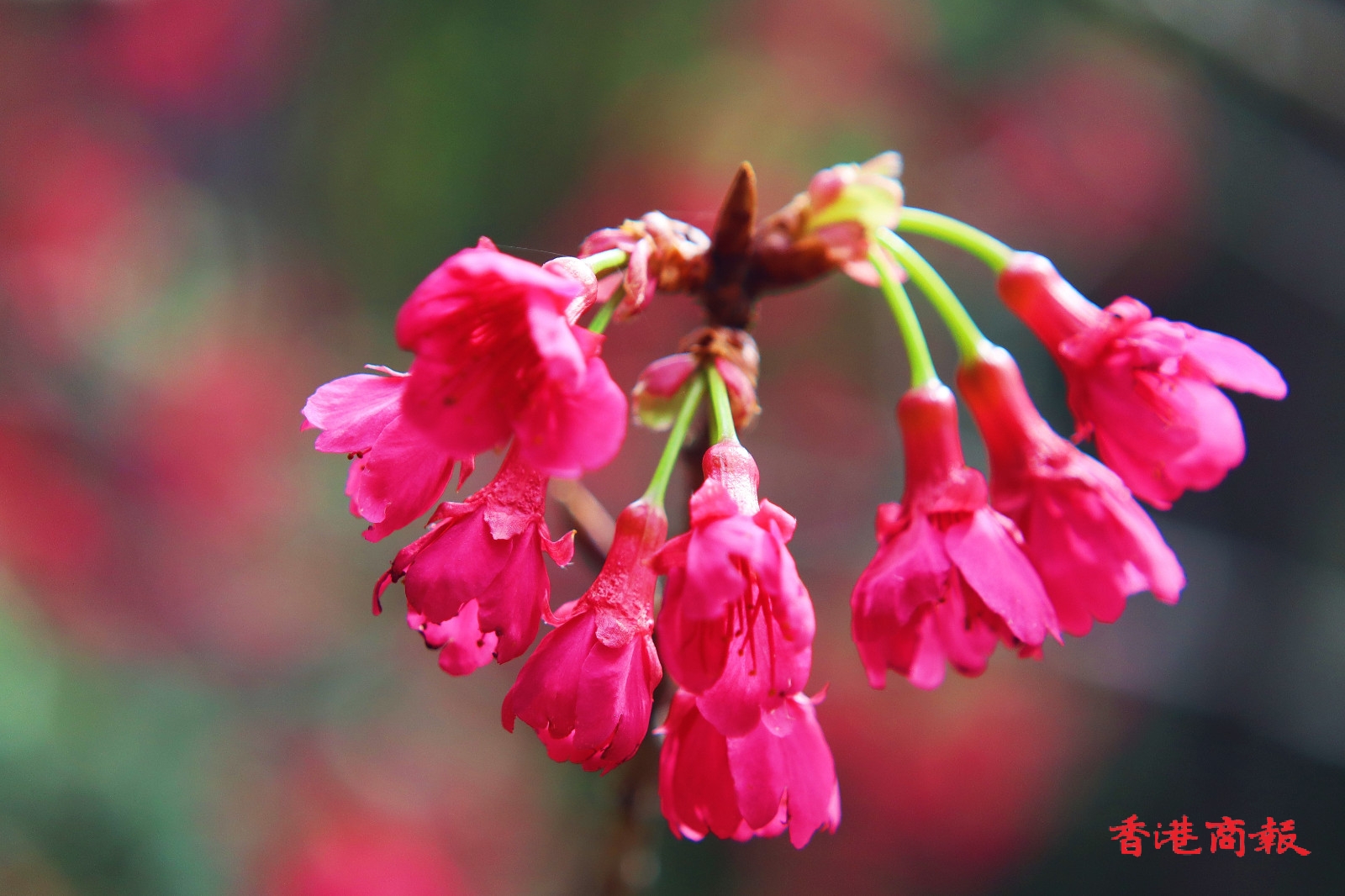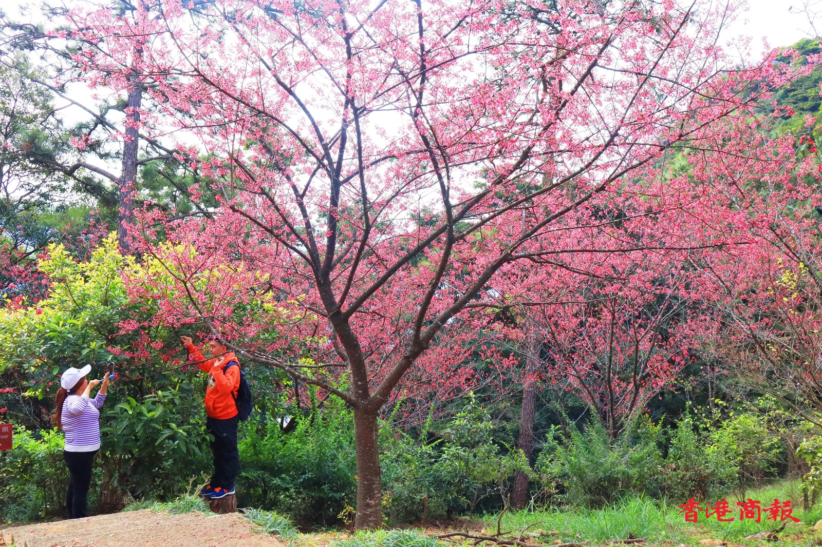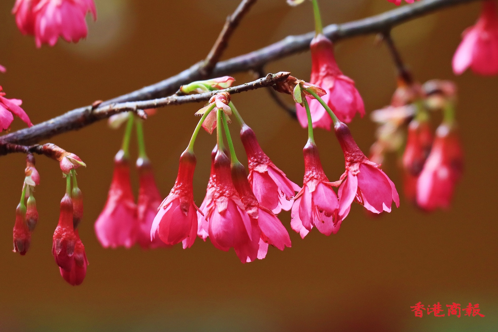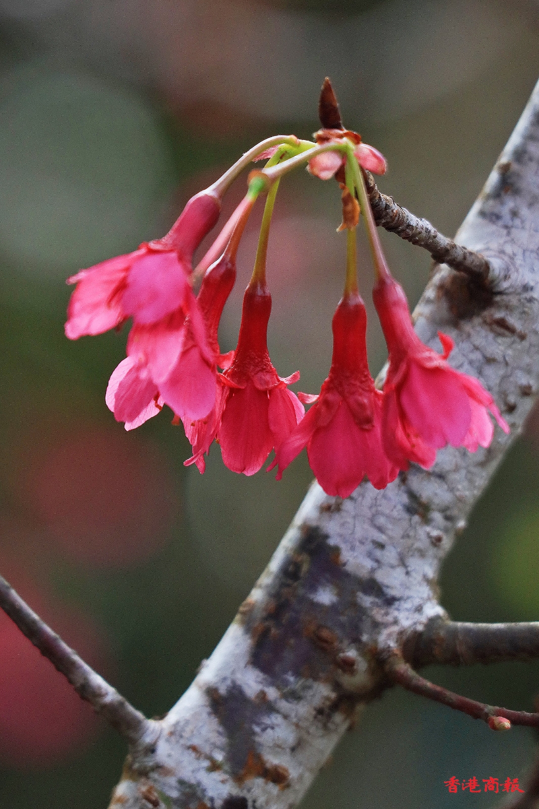 冬去春來,大地回暖,百花待放,大埔嘉道理農場暨植物園的鐘花櫻桃亦加入爭艷行列,園內鐘花櫻桃有逾百株,散落在嘉道理兄弟紀念亭至觀音山山頂一帶,當中較多位於上山區胡挺生先生紀念亭附近,那裏種有數十株鐘花櫻桃(即是台灣的山櫻),櫻花形狀像是一個個垂下的粉紅色吊鐘。雖然有別於日本普遍的染井吉野櫻花,但同樣顏色鮮艷,別具特色,不但吸引不少愛花之人,也吸引不少鳥兒前來覓食。鐘花櫻桃一般花期只有約兩星期,要把握時間前往。(馮瀚文攝)