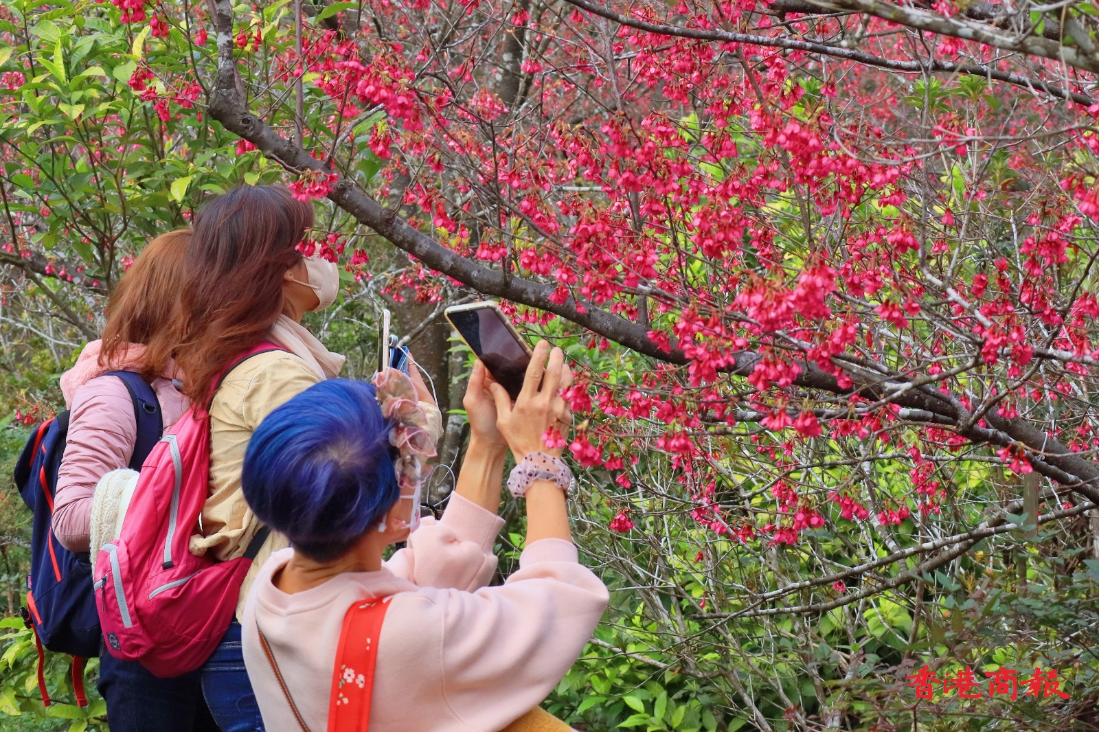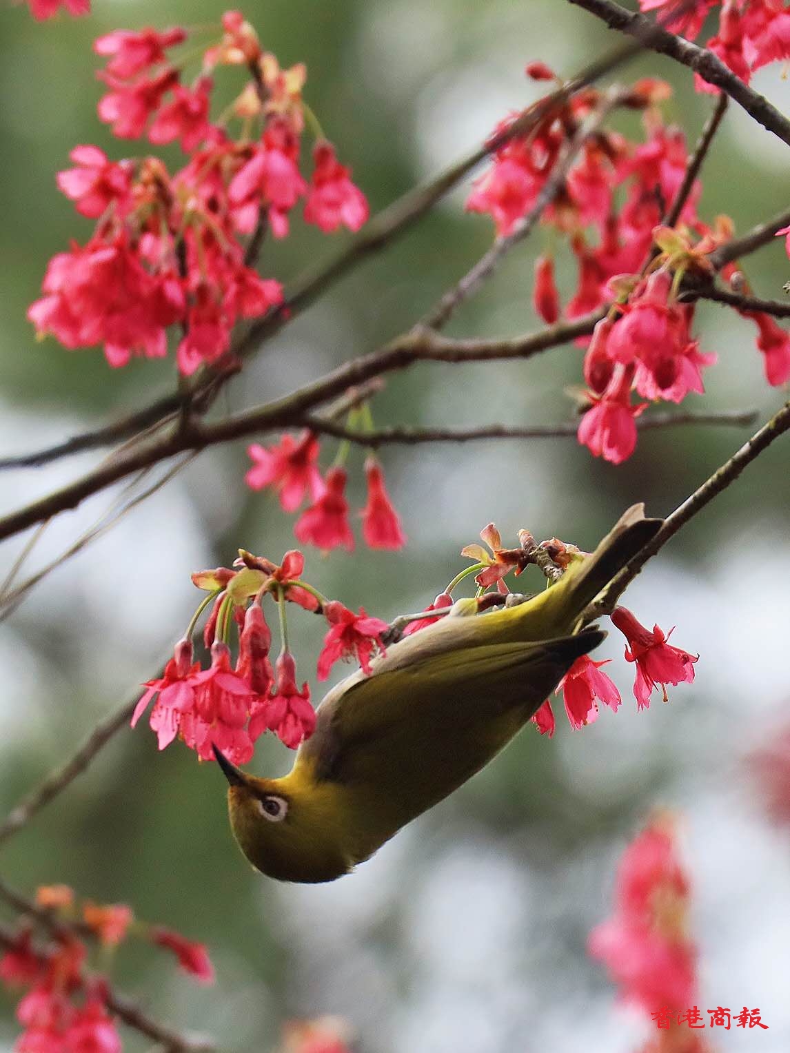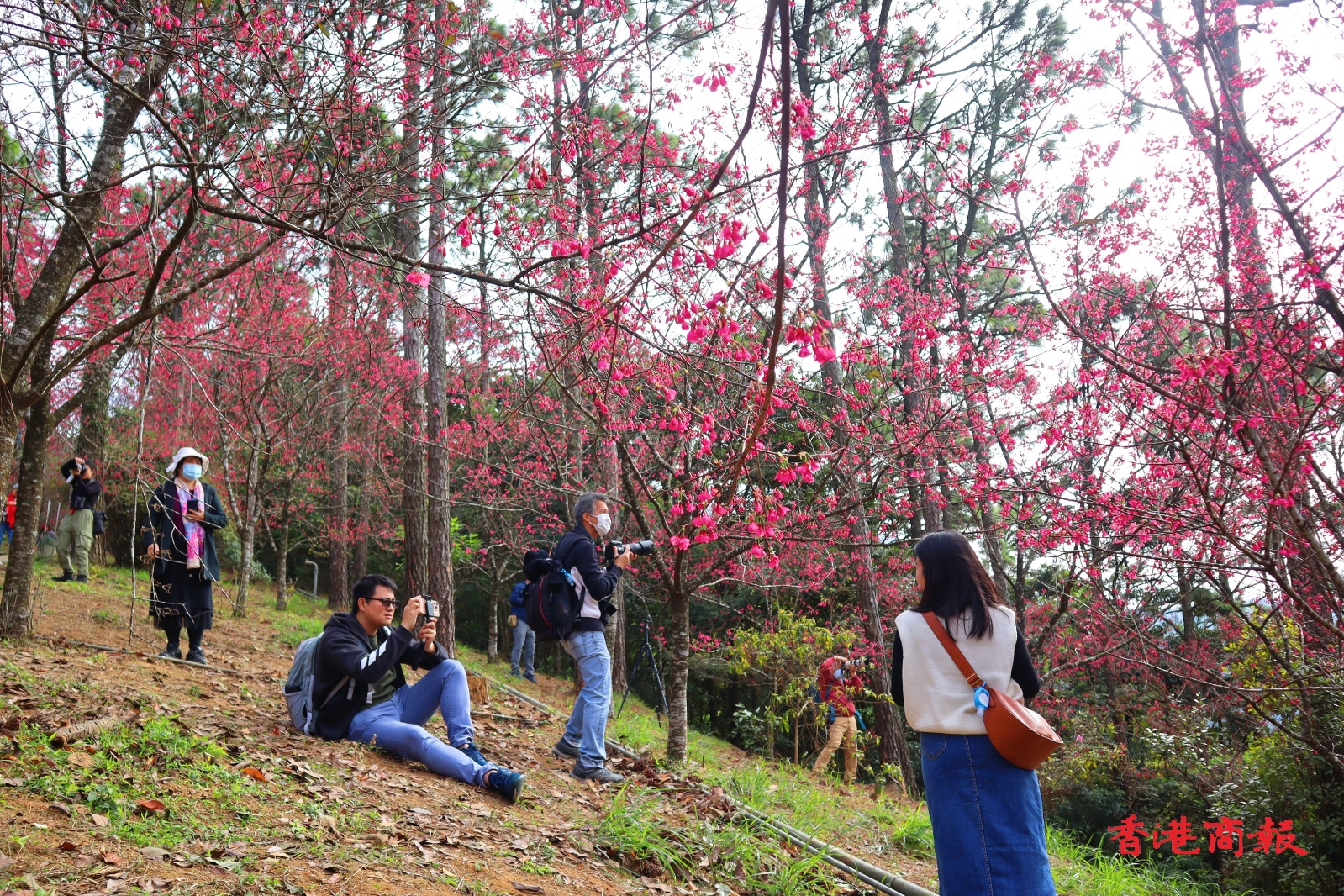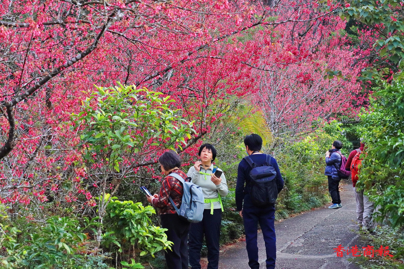 冬去春來,大地回暖,百花待放,大埔嘉道理農場暨植物園的鐘花櫻桃亦加入爭艷行列,園內鐘花櫻桃有逾百株,散落在嘉道理兄弟紀念亭至觀音山山頂一帶,當中較多位於上山區胡挺生先生紀念亭附近,那裏種有數十株鐘花櫻桃(即是台灣的山櫻),櫻花形狀像是一個個垂下的粉紅色吊鐘。雖然有別於日本普遍的染井吉野櫻花,但同樣顏色鮮艷,別具特色,不但吸引不少愛花之人,也吸引不少鳥兒前來覓食。鐘花櫻桃一般花期只有約兩星期,要把握時間前往。(馮瀚文攝)