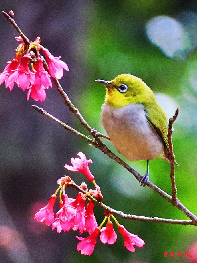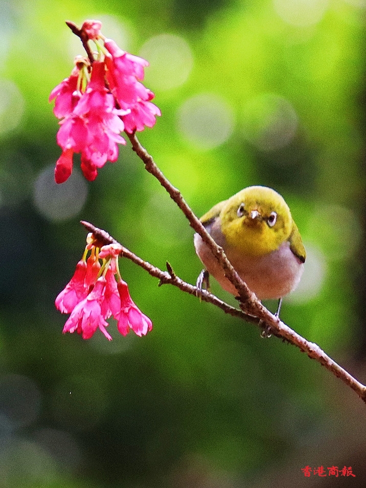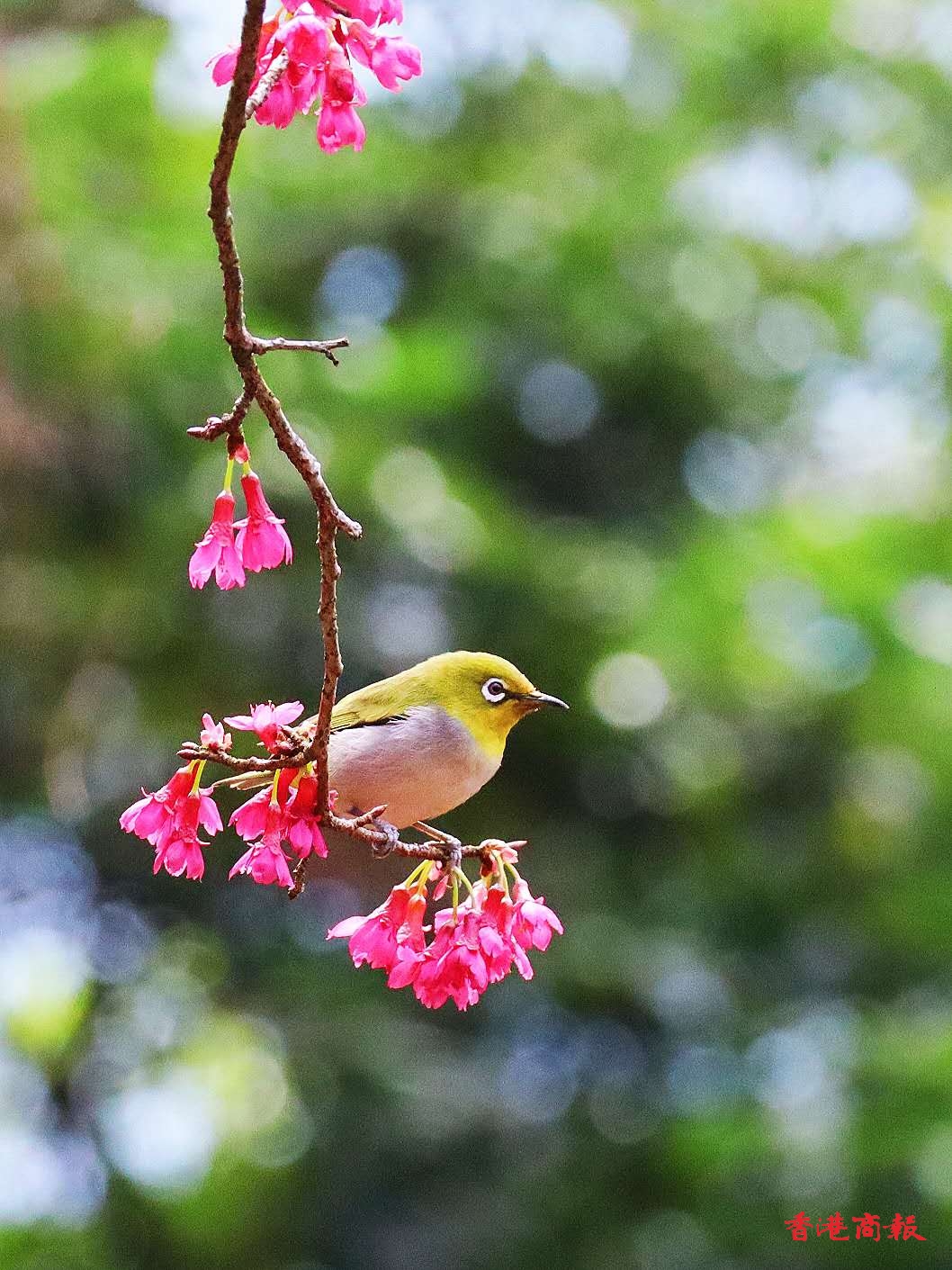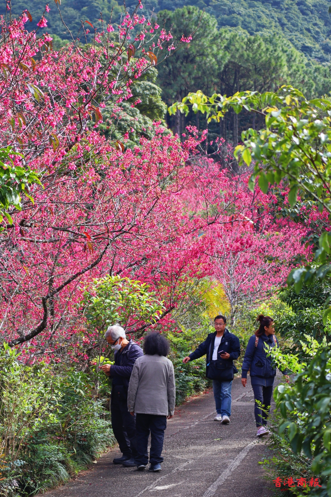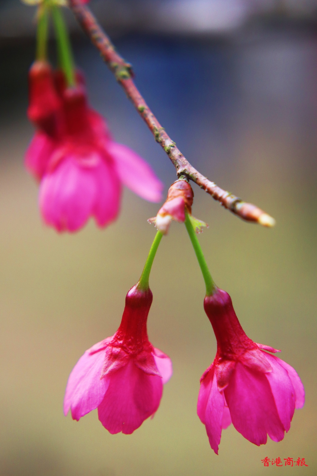 冬去春來,大地回暖,百花待放,大埔嘉道理農場暨植物園的鐘花櫻桃亦加入爭艷行列,園內鐘花櫻桃有逾百株,散落在嘉道理兄弟紀念亭至觀音山山頂一帶,當中較多位於上山區胡挺生先生紀念亭附近,那裏種有數十株鐘花櫻桃(即是台灣的山櫻),櫻花形狀像是一個個垂下的粉紅色吊鐘。雖然有別於日本普遍的染井吉野櫻花,但同樣顏色鮮艷,別具特色,不但吸引不少愛花之人,也吸引不少鳥兒前來覓食。鐘花櫻桃一般花期只有約兩星期,要把握時間前往。(馮瀚文攝)