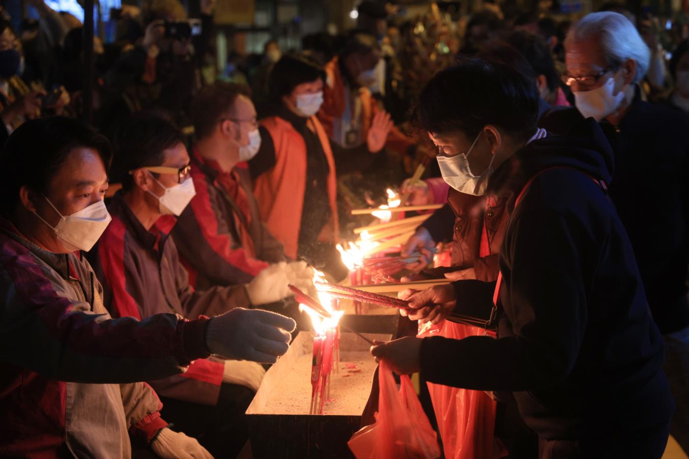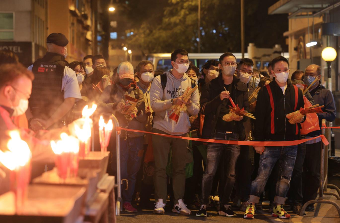 紅磡觀音廟在周三(15日)晚上11時起通宵開放,大批市民提前在廟外排隊,警員在場維持秩序。根據規定,參拜善信只可以在廟外指定區域點香,最多帶三枝細香入廟。