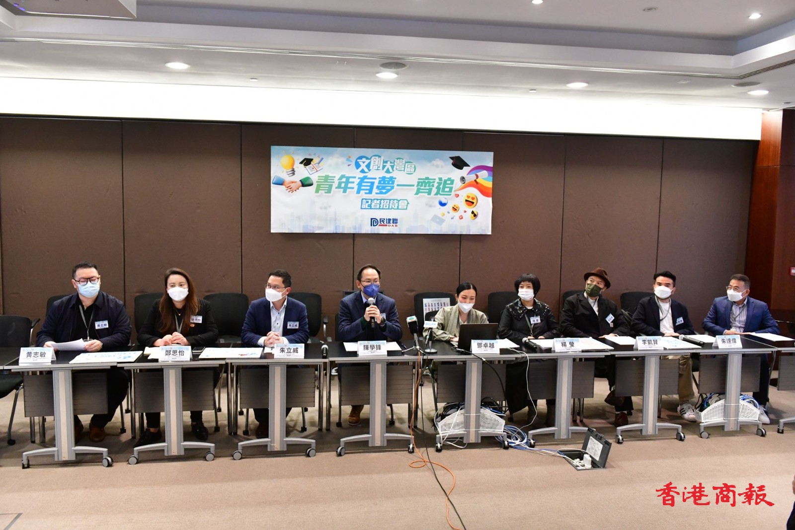 頂圖:第十四屆港區全國人大代表朱立威(左三)、民建聯副主席陳學鋒(左四)、香港青年藝術家鄧卓越(左五)等人出席記者會。