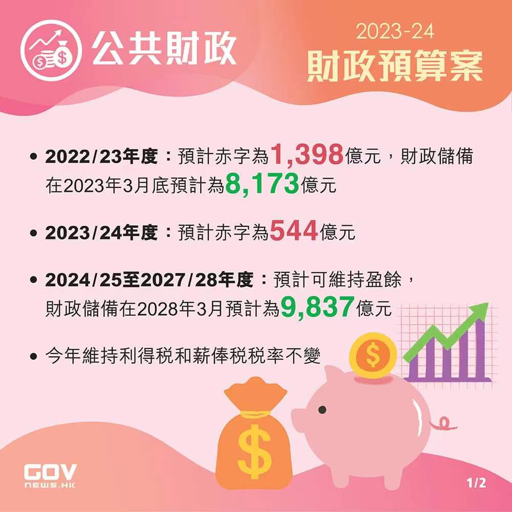 陳茂波指出,去年本港經濟受疫情打擊,同時環球央行大力收緊貨幣政策,嚴重削弱外圍經濟動力,影響本地經濟狀況。政府的收入不如預期,本財政年度的利得稅收入將較初時估算為低。股市和樓市疲弱,令印花稅收入比預期少,樓市疲弱亦影響地價收入。再加上在去年財政預算案宣布後推出「2022保就業」計劃,以及去年防疫抗疫涉及的大額開支,本財政年度的財政狀況較預期差。雖然年內已適時因應疫情減退而節省部分防疫抗疫的開支,但估計仍將錄得約1400億元赤字,高於原來預算的約560億元,財政儲備則會下降至約8200億元的水平。