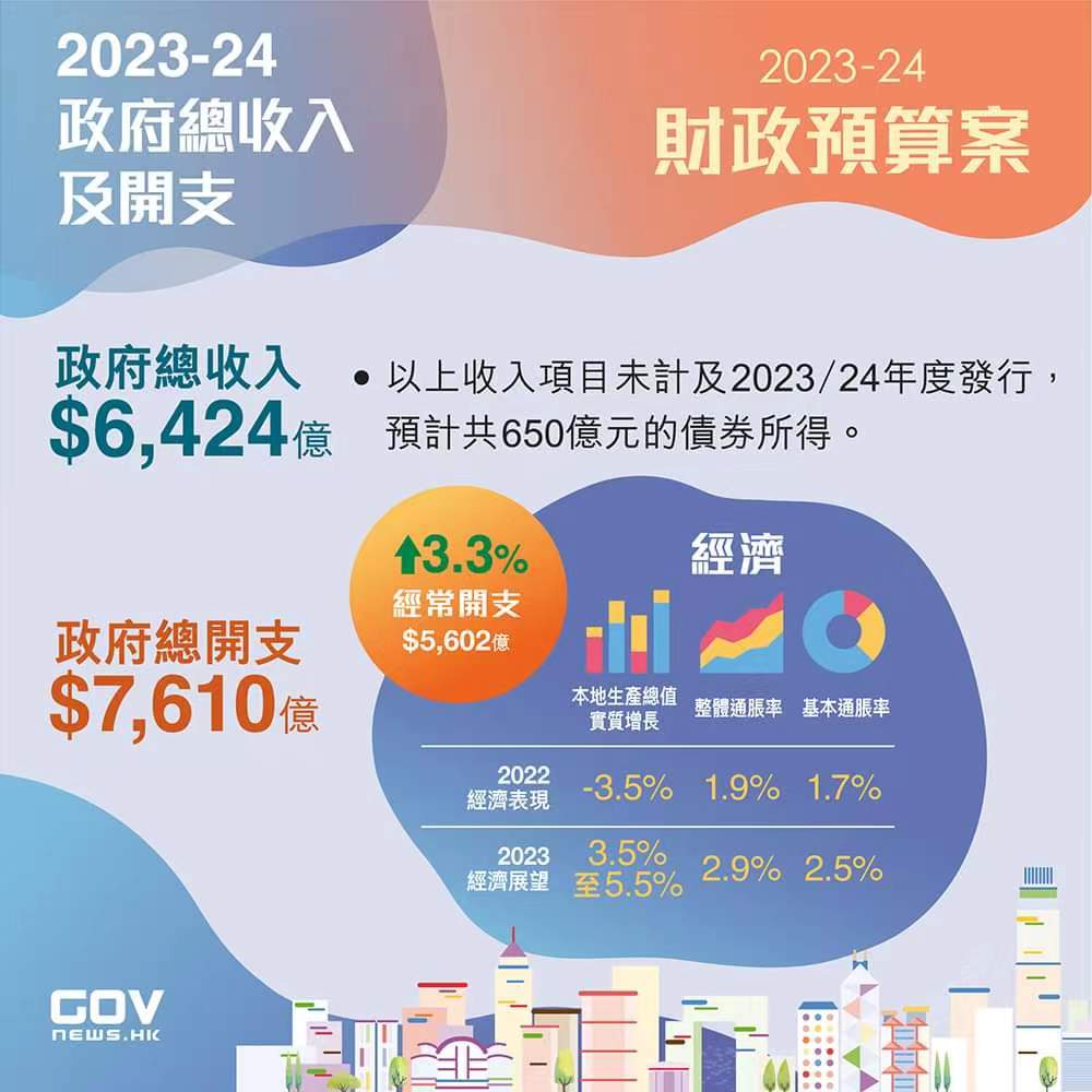 財政司司長陳茂波今日(22日)發表最新一份財政預算案。他表示,2023/24年度政府整體開支將會下降6%至7610億元,總收入預計為6424億元。連同2023/24年度政府債券發行額約650億元,年度赤字預計為544億元,財政儲備亦將下降至7629億元,相等於12個月政府開支。