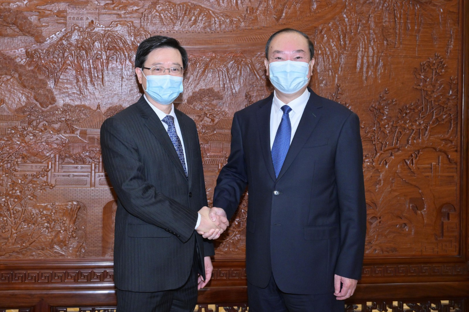 李家超(左)在廣州與廣東省委書記黃坤明(右)會面。