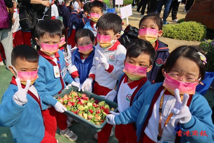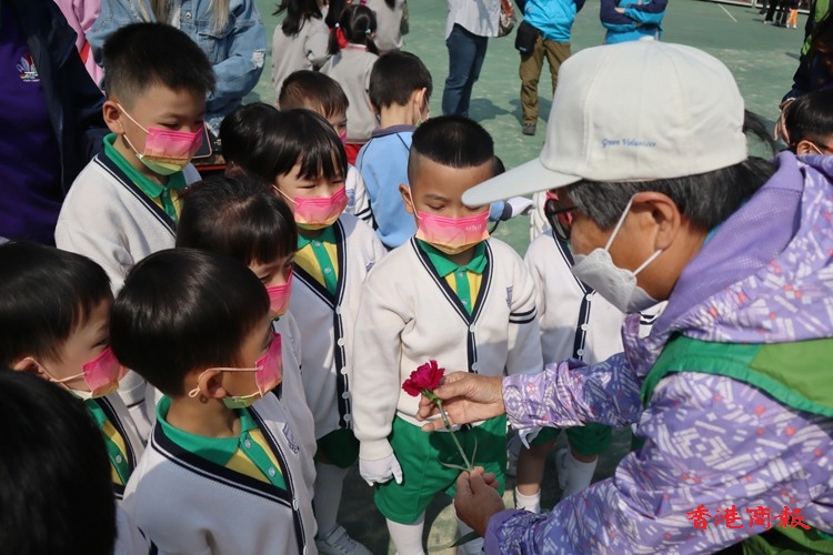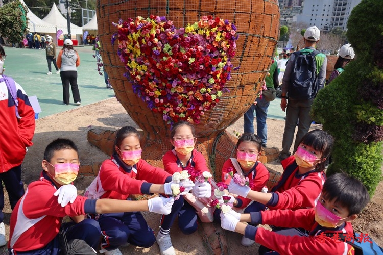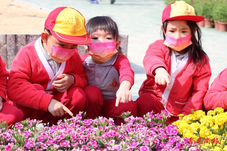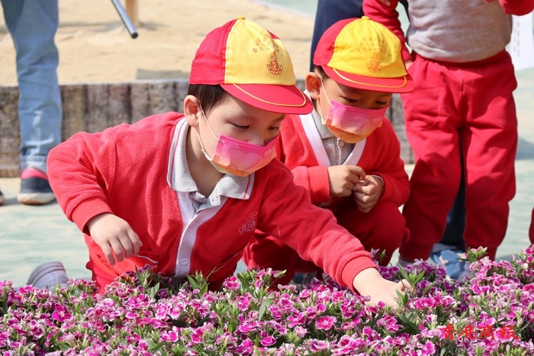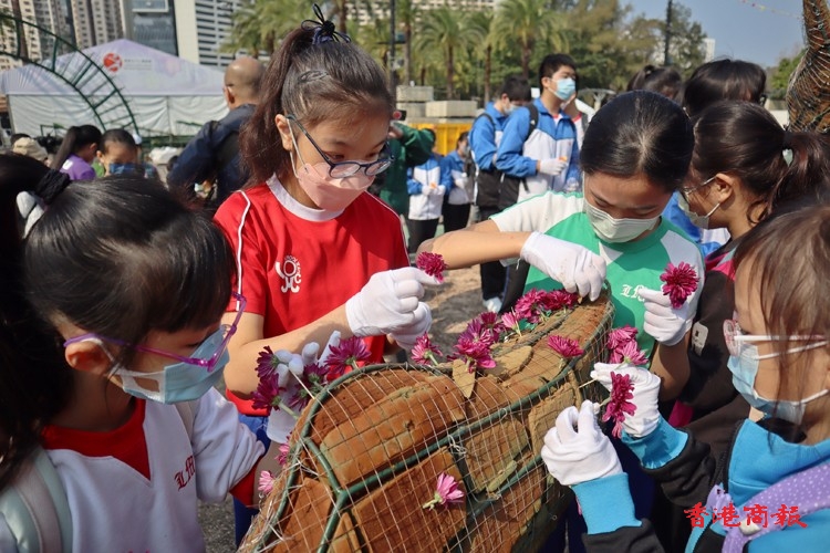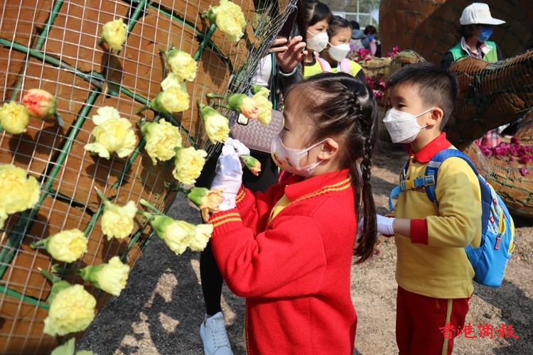年紀細小的學生小心翼翼地把小小的花朵插在造型各異的花壇上,年紀較大的則盡顯心思,在花壇上砌出心形等圖案。