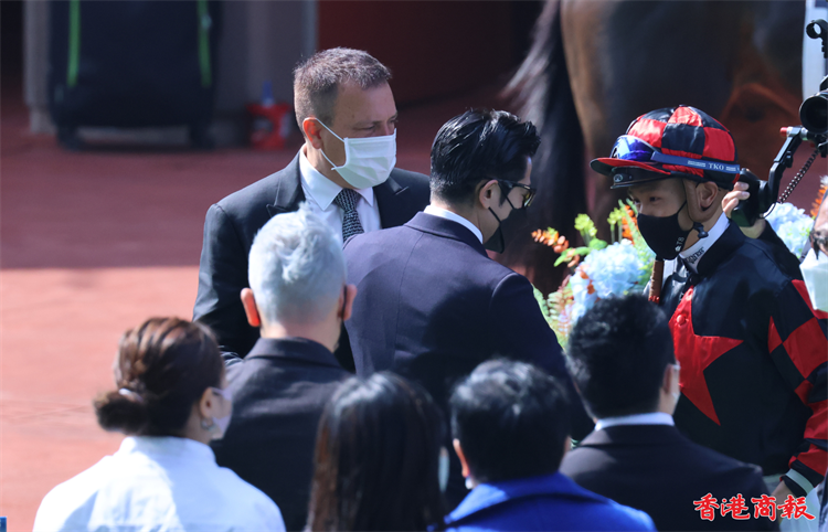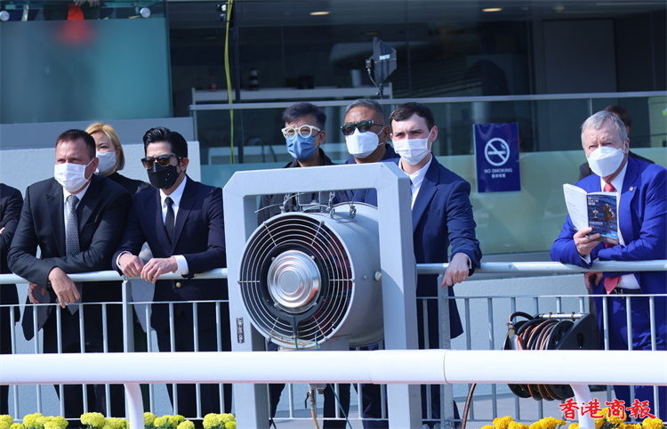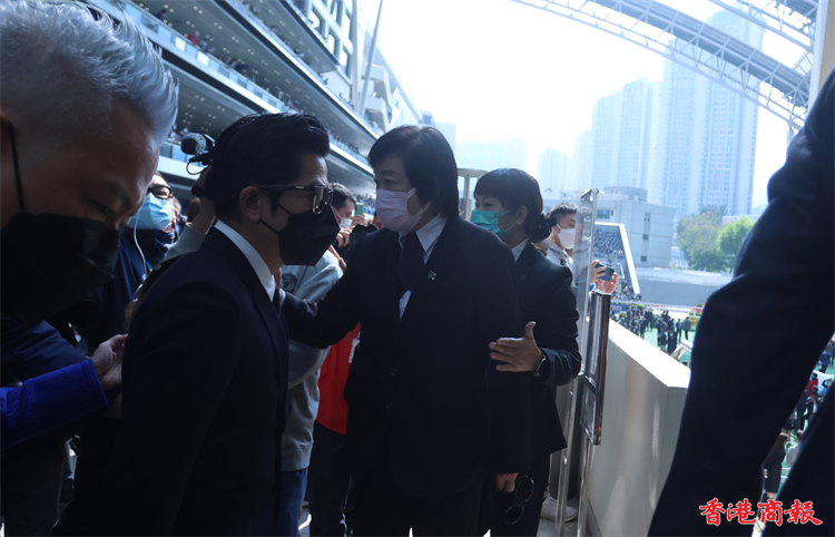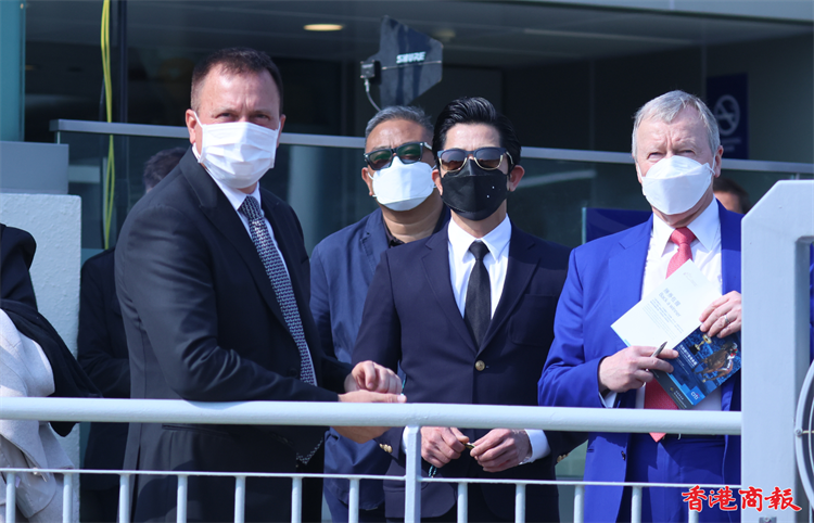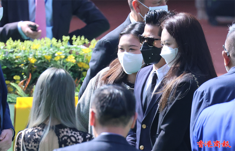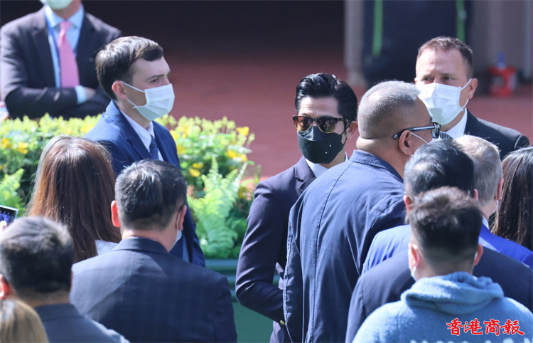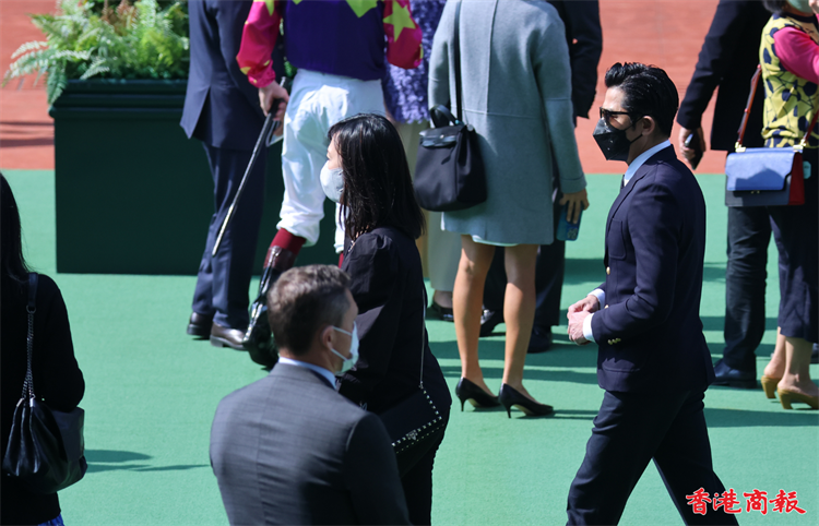 「舞林密碼」今日在港初次上陣,郭天王與經理人小美、兼排舞師Sunny Wong一早抵達沙田馬場,而太太方媛則未見蹤影。到第五場開跑前,一身黑色西裝、戴上黑超的城城親自落到馬匹亮相圈睇「舞林密碼」,期間亦與亮相圈人士自拍。