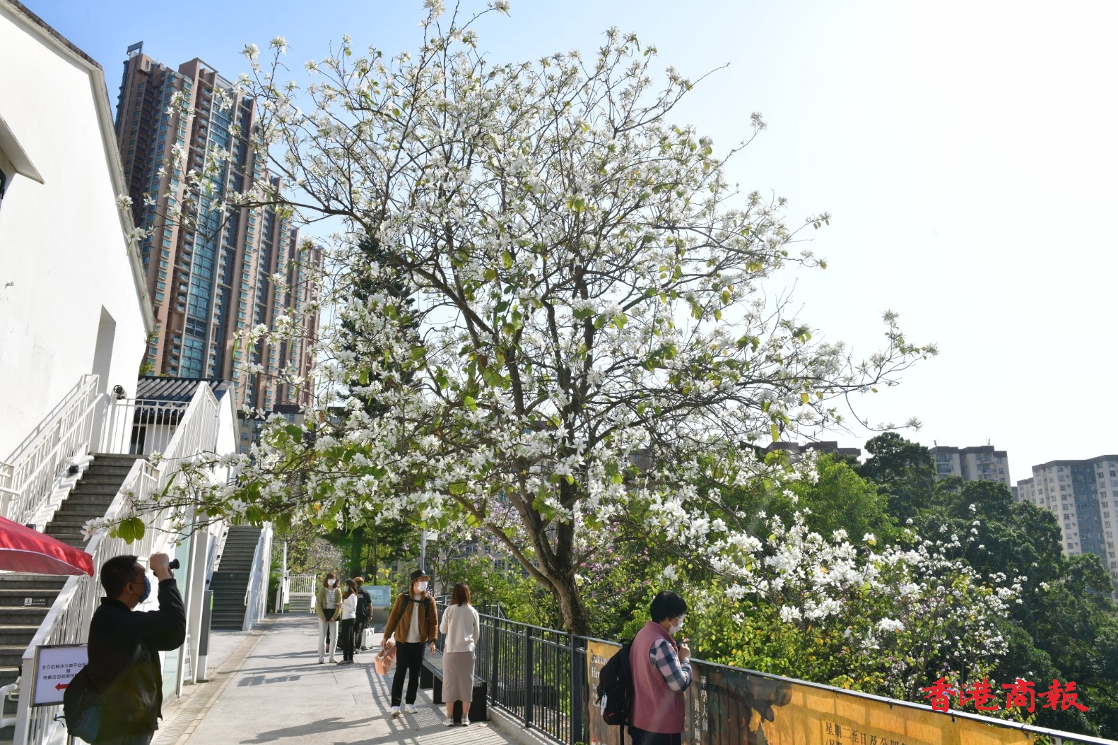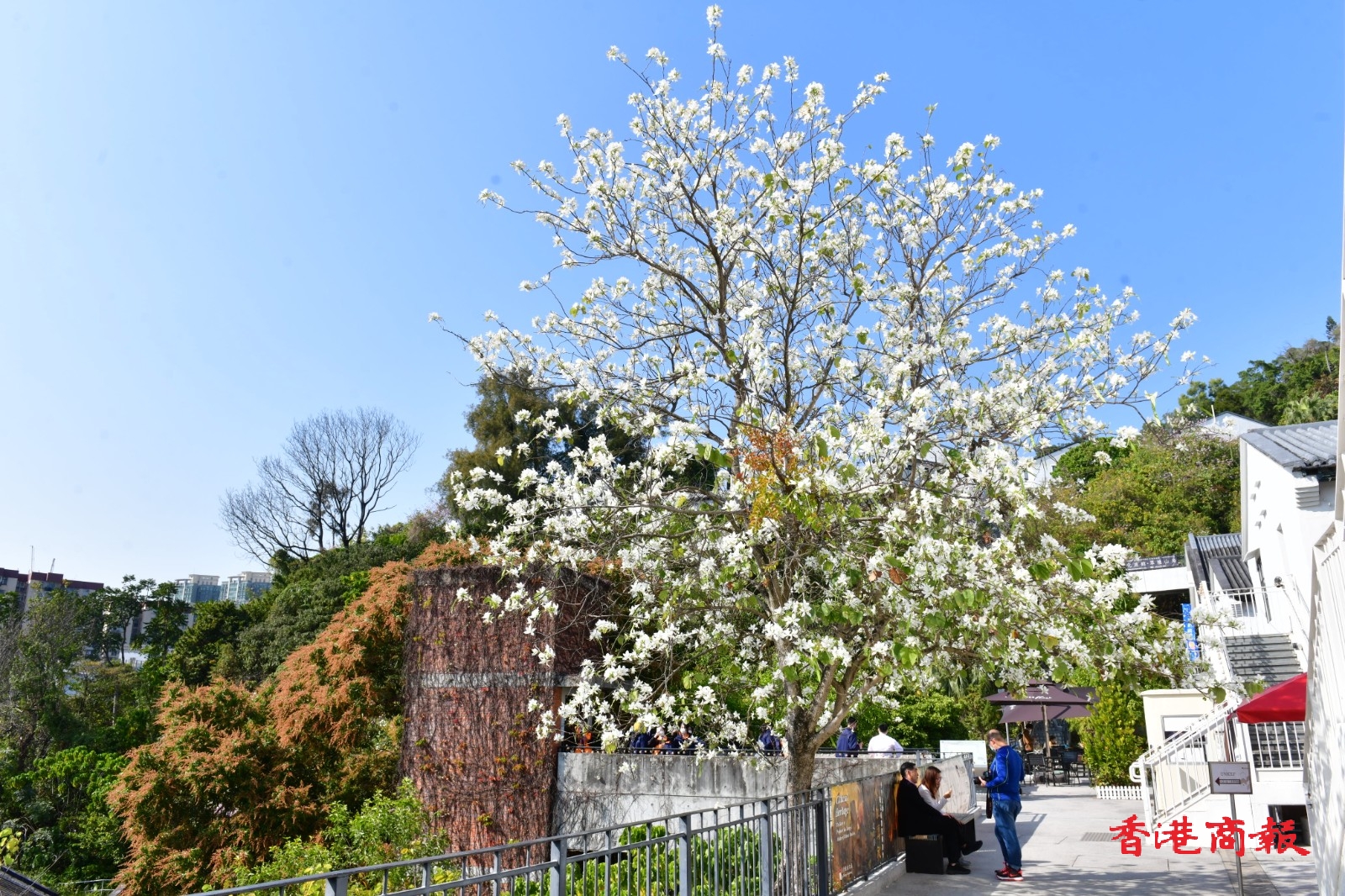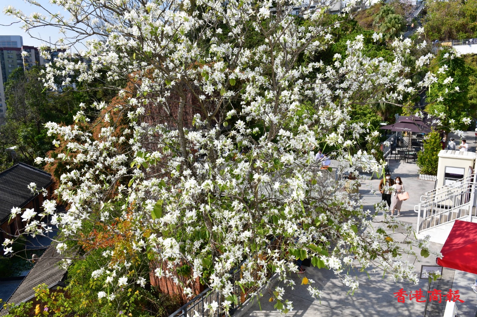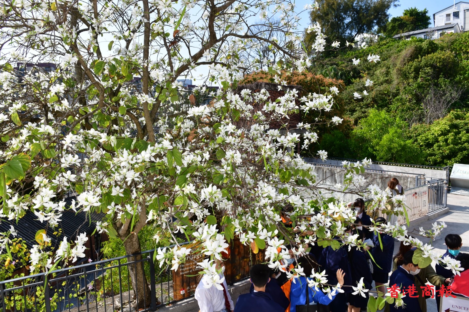 白花羊蹄甲樹長得茁壯,屹立在文化館一帶山坡上,盛開的白花布滿樹上,形成漫天花海。今日天朗氣清,天空湛藍無雲,白花羊蹄甲樹為整個饒宗頤文化館更添唯美夢幻感,就如一幅美輪美奐的山水畫。放慢腳步、駐足欣賞這個城市綠洲,感到格外清新怡人。(記者 崔俊良 攝)