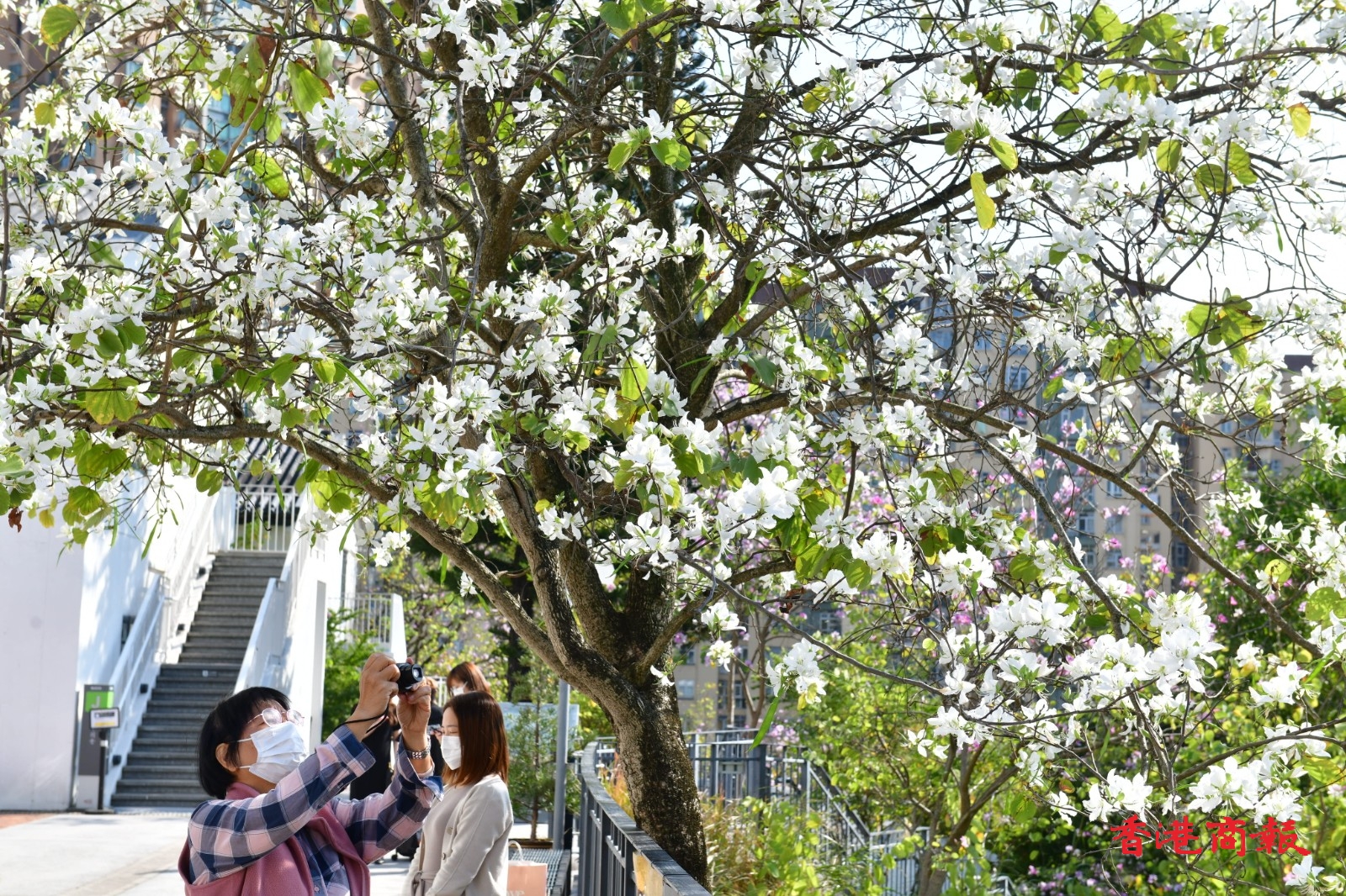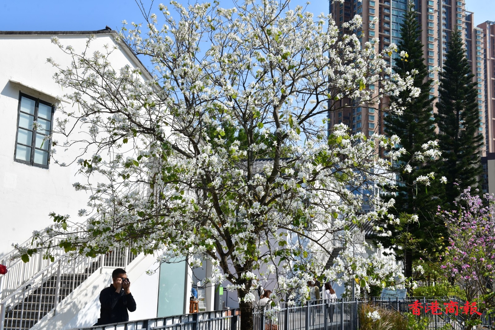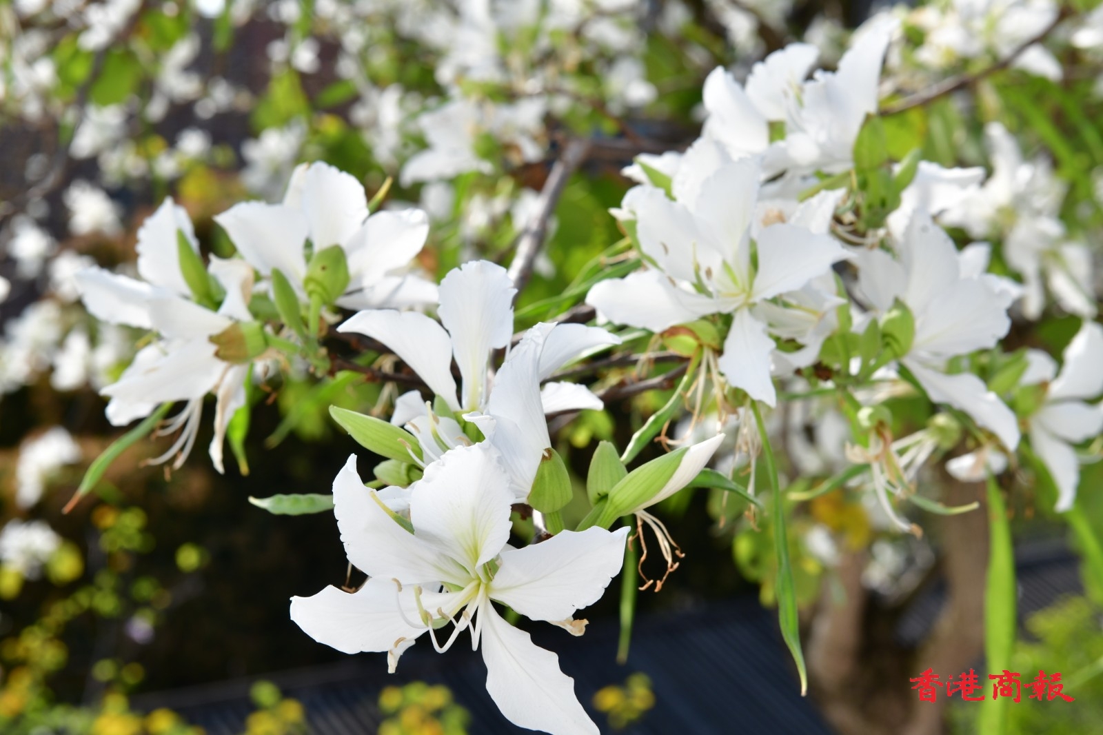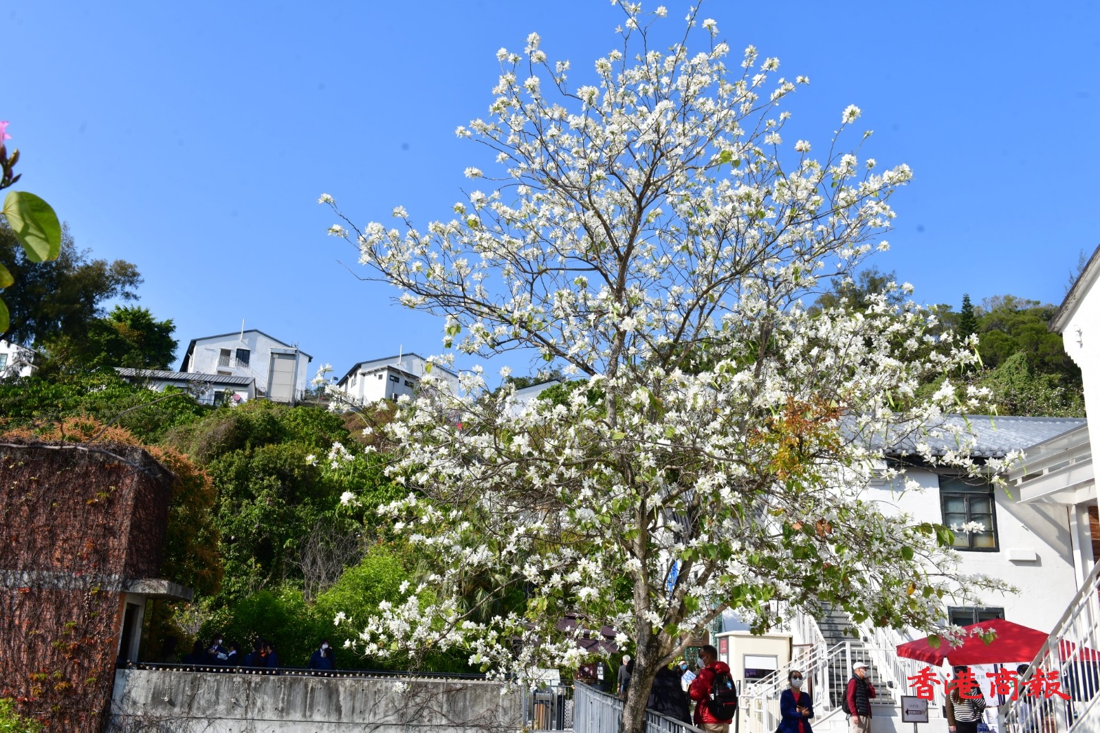 白花羊蹄甲樹長得茁壯,屹立在文化館一帶山坡上,盛開的白花布滿樹上,形成漫天花海。今日天朗氣清,天空湛藍無雲,白花羊蹄甲樹為整個饒宗頤文化館更添唯美夢幻感,就如一幅美輪美奐的山水畫。放慢腳步、駐足欣賞這個城市綠洲,感到格外清新怡人。(記者 崔俊良 攝)