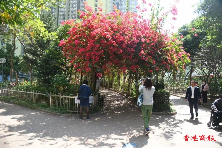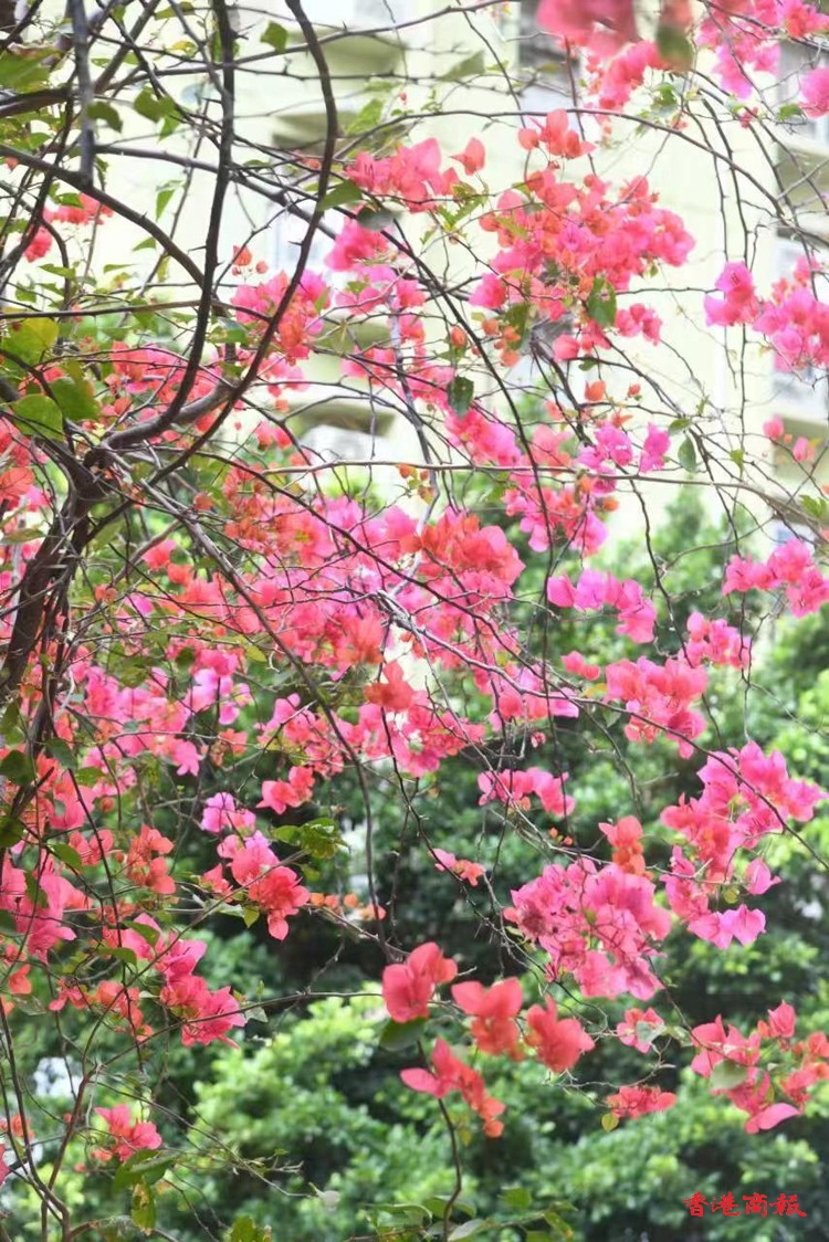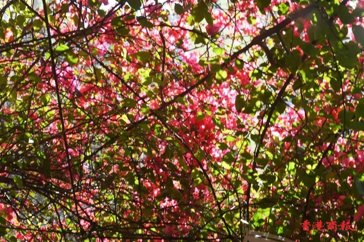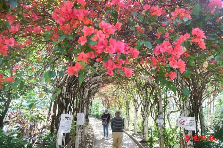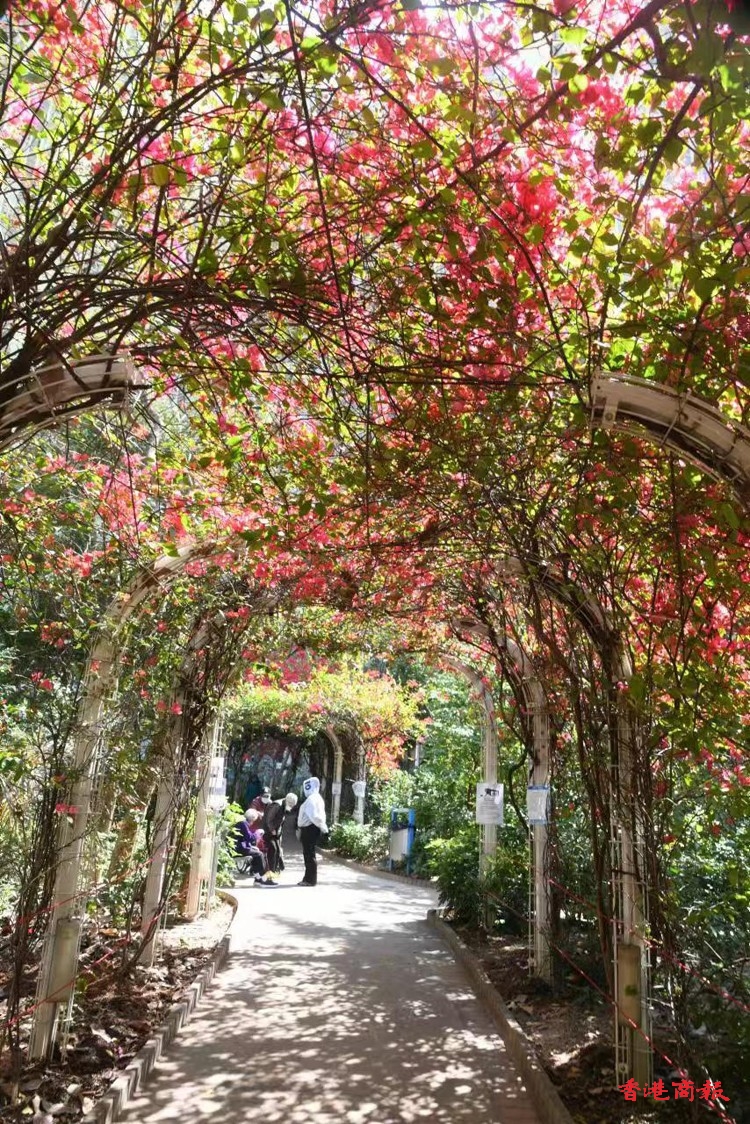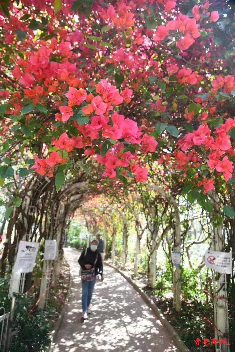 春天百花齊放,香港各地都迎接各式花卉盛開,其中一種簕杜鵑花在路傍及公園都有大量種植。在長沙灣元洲邨就有一條全港獨有的花花隧道,全長30米,近年每逢3至4月都會吸引大批影友到來拍攝,更有不少愛侶來拍攝婚紗照,看着盛放的簕杜鵑花,心情自然好。今年花花隧道以前面最茂盛,在陽光影照下透出紅光,美不勝收。(記者 蔡啟文攝)
