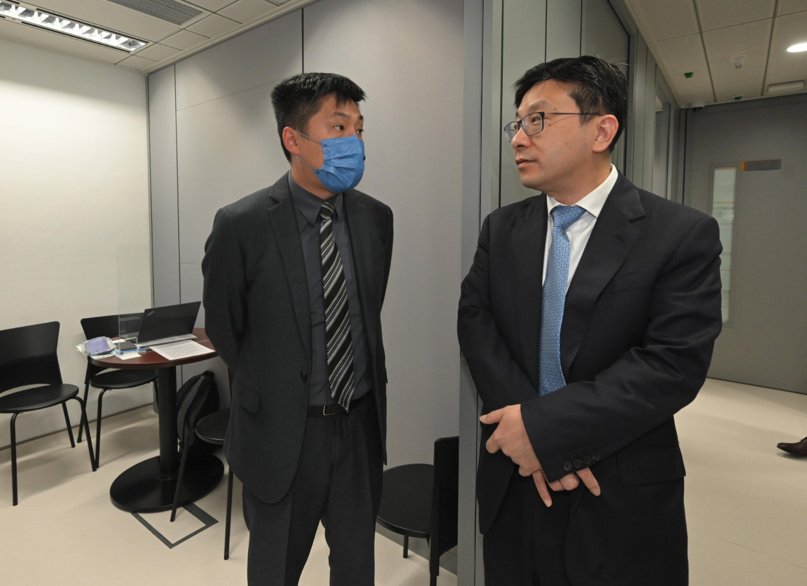 勞工及福利局局長孫玉菡今日(3月1日)下午視察位於長沙灣庫務大樓的飲食業招聘中心及零售業招聘中心,了解勞工處在香港全面撤銷「口罩令」及經濟活動復常後加強的就業服務。