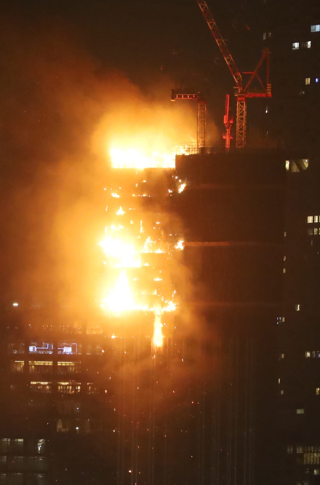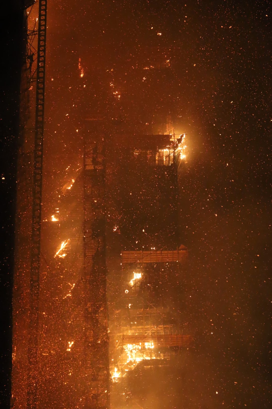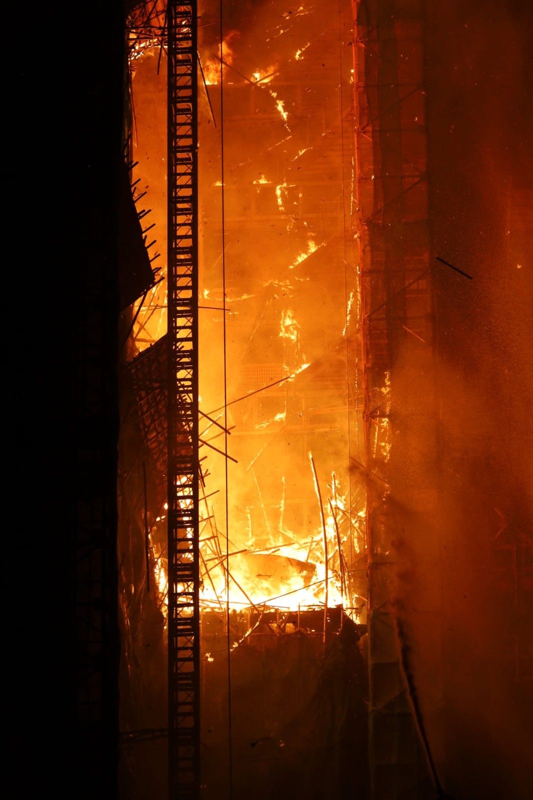 地盤多個樓層起火,在港島區亦可見到火光熊熊。