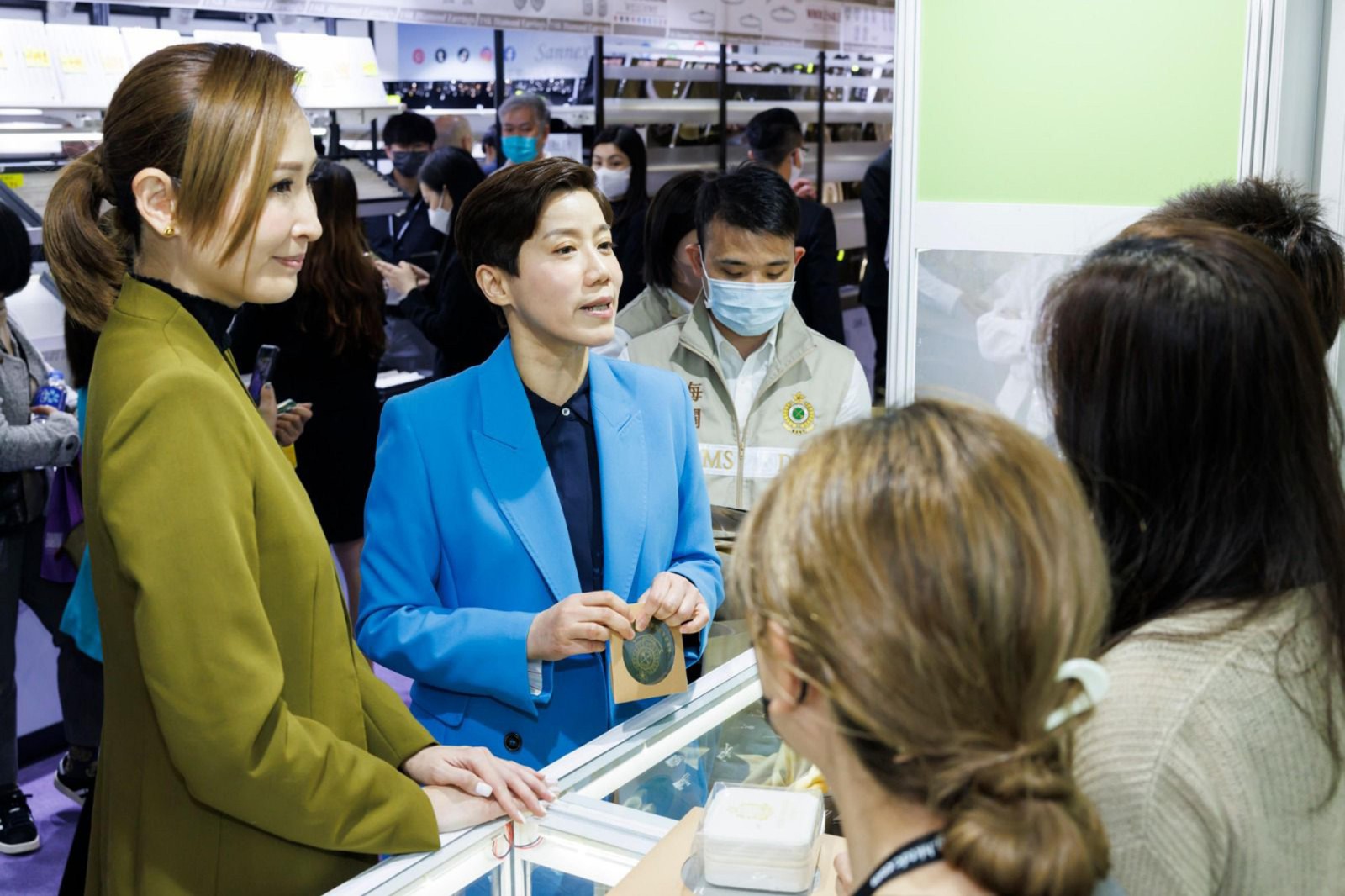 對談環節後,何珮珊及陳貝兒一同參觀珠寶展內其他攤位,向內地、海外及本地參展商介紹新法例要求和派發宣傳品。