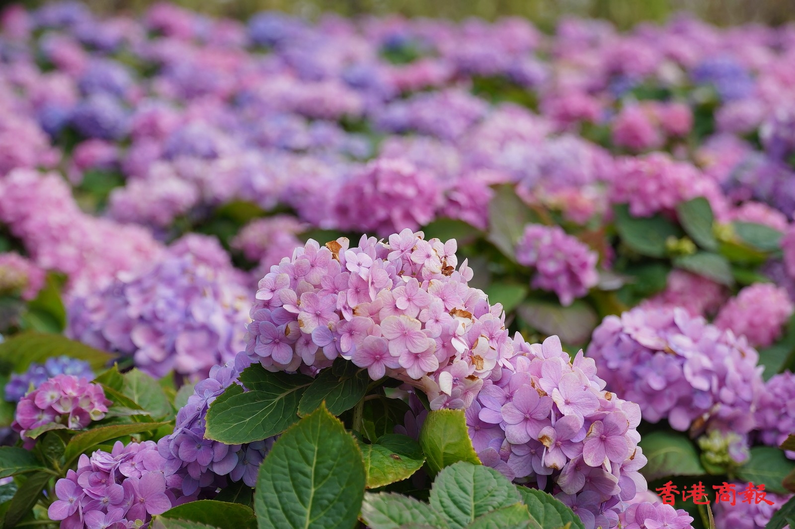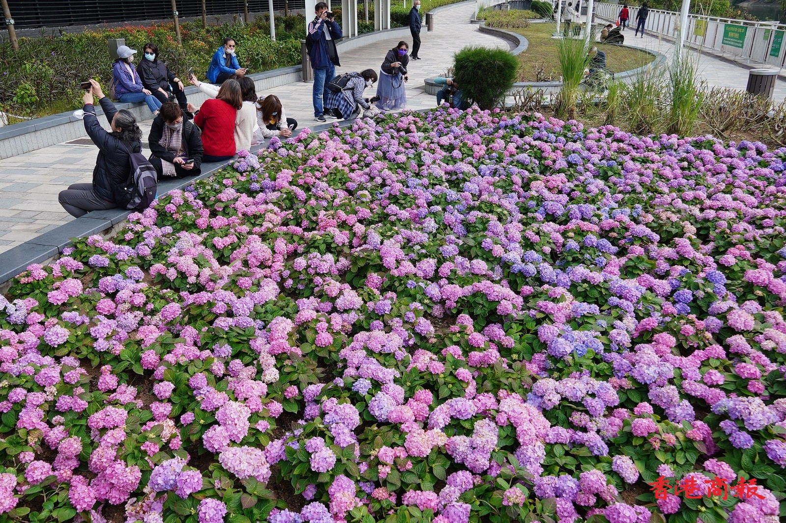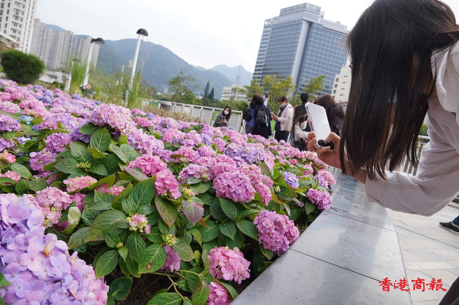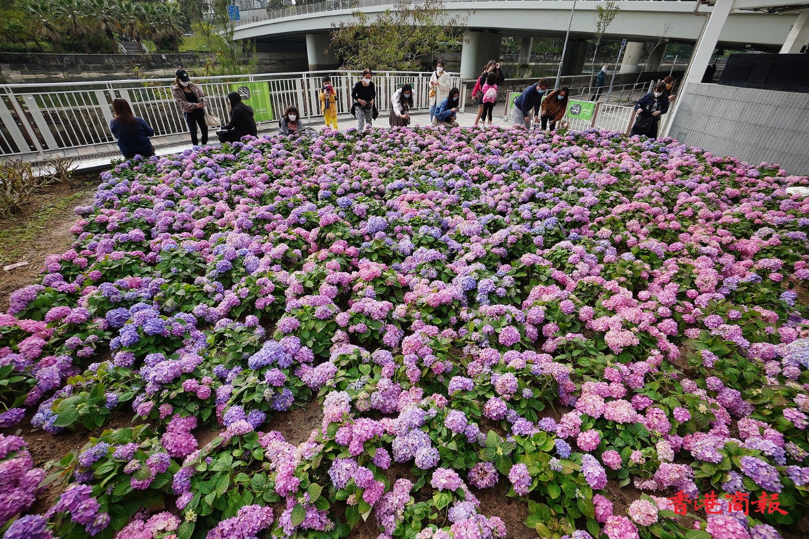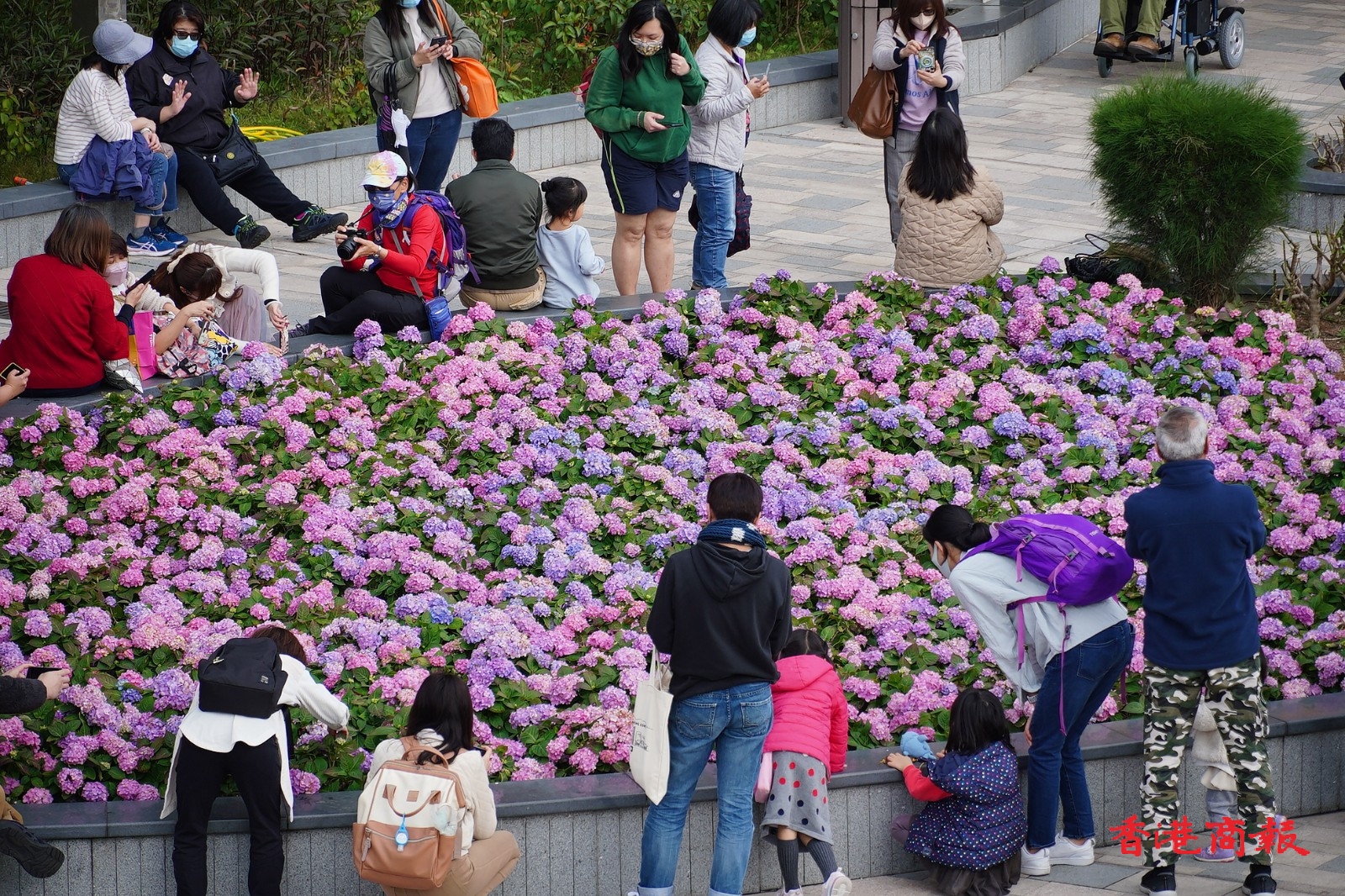上周剛過二十四節氣之一春分,全港各區生氣洋溢,處處都是「小桃源」。鄰近沙田小瀝源碩門邨的石門河濱花園,有一小花圃栽種着滿滿的繡球花,色彩繽紛,形成春天獨有景象。花圃雖小,但因交通方便,從港鐵石門站B出口步行約五分鐘便可抵達,在色彩繽紛的繡球花展現新姿之下,吸引了不少市民來觀賞打卡。 (記者 俊文攝)