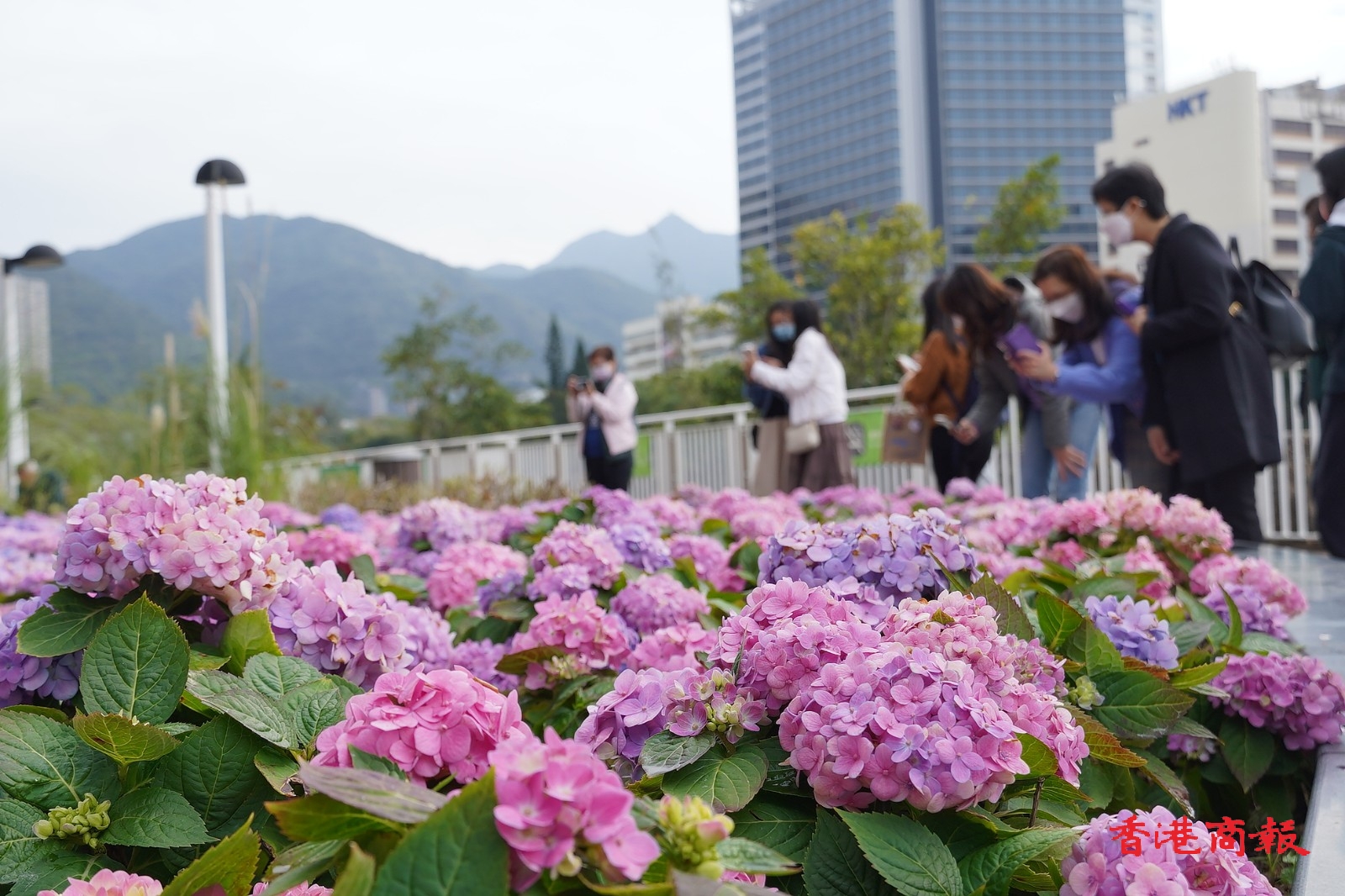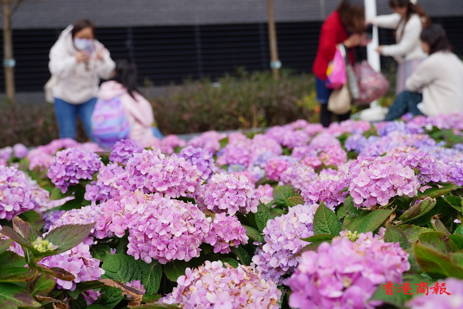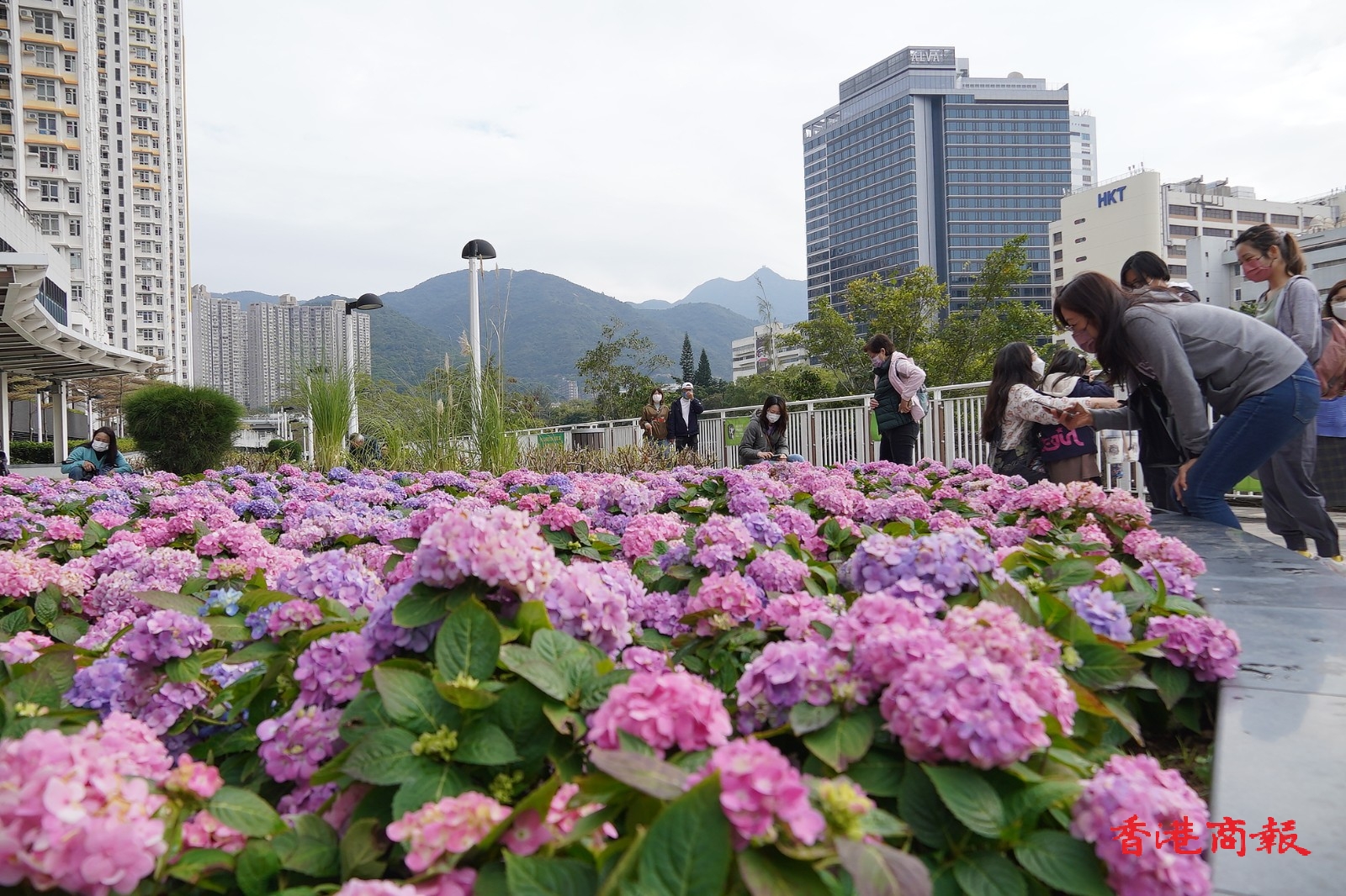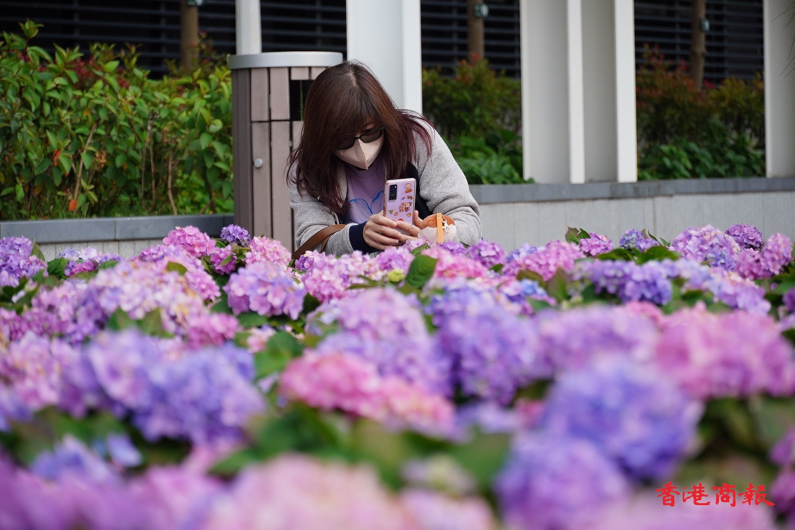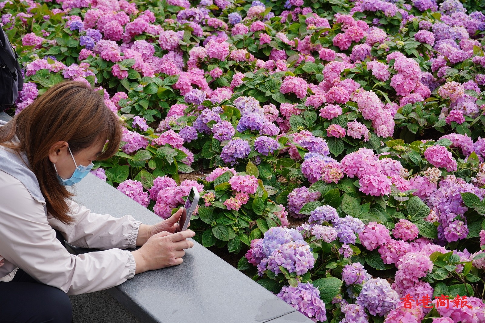 上周剛過二十四節氣之一春分,全港各區生氣洋溢,處處都是「小桃源」。鄰近沙田小瀝源碩門邨的石門河濱花園,有一小花圃栽種着滿滿的繡球花,色彩繽紛,形成春天獨有景象。花圃雖小,但因交通方便,從港鐵石門站B出口步行約五分鐘便可抵達,在色彩繽紛的繡球花展現新姿之下,吸引了不少市民來觀賞打卡。 (記者 俊文攝)