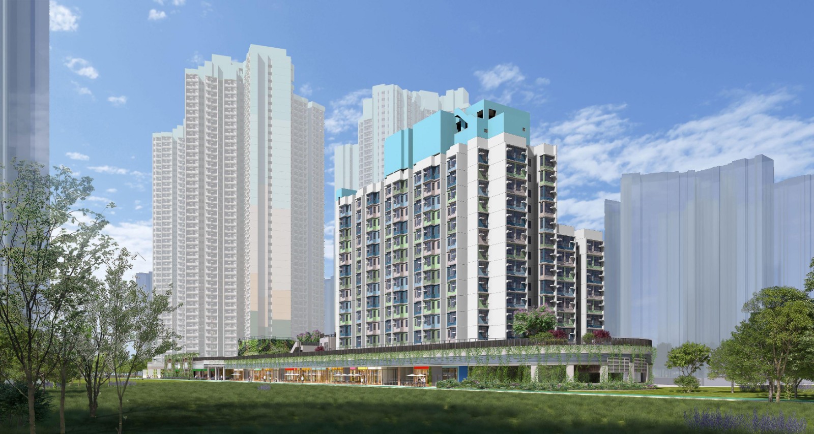東涌第99區公營房屋發展項目內的「組裝合成」建築法項目,一幢12層高的住宅大樓的完工構想圖。政府新聞處