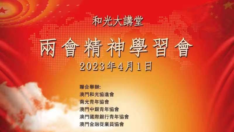 為讓各界人士深刻領會、學習兩會精神,交流互鋻,澳門和光協進會聯合南光青年協會,澳門中銀青年協會,澳門國際銀行青年協會及澳門金融從業員協會,於今日(4月1日)上午10時在澳門中銀大廈3樓會議室舉行「和光大講堂之兩會精神傳達會」活動。活動特邀請澳區全國人大代表容永恩、澳區全國政協常委何潤生擔任主講嘉賓。澳門中聯辦經濟部二級主任科員歐淑瑩,澳門和光協進會會長柯海帆,澳門中銀青年協會監事長、澳門立法會議員顏奕恆,南光青年協會常務副理事長吳詩雅,澳門國際銀行青年協會副會長劉嘉麒,以及澳門金融從業員協會會長彭家偉等出席。