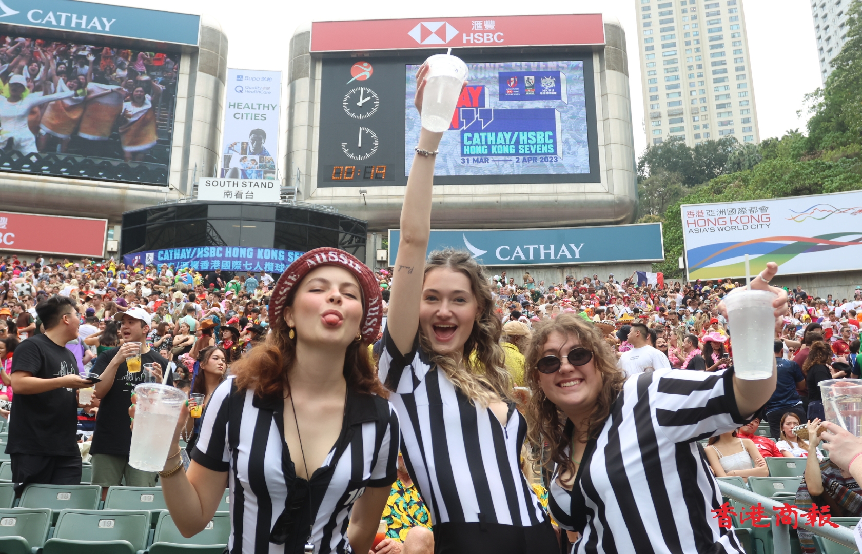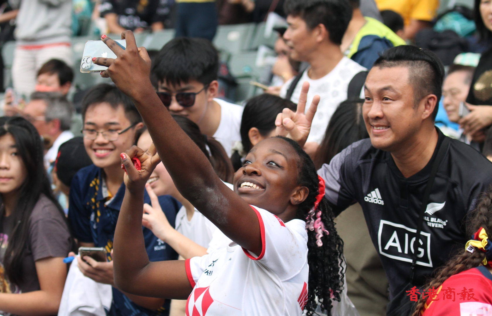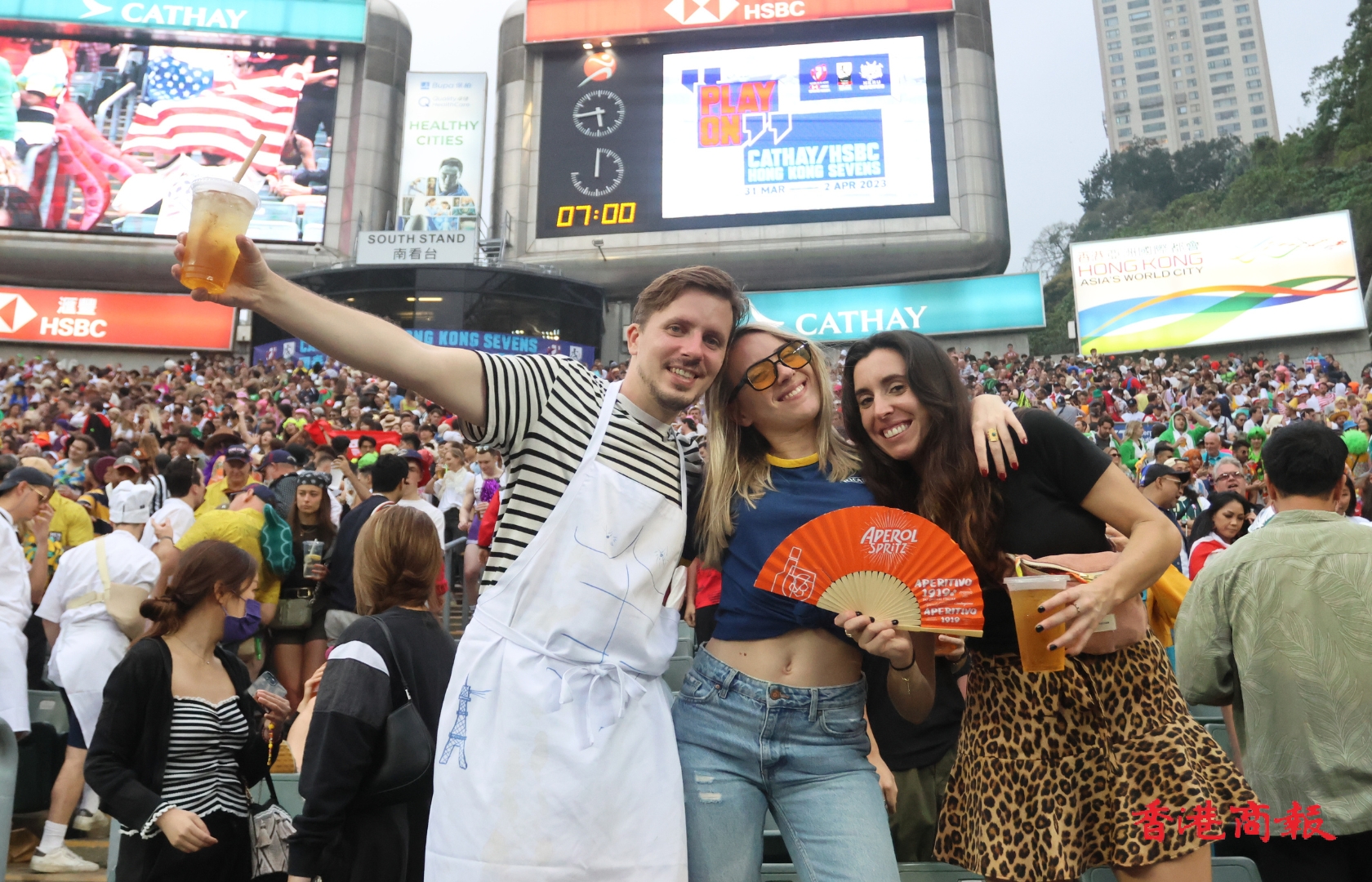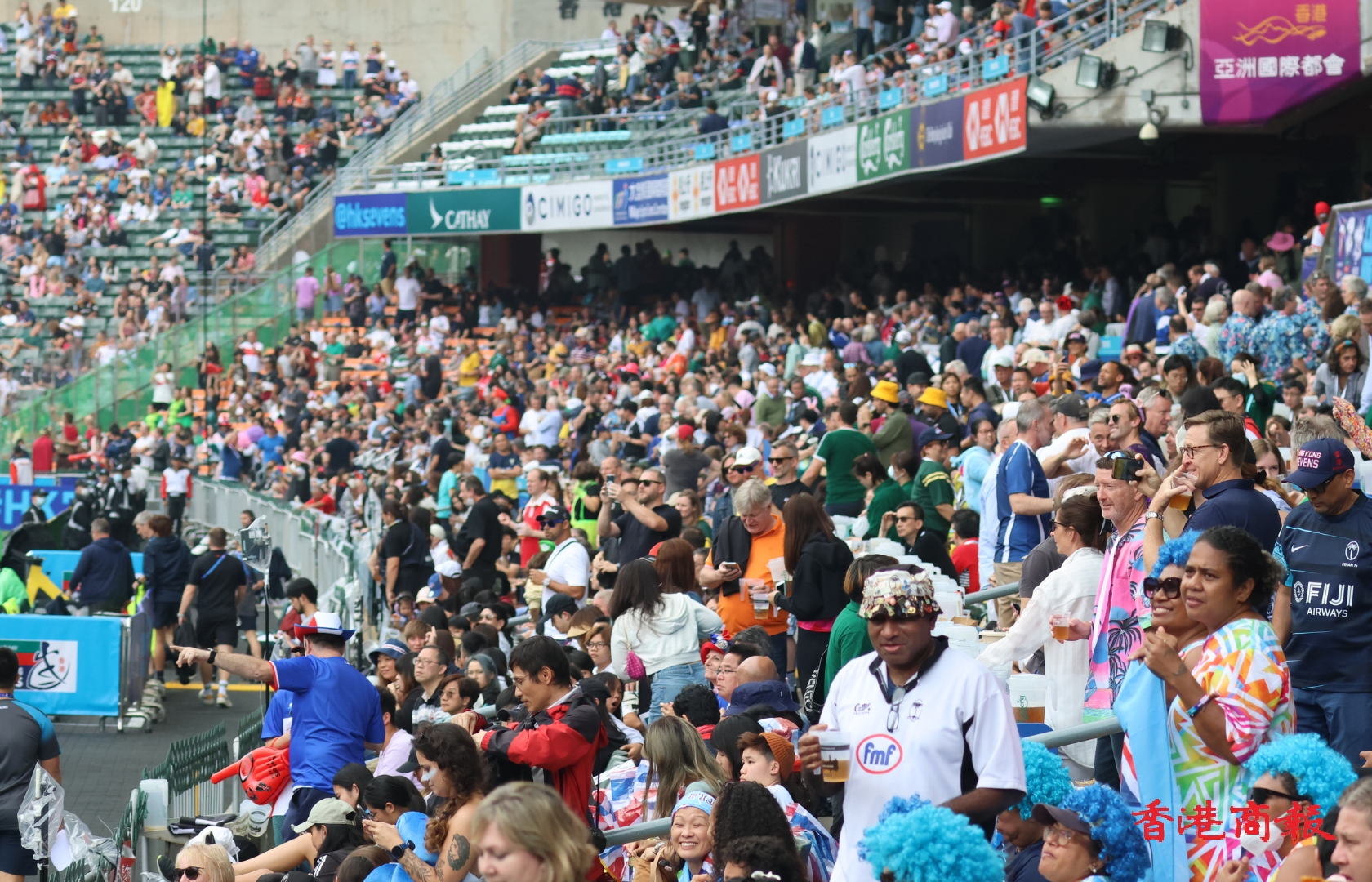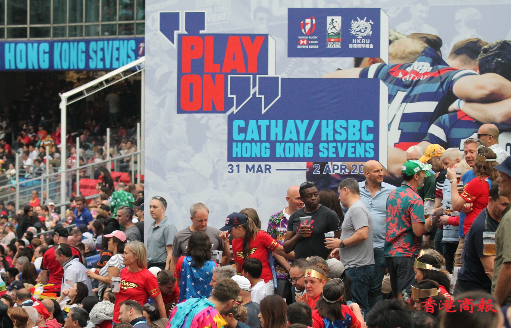 一連3日在香港大球場上演的「香港國際七人欖球賽」,4月1日進入次日賽事。本周連日有雨,首日賽事於綿綿細雨下進行,來到次日終於天公造美,場面同時躍動起來,全日入場總人數超過2.5萬人次,比首日多出2000多人。和暖的陽光照耀着恢復熱鬧的大球場,在場球迷全情投入,隨着唱曲載歌載舞,娛人娛己,享受七欖的非凡魅力。
