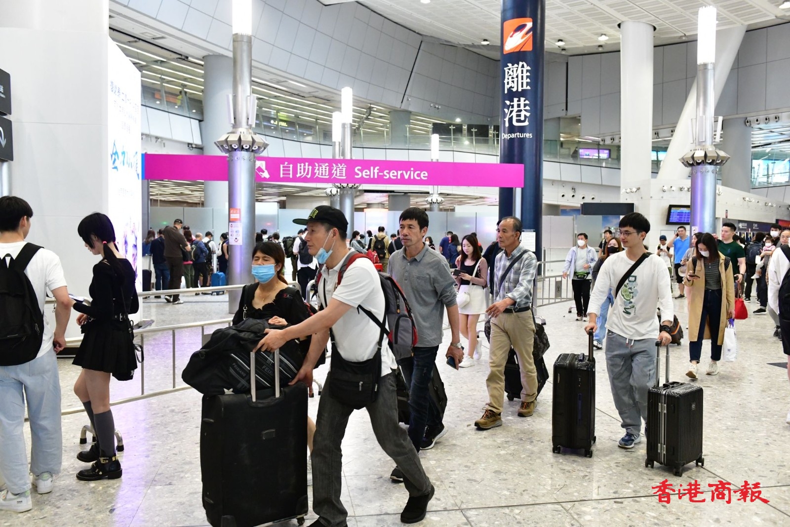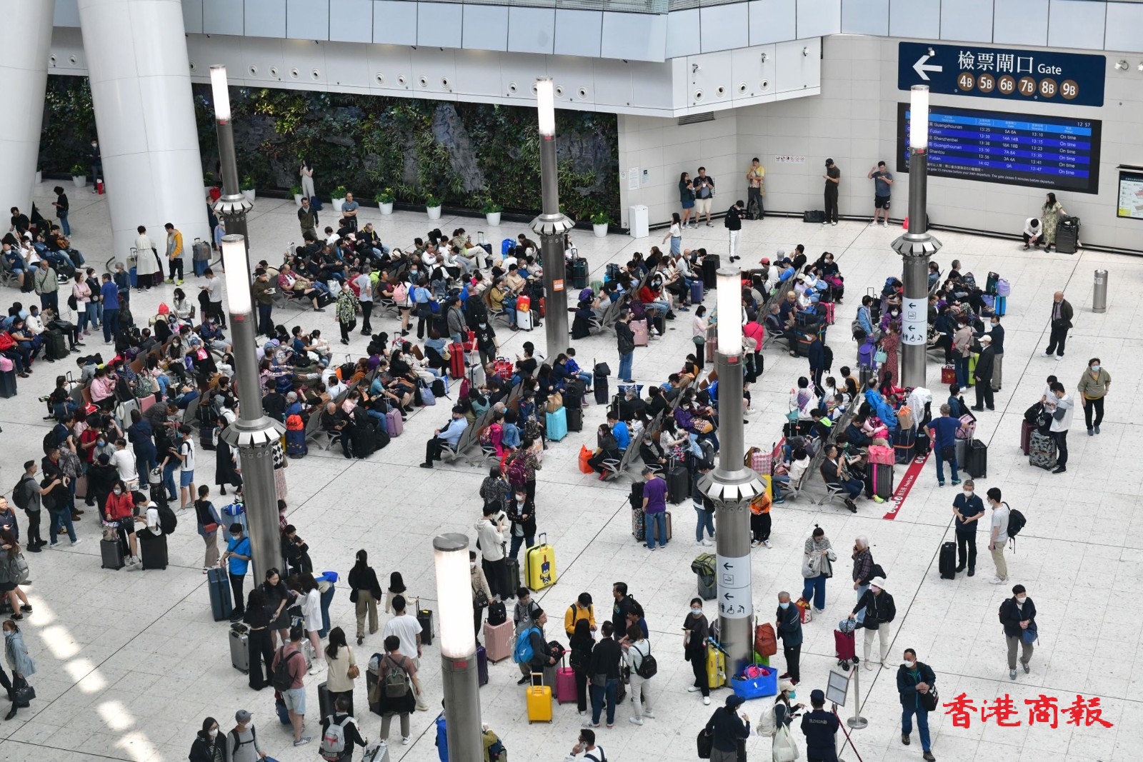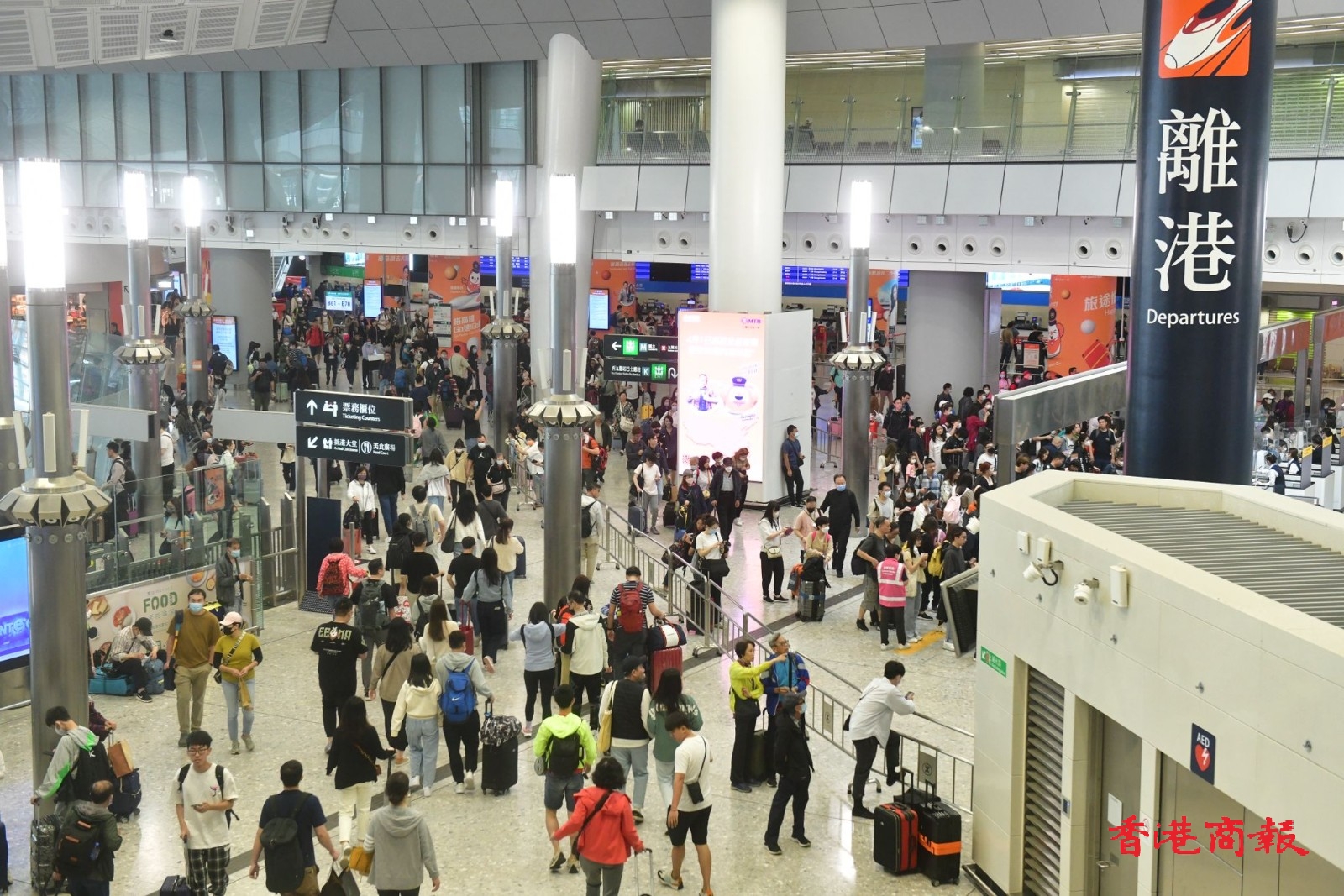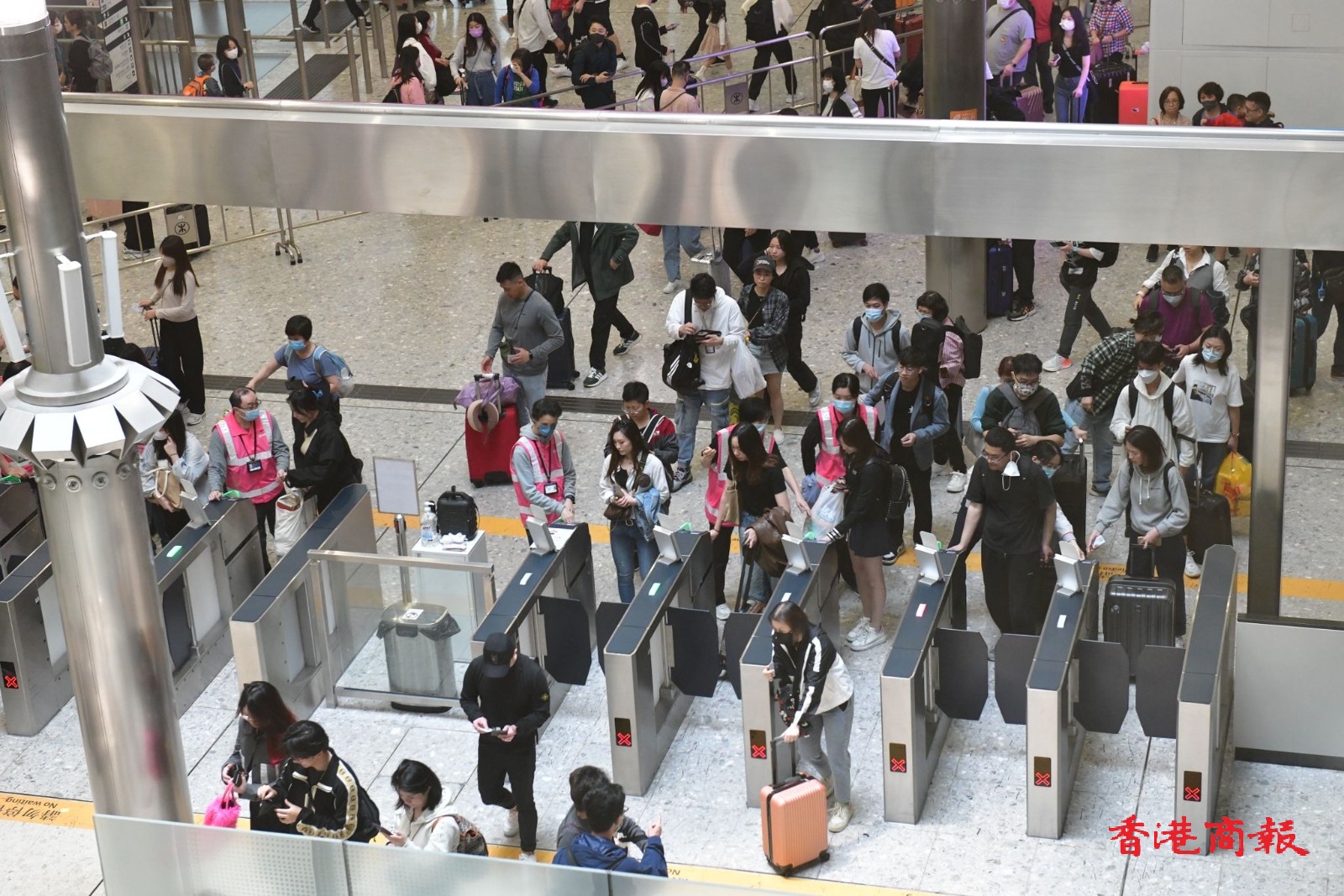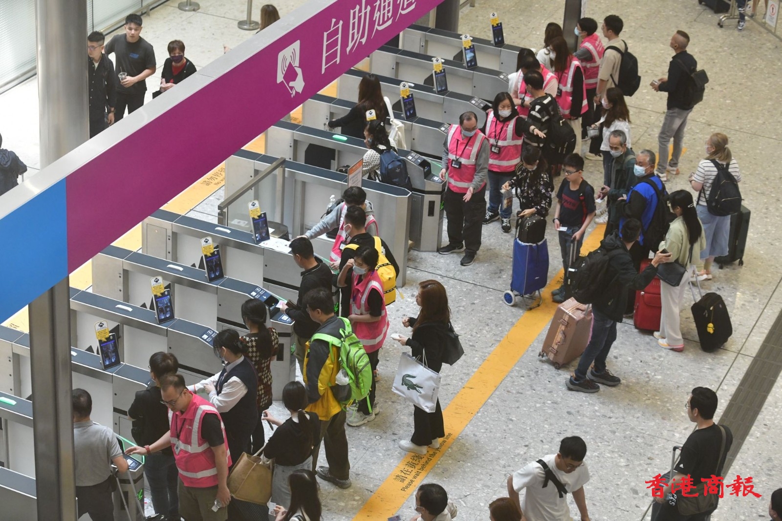 復活節假期今日(7日)開始,不少市民選擇外遊,西九龍高鐵站早上開始就有北上人潮,市民需要輪候入閘,現場秩序良好。港鐵在購票大堂安排職員為旅客派發復活節小禮品。入境處早前估計今日是陸路出境高峰期,預計超過52萬人次出境。