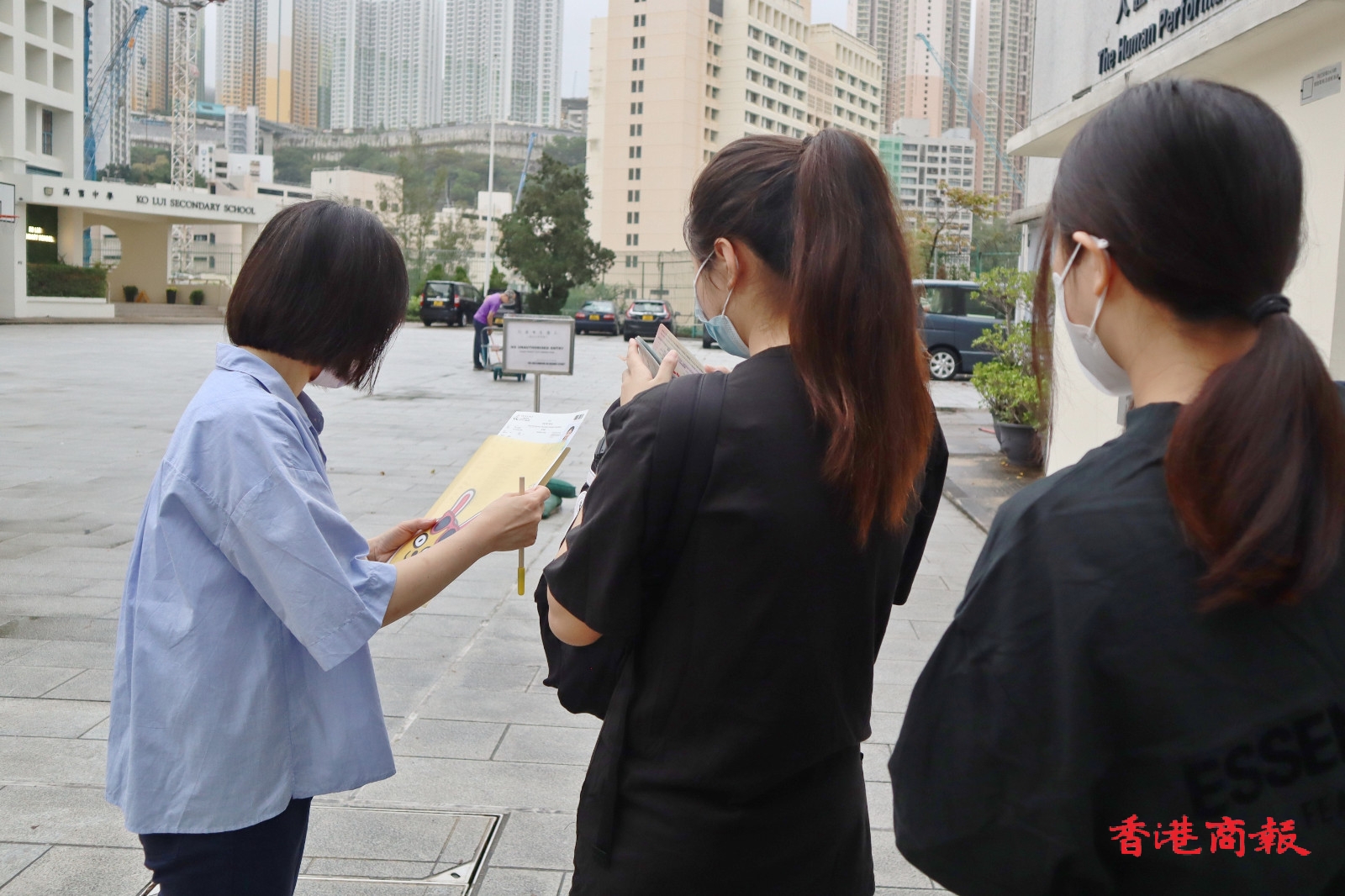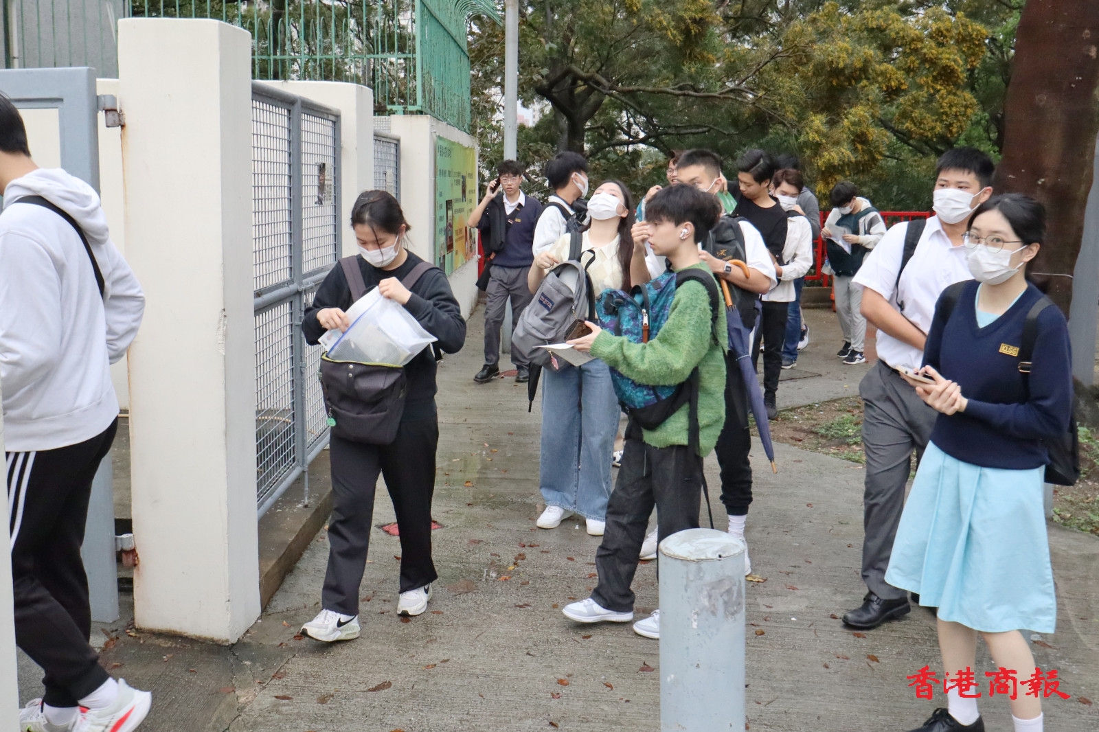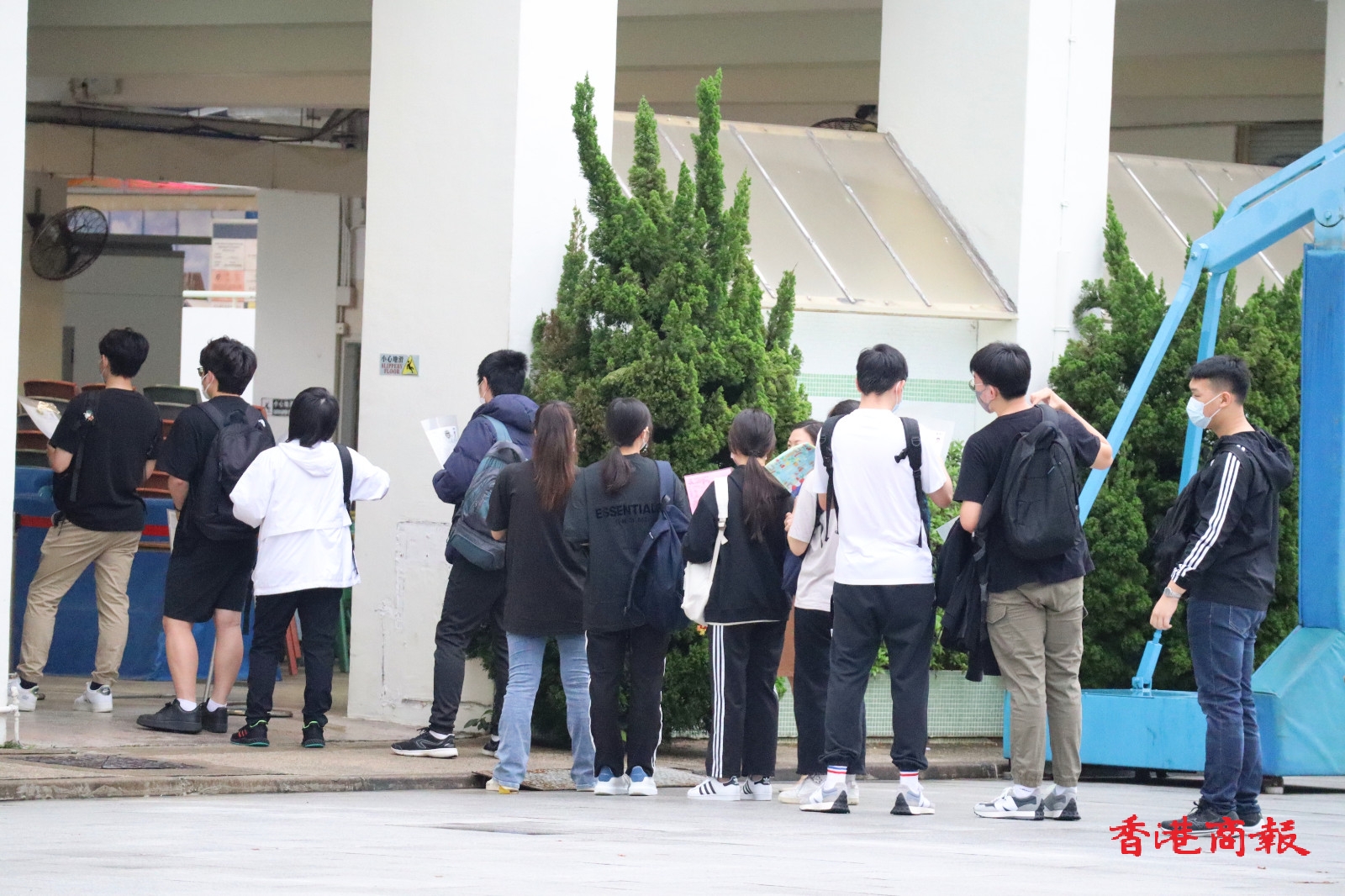 在觀塘的高雷中學早上7時已有應屆考生在試場門口等候,校方於上午7時45分開始安排考生核實身份後進入學校,之後學生排隊量度體溫,遞交健康申報表及登記才可進入考場。(馮瀚文攝)