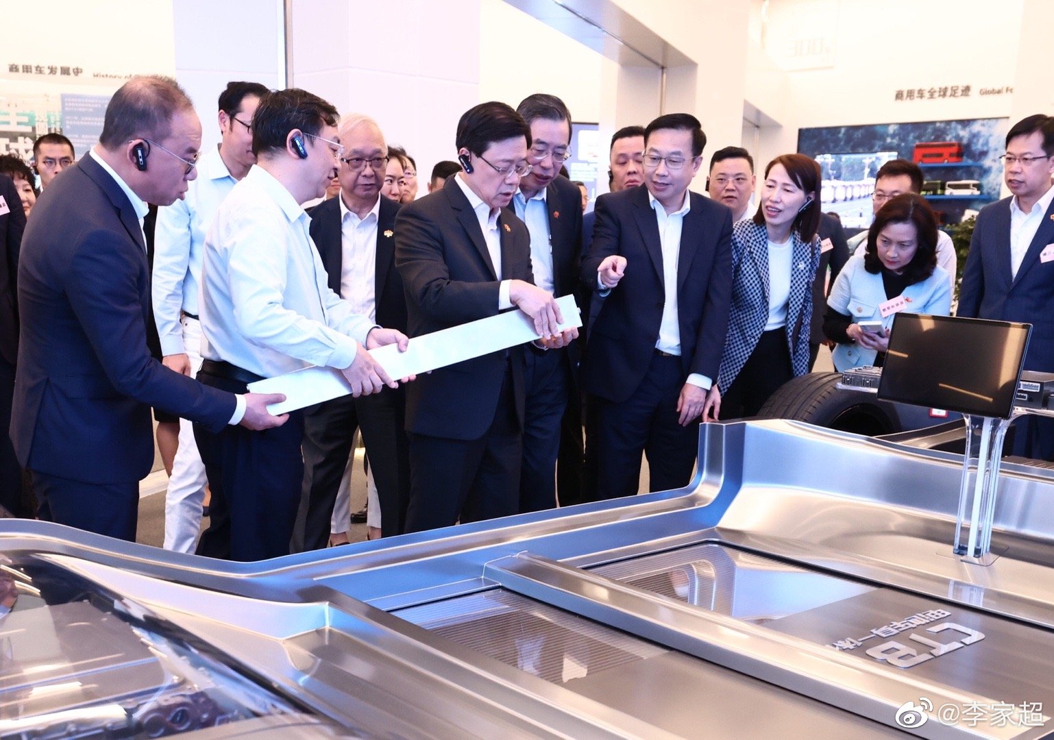 正率領政府官員和立法會議員考察大灣區的行政長官李家超,今日(22日)早上到比亞迪參觀。他在社交平台發文表示,在比亞迪考察時了解了電動車和軌道交通領域,包括「雲巴」的最新發展情況,可以協助政府在建設綠色智能集體運輸系統政策措施上有更多新思路。