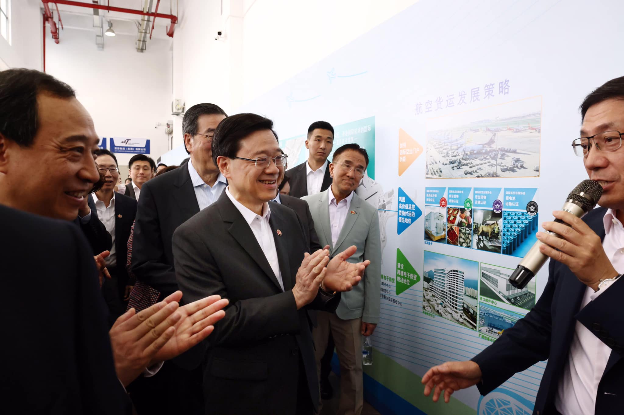 行政長官李家超率領的特區政府及立法會大灣區訪問團,今日(23日)展開第三日行程。李家超上午在社交網頁發文表示,今早到訪東莞—香港國際空港中心項目,考察這個全球首個直達機場空側的跨境海空聯運項目的運作情況。